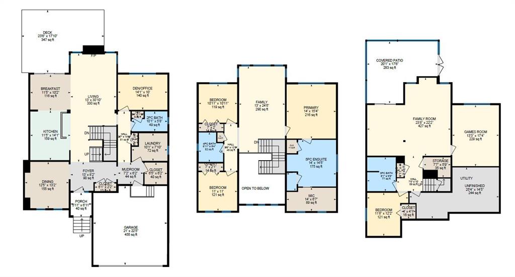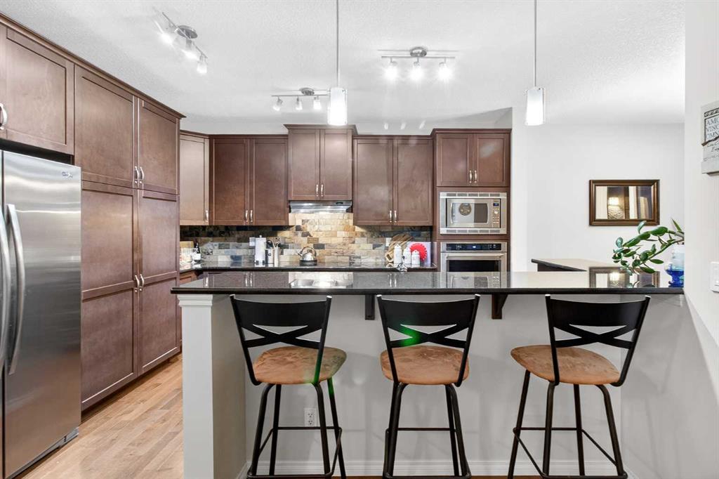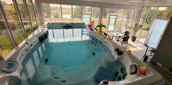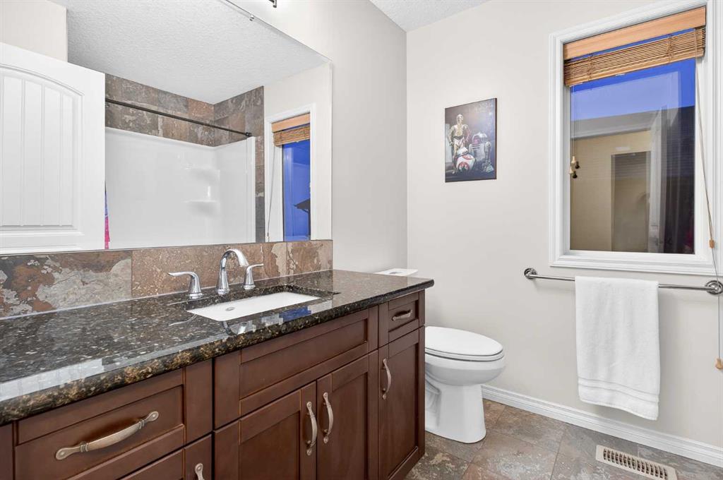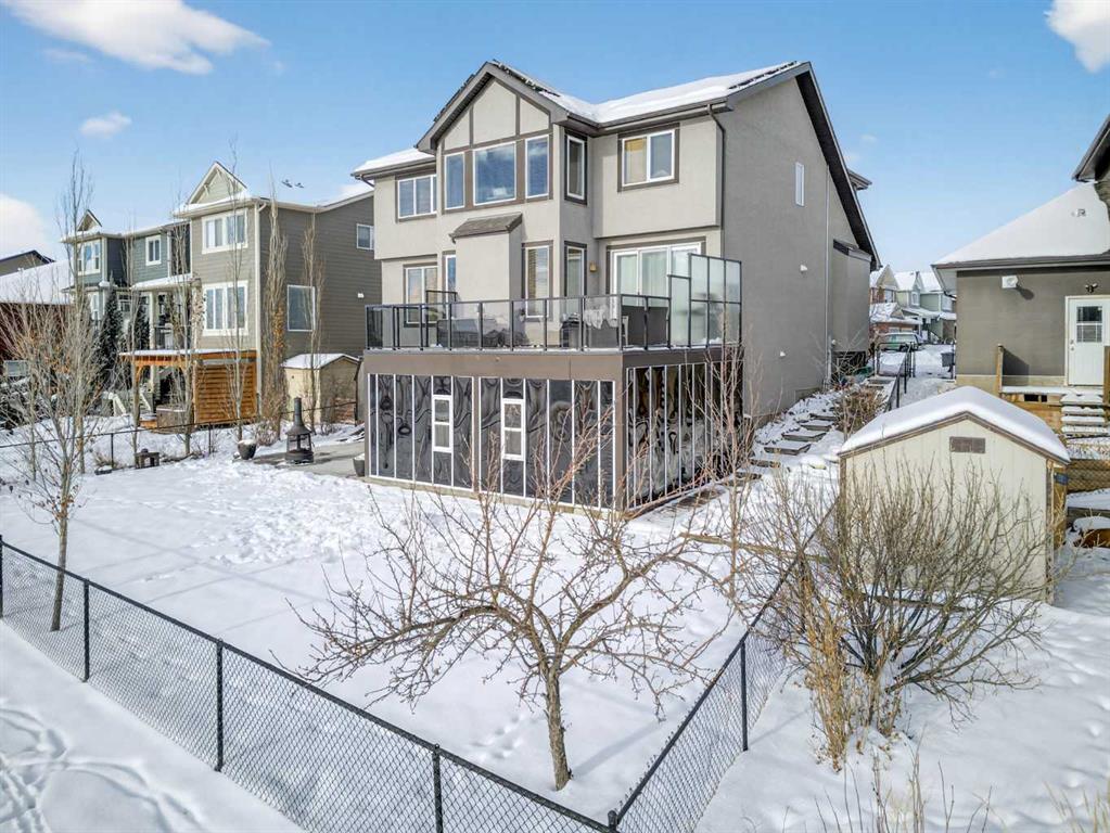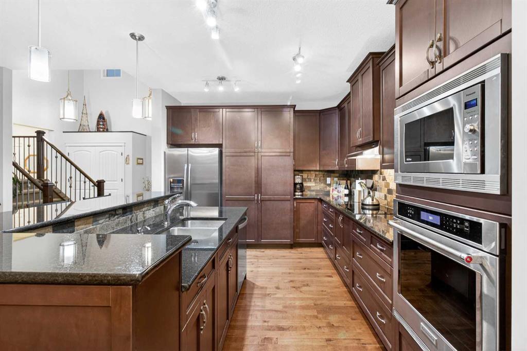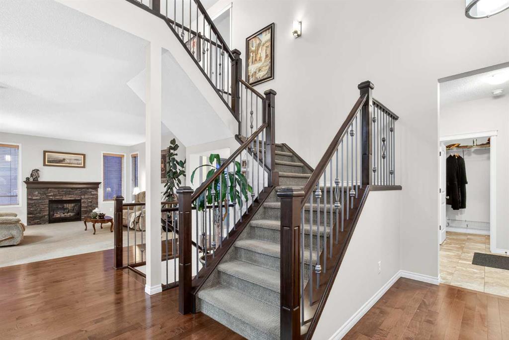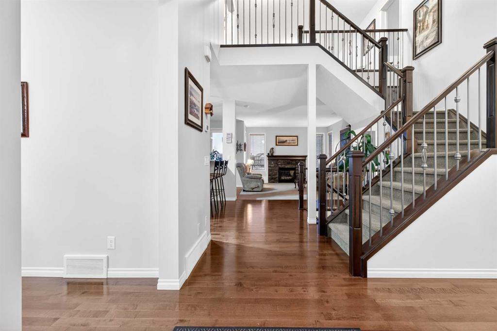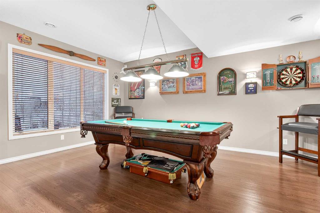 Custom built by Baywest Homes on a partial pie lot, this original-owner walkout home is ideally located in Air Ranch, backing south onto green space, pathways, and a pond. With over 4,200 sq ft of fully developed living space and approximately $185,000 in upgrades since 2020, this property offers exceptional space, functionality, and long-term value. The main floor features vaulted ceilings, hardwood flooring, and large windows that bring in abundant natural light and showcase the views. The open-concept kitchen includes custom cabinetry, granite countertops, stainless steel appliances, and a large island. The living room is anchored by a gas fireplace and flows into the dining nook and upper deck. A formal dining room, main-floor office, oversized laundry room, impressively huge second closet and mudroom complete this level. If you’re looking for main floor living options, the office and oversized bathroom beside could both be converted into a full bath and full bedroom. Up the elegant staircase, you will see a large bonus room overlooking the pond with mountain views to the west. The Primary Suite, aptly called “the west wing”, also with wonderful mountain views, sprawls along one side of the home with a massive 5-piece ensuite (that you can literally do cartwheels in!) and walk-in closet. Two other spacious bedrooms and full bathroom round out the upper level. The fully finished walkout basement with 9 foot ceilings provides additional living and entertaining space with a family/media area, flex area for gym equipment, games/billiards room, guest bedroom, full bathroom, and excellent storage. You will not only be impressed by the customized billiards room that is insulated for sound, but also by the extra space offered by the professionally built sunroom under the newly expanded deck. Here you will find oasis living and a Master Spas Challenger 15D swim spa to exercise or relax in year-round. The main media area in the basement was built with a Polk Audio surround sound system capacity. Out the back patio, the south-facing yard with automated irrigation system for the beautiful landscaping and fruit trees feels private and open at the same time, and backs onto green space and the pond beyond. Additional upgrades and features include 25 solar panels, programmable Trimlights, two high-efficiency furnaces, air conditioning, a Rheem Marathon hot water tank, updated mechanical components, and an oversized double attached garage. Screw piles have even been installed beneath the stamped concrete patio to accommodate the weight of a future outdoor fireplace if desired. This home in one of Okotoks’ most desirable communities has been lovingly thought out and cared for by the original owners and now is ready for new adventures!
