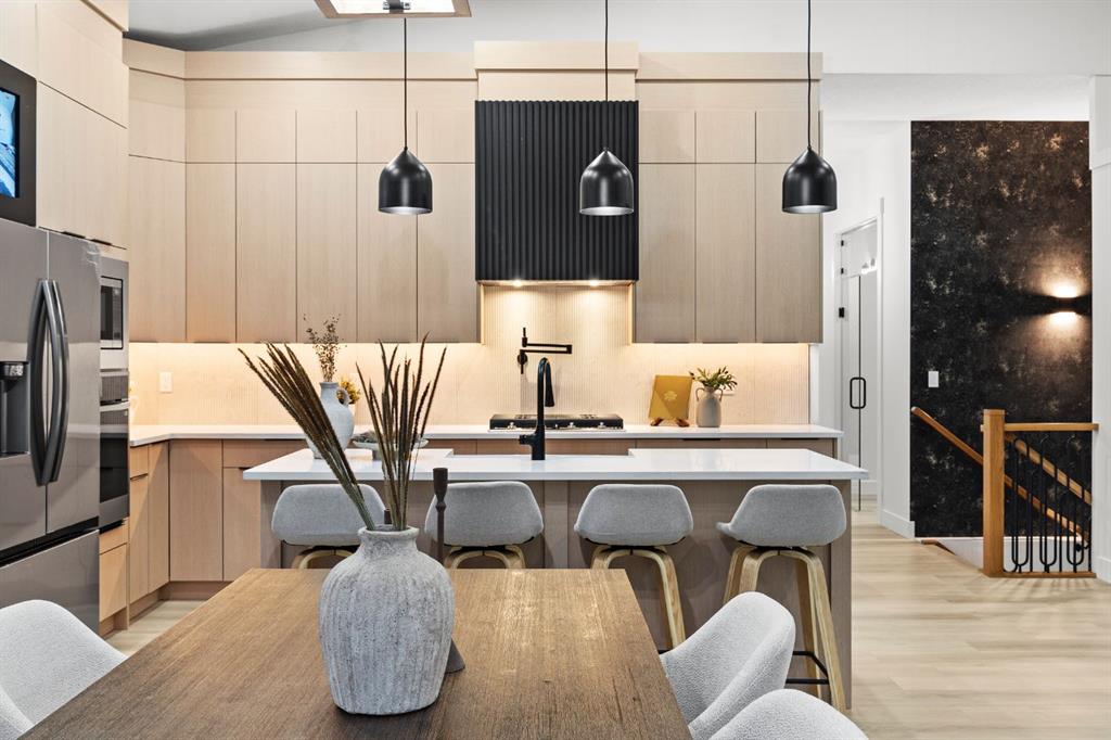 The chef-inspired kitchen is a true centrepiece, featuring custom white oak cabinetry, a classic farmhouse sink, and seamless integration with the living and dining spaces—ideal for both everyday living and entertaining. The living area is warmed by a fireplace with bespoke millwork, adding architectural depth and refined character.