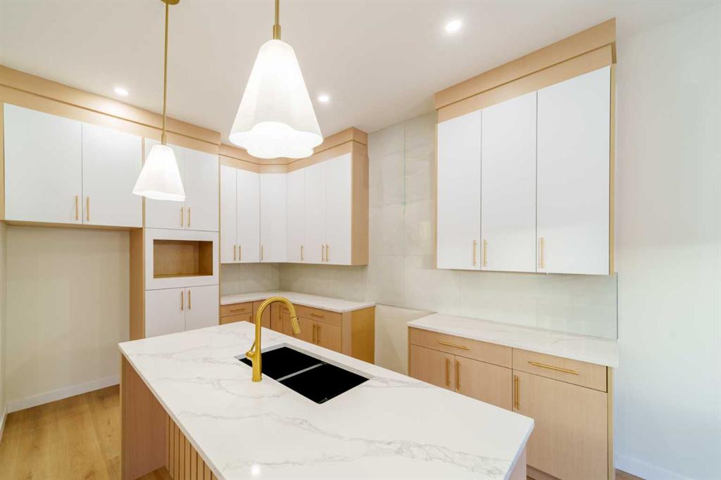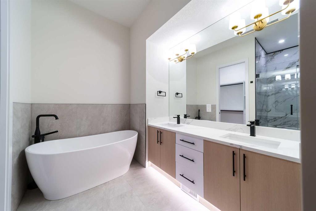 The primary bedroom is a great place to unwind. It comes with a five piece ensuite and a walk in closet. There’s also a second bedroom on the main floor, plus a full four piece bathroom and a laundry room with a sink.