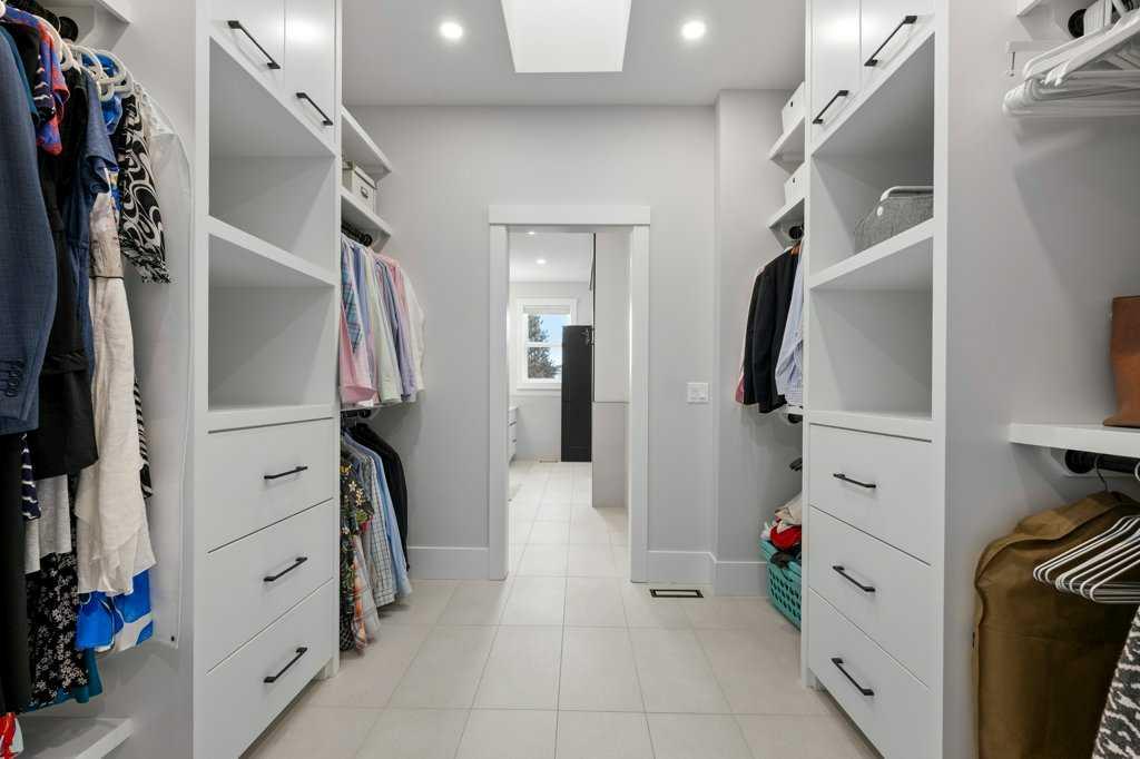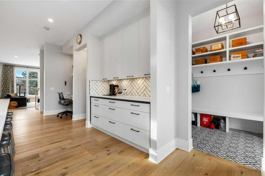 The thoughtfully designed kitchen is both stylish and practical featuring extended-height white cabinetry, soft-close mechanics, a massive quartz island, built-in oven and microwave, gas cooktop, French-door refrigerator, walk-in pantry with custom built-ins and an under counter built-in fridge/freezer with pullouts and a built-in desk area. The adjacent wall of windows is overlooking the backyard, with a conveniently located 2-piece powder room and walk in pantry with beverage center completes the main level.