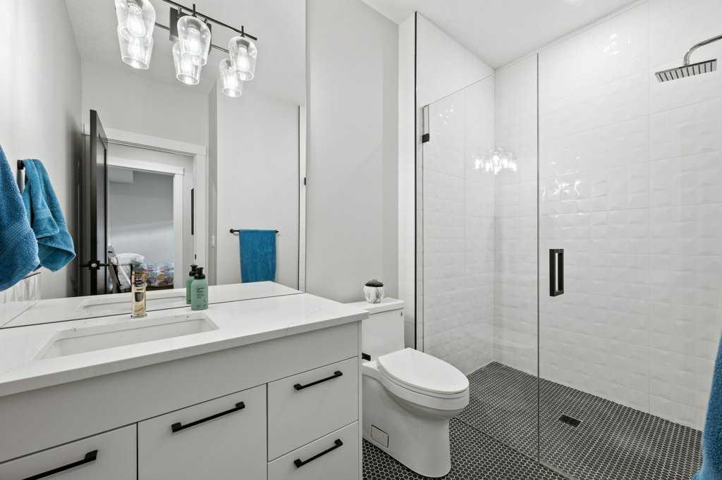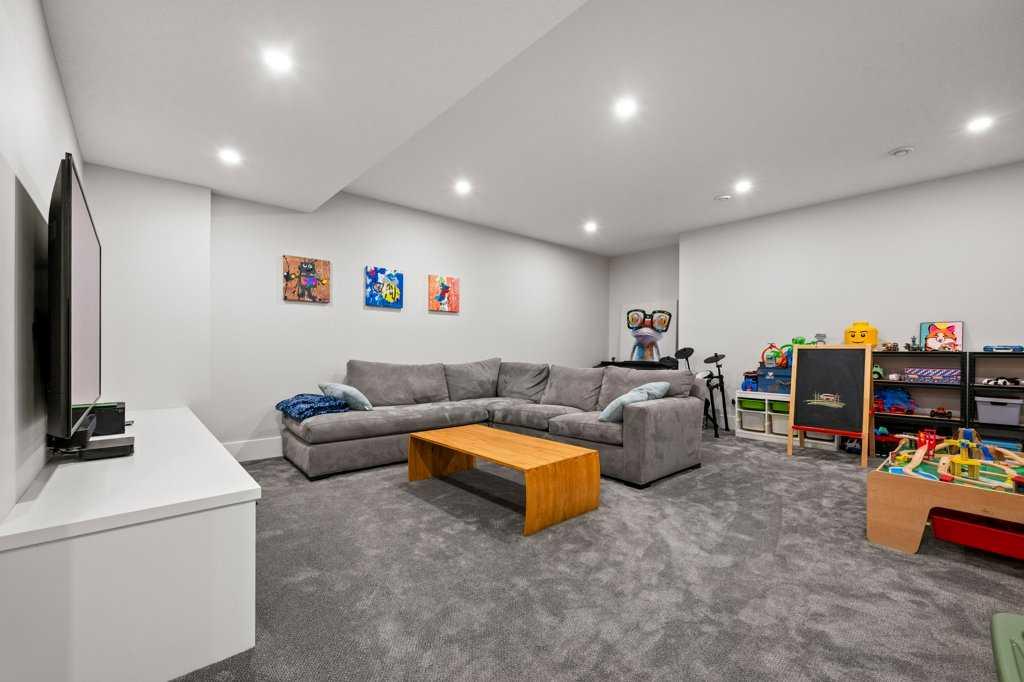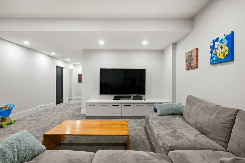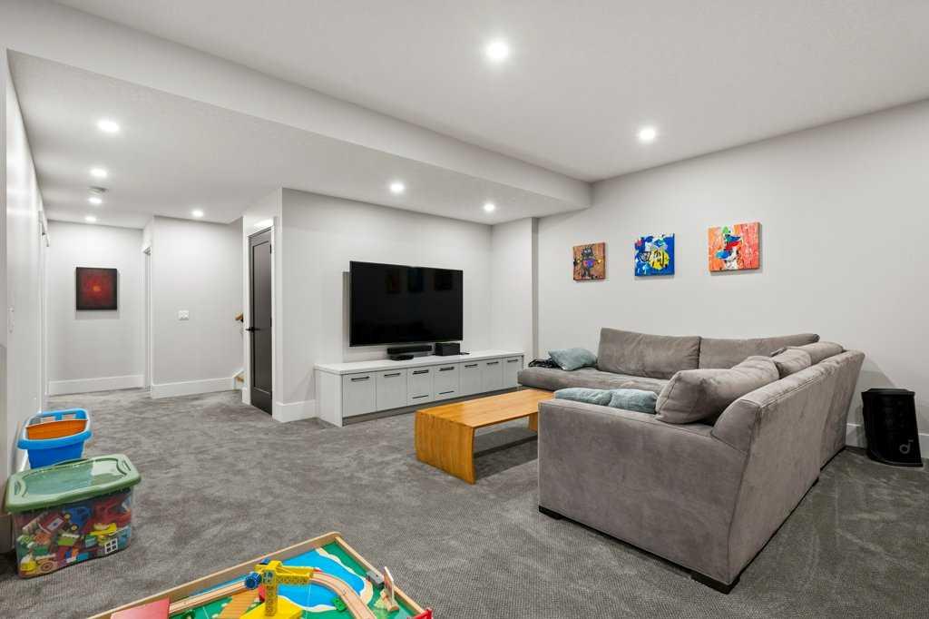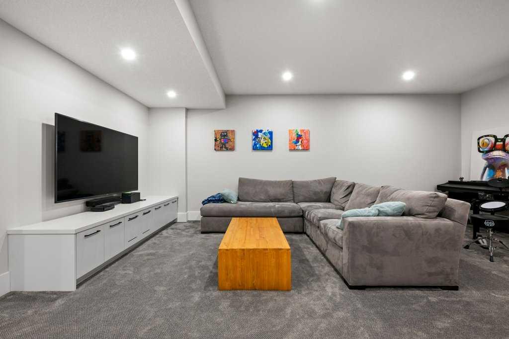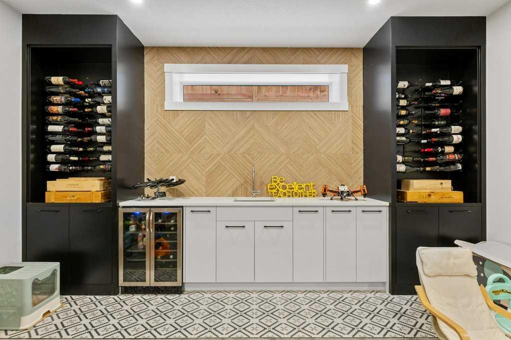 The fully developed basement expands the living space with a large recreation room, built-in media center, as well as a built in wet bar with added storage, a beverage and wine cooler, full-height wine wall and 120-bottle wine towers with quartz counters, a fourth bedroom, a stylish fourth bathroom with curbless walk-in shower, and additional storage.