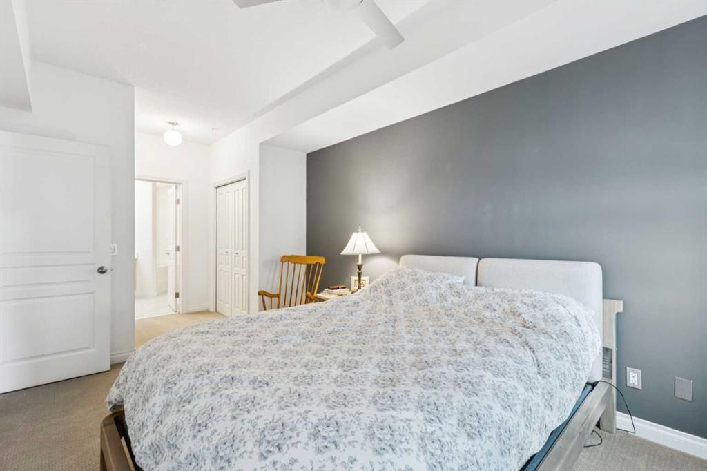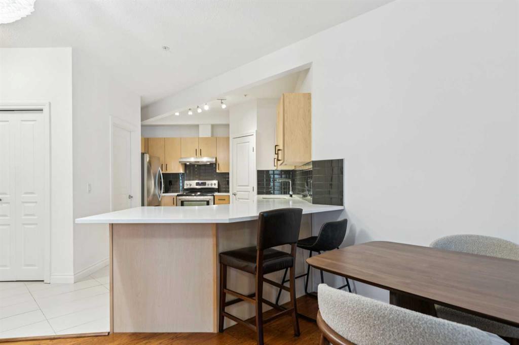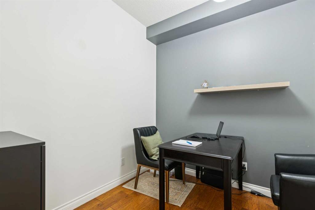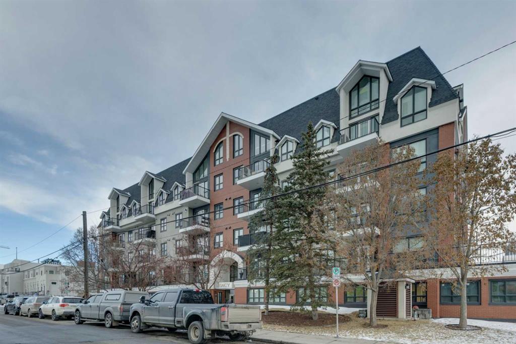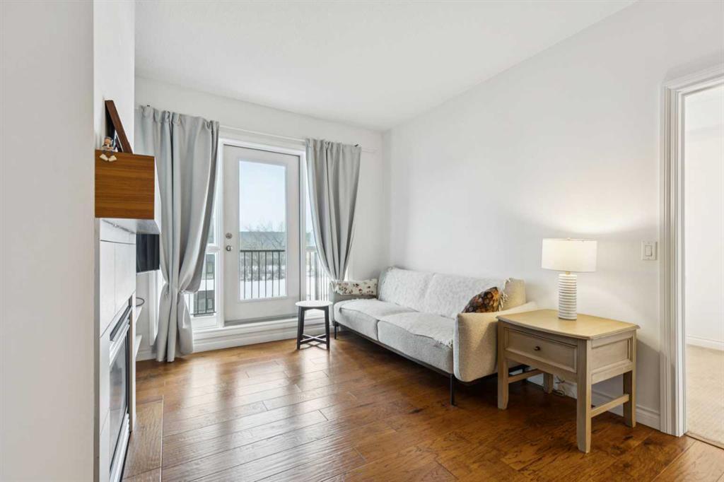Presented in pristine move-in-ready condition, this spacious 4th floor condo is perched to enjoy it's fantastic location at the Legacy building. This sunny south facing unit enjoys plenty of natural light pouring into the spacious 1038SqFt open plan, all being just steps to walking paths, downtown and the river. This spacious two bedroom two bathroom unit plus a den/office features nine foot ceilings, distressed wide plank hardwood, tile and warm carpeting in the bedrooms. There is a large living room with a cozy gas fireplace with designer built in surround. The expansive kitchen features plenty of cabinet storage, full tile back splash and loads of quartz counter space. The generous balcony has a convenient gas line to enjoy BBQ's, perfect for evening entertaining and unwinding. In-suite laundry, in floor heat, heated titled underground parking and assigned storage complete this fantastic unit in a beautiful, well run building. Gorgeous, functional designer style, excellent location and enduring value make this a must-own and stable investment. A great lifestyle near the Elbow River pathways, MNP Sports Centre and all the amenities of downtown only steps away. Welcome home!