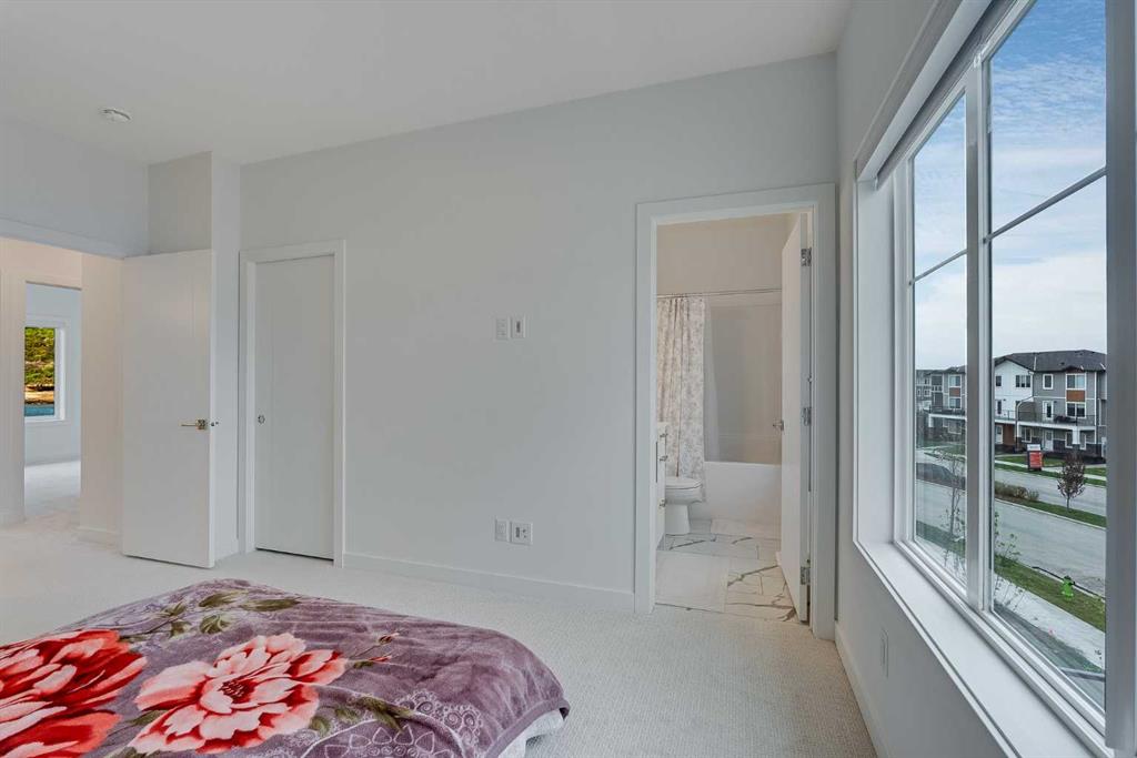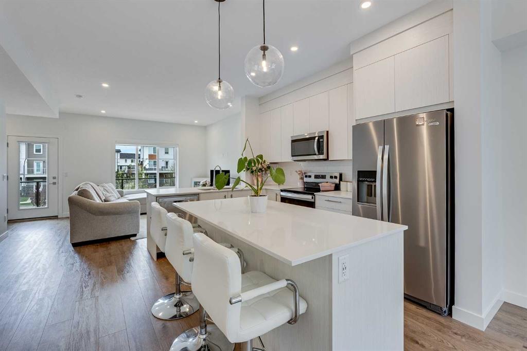 Welcome to 302, 6 Merganser Drive—PET FRIENDLY unit! Discover this stunning, 3-storey townhouse, perfectly located in the friendly neighbourhood of Chelsea in Chestermere. With 1600 SFT of beautifully designed living space, this home features 4 bedrooms and 2.5 baths, offering versatility and comfort for all households. The 4th bedroom, located on the main floor, is perfect as a home office, gym, or yoga room, making it ideal for gig workers or anyone seeking a dedicated workspace. A gorgeous kitchen showcasing quartz countertops, sleek stainless steel appliances, a double-door pantry with ample shelving, modern light fixtures, and an island with storage that accommodates 3-4 bar stools. The open-concept layout seamlessly connects the kitchen to the dining area, which fits a table for 8, and the living space, all bathed in natural light. Step out onto the huge south-facing balcony to enjoy the scenery, host barbecues with friends, or relax with your morning coffee or an evening glass of wine. Upstairs, you’ll find two generously sized bedrooms with a shared bath, along with a spacious primary retreat that easily fits a king bed. This private sanctuary boasts stunning mountain views, a luxurious ensuite, and a modest walk-in closet. Convenience meets practicality with upstairs laundry. This home is complete with thoughtful details, including luxury vinyl plank blond flooring, modern light fixtures, and a fully insulated & HEATED double-car attached garage. The garage also includes hidden storage for skis, outdoor toys, or christmas decorations plus a convenient spigot for washing vehicles or gear. Parking is a breeze with additional space in front of the unit. Located in a pet-friendly condominium community with low condo fees, this property offers exceptional access to Stoney Trail, Costco, golf courses, parks, and top-rated schools. Whether you’re a first-time homebuyer, a growing family, or someone looking to downsize, this townhouse provides the perfect blend of comfort, functionality, and location. Book your showing today!