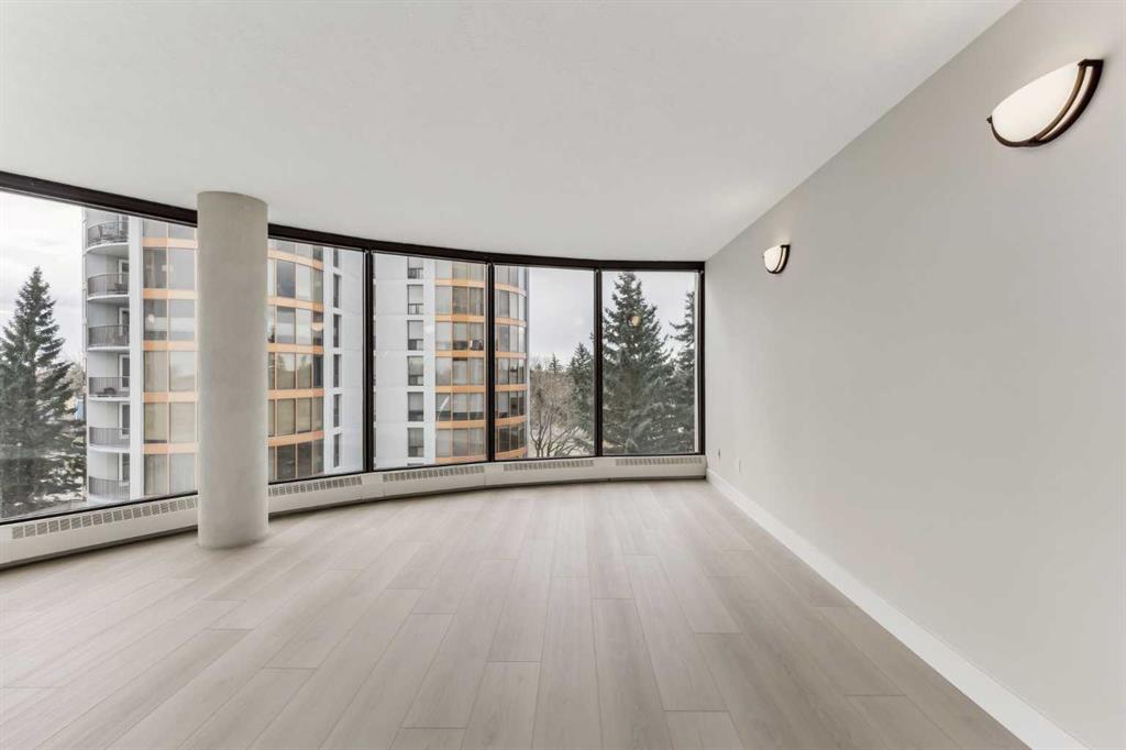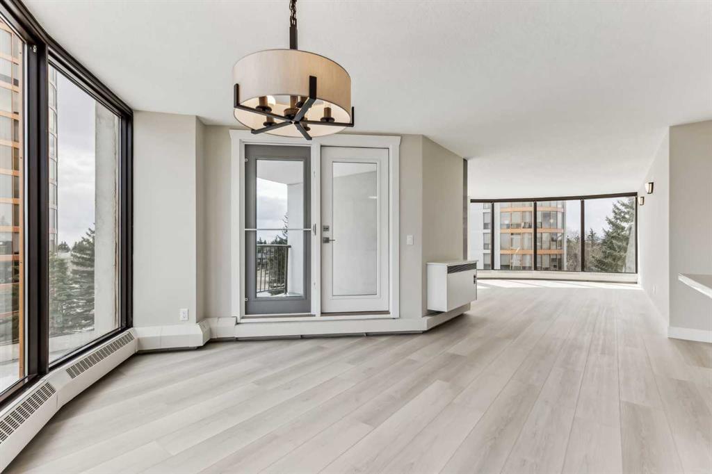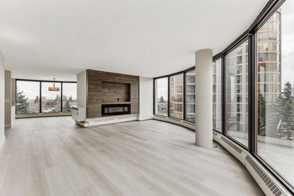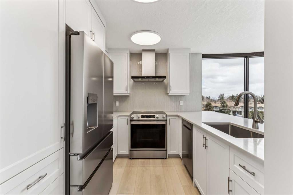 Impressive adult living 18+ COMPLETELY RENOVATED top to bottom 5th floor condo with exceptional workmanship and finishing in the exclusive Odyssey Towers of Coach Hill, with only four units per floor. Enjoy panoramic views from the floor-to-ceiling curved windows in this beautifully appointed 1178sq ft, bright and open floor plan. The condo features a CUSTOM KITCHEN, two bedrooms, an updated bathroom with a walk-in shower, in-suite laundry with a sink, a large in-suite storage room, and a generous-sized balcony. Renovations include a custom kitchen, vanities with quartz throughout, a complete stainless steel appliance package, air conditioning, a stunning feature wall with a built-in electric fireplace, new flooring throughout (luxury vinyl plank, and carpet), a new laundry sink, a wall-to-wall walk-in shower, knockdown textured ceilings throughout, upgraded plumbing and electrical, and much more. There are two parking stalls—one secured underground and a second convenient outdoor stall, as well as ample visitor parking. Amenities include a personalized building manager, a guest suite in each building for overnight guests, a sauna/steam room, a resident's club, beautifully manicured green spaces and gardens, and a very well-managed and maintained complex. Enjoy maintenance-free living in one of Calgary's premier adult living communities! Conveniently located within minutes to the bus stop/direct line to West Side LRT Station, Ambrose University, Rundle College, West Side Rec Center, parks, pathways, restaurants, and less than fifteen minutes to downtown. Quick possession and move-in ready!