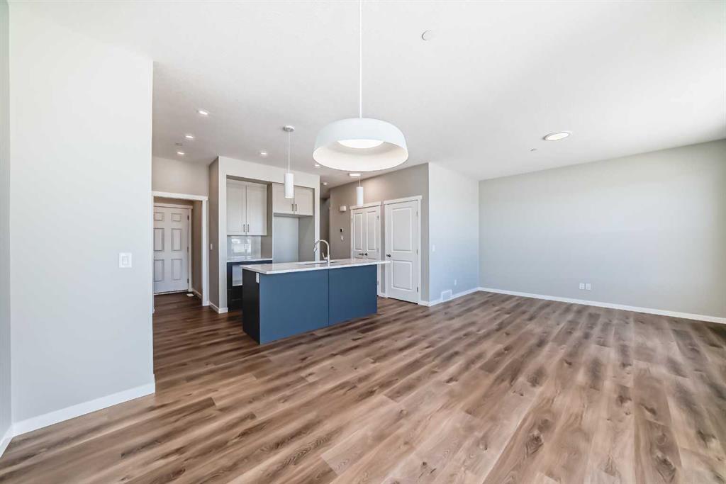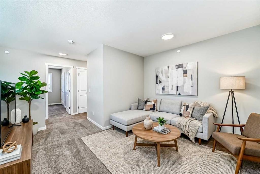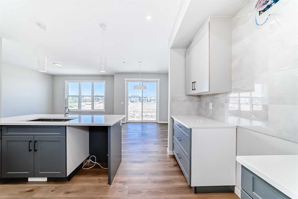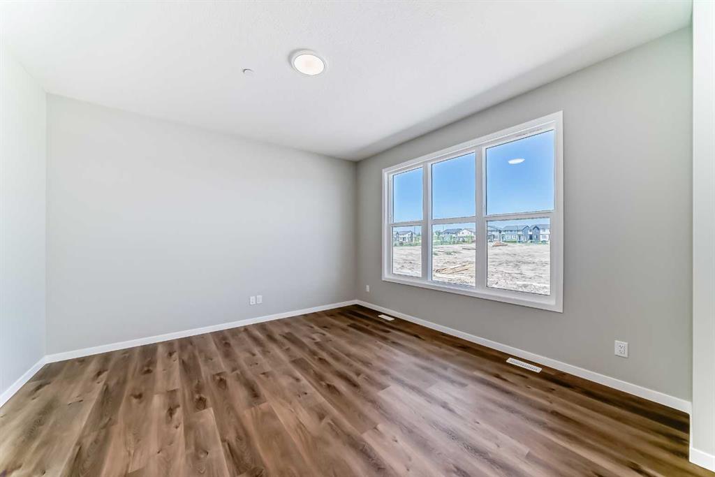 Welcome to the exquisite "Carisa" floor plan, where nearly 1,700 SqFt of thoughtfully designed space combines modern elegance with unmatched functionality. This home’s layout is tailored for both comfort and style, creating the perfect setting for family living and entertaining. As you step inside, you’ll be greeted by the warmth and durability of vinyl plank flooring that flows seamlessly throughout the main level, accentuating the modern finishes and striking architectural details. Natural light pours in through the back wall of windows, infusing the open-concept living areas with an inviting ambiance. Dual sliding patio doors extend your living space to the expansive backyard, ready for your personal touch to create the ultimate indoor-outdoor oasis. At the heart of the home, the kitchen is a chef’s dream. Featuring two-tone cabinetry, sleek quartz countertops, and a stylish tile backsplash that wraps elegantly around a chimney-style hood fan, this kitchen is as functional as it is beautiful. Stainless steel appliances and a thoughtfully positioned mudroom with direct kitchen access ensure that even grocery days are effortless. A cozy dining nook and a spacious living room, are perfectly positioned to enjoy the home’s abundant natural light. The smartly designed pocket office offers the perfect work-from-home setup or a dedicated homework space for the kids. Upstairs, a versatile bonus room serves as the ideal family retreat, separating the serene primary suite from the secondary bedrooms. The primary suite is a tranquil haven, complete with a luxurious 4-piece ensuite featuring an oversized shower and ample space to unwind. The two additional bedrooms are generously sized, making them ideal for children or guests. With an upstairs laundry room and a stylish 4-piece bathroom, convenience is woven into every detail of this home. **This home also comes complete with full front and backyard landscaping, including sod, mulch on the side yards, and trees/shrubs in the front as per community guidelines. Located in the vibrant southeast Calgary community of Hotchkiss, this home offers more than just a beautiful living space. Residents enjoy stunning mountain views, 51 acres of park space, interconnected walking paths, and a central wetland. Designed with families in mind, Hotchkiss is a community where you can truly belong and thrive.