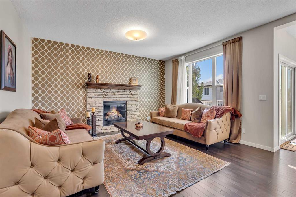 The main floor makes a grand impression with soaring ceilings, rich hardwood, and custom drapery. At its heart is a chef-inspired kitchen featuring granite surfaces, a gas range, and a spacious island that flows into a living room anchored by a striking stone and oak fireplace. Upstairs, the primary retreat offers a spa-like 5-piece ensuite, accompanied by two additional bedrooms and a bright, northwest-facing bonus room.
