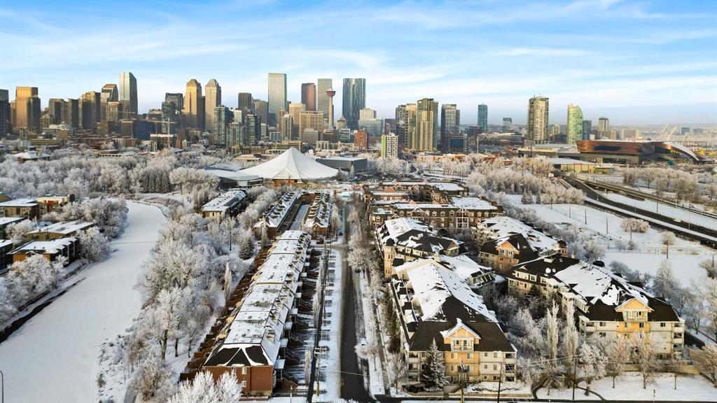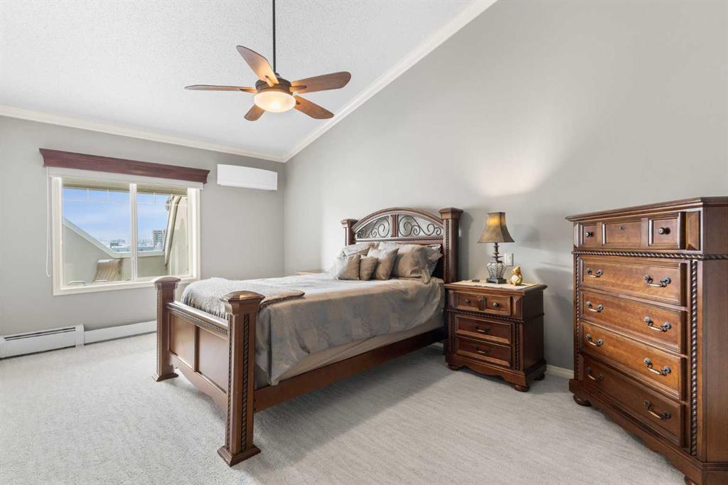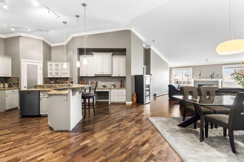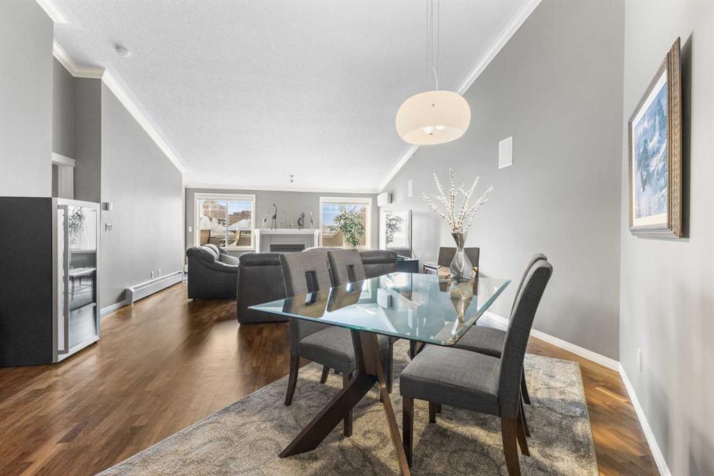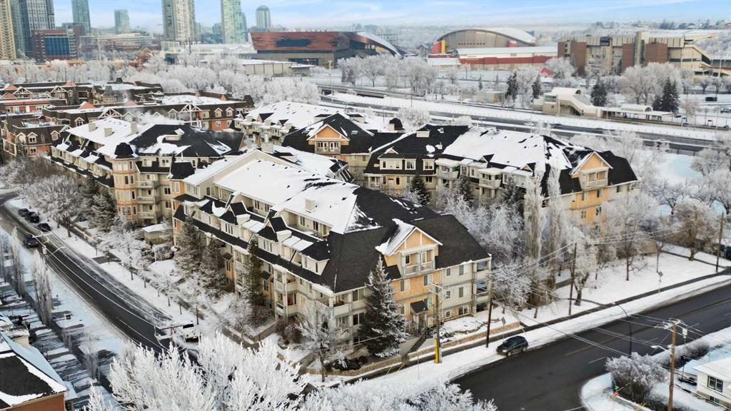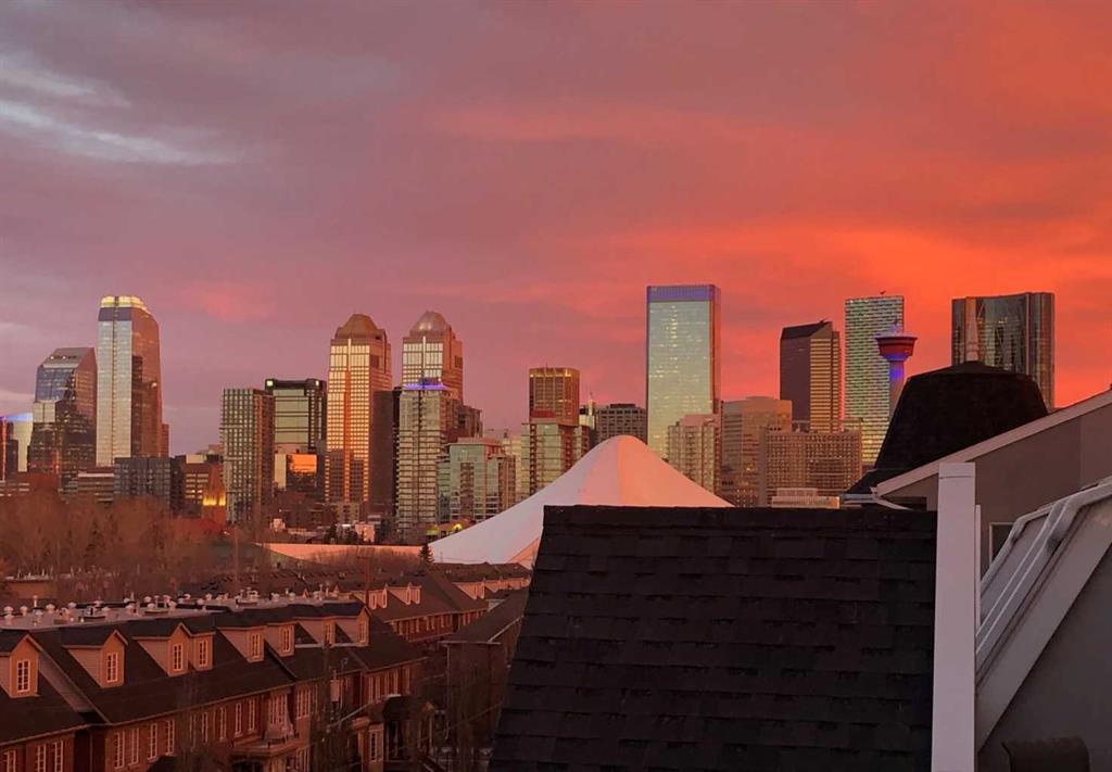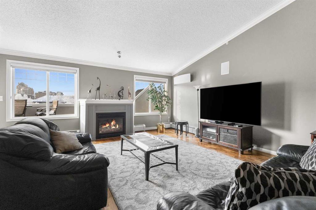 Expansive Top Floor End Unit with City and Downtown Views! This beautifully maintained 2-bedroom, 2.5-bath top floor end unit offers stunning city and downtown vistas, reflecting pride of ownership in every detail. Its open concept design showcases elegant hardwood flooring, vaulted ceilings, and crown moulding, with abundant natural light illuminating the space. The kitchen is tastefully appointed with granite countertops, an island/eating bar, and generous storage solutions including a walk-in pantry. Recent upgrades feature newer appliances, highlighted by a high-end Miele dishwasher. The adjacent dining area provides ample room for entertaining family and friends. The welcoming living room, complete with a feature fireplace, serves as an ideal gathering space for relaxation and socializing. The expansive primary bedroom is enhanced by built-in cabinetry and a custom walk-in closet crafted by California Closets. The private five-piece ensuite features dual sinks, a luxurious soaker tub, and a rejuvenating steam shower. Perfect for use as a home office, the second bedroom includes balcony access, two Murphy beds (one queen, one twin), a walk-in closet by California Closets, and its own private four-piece ensuite. Other notable features include in-suite laundry with additional storage, updated flooring installed in 2016, a Daikin air conditioning unit added in fall 2020, front entrance closet designed by California Closets, spacious deck offering panoramic city and downtown views, and three parking stalls—one titled, two leased—plus a dedicated storage space. This residence is perfectly situated just steps away from the Erlton-Stampede C-train station, the picturesque Elbow River pathways and close to several amenities, including Stampede Park, MNP Community & Sport Centre, the serene Reader Rock Gardens, schools, shopping, and is within walking distance to downtown.