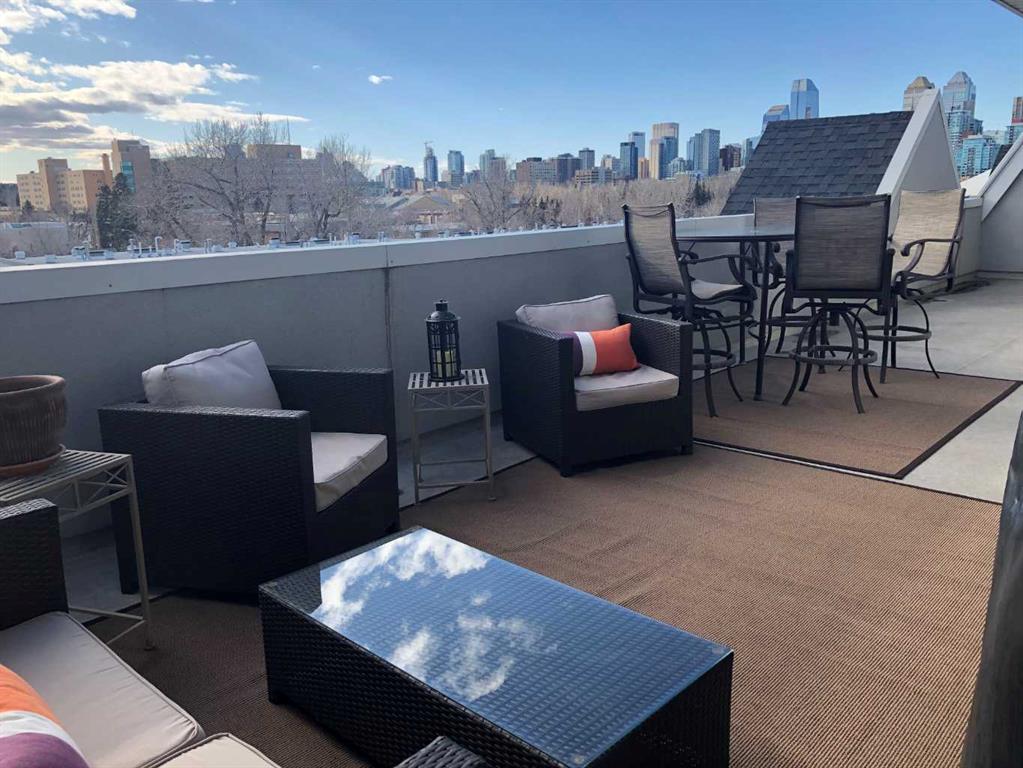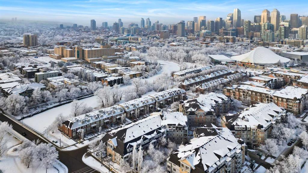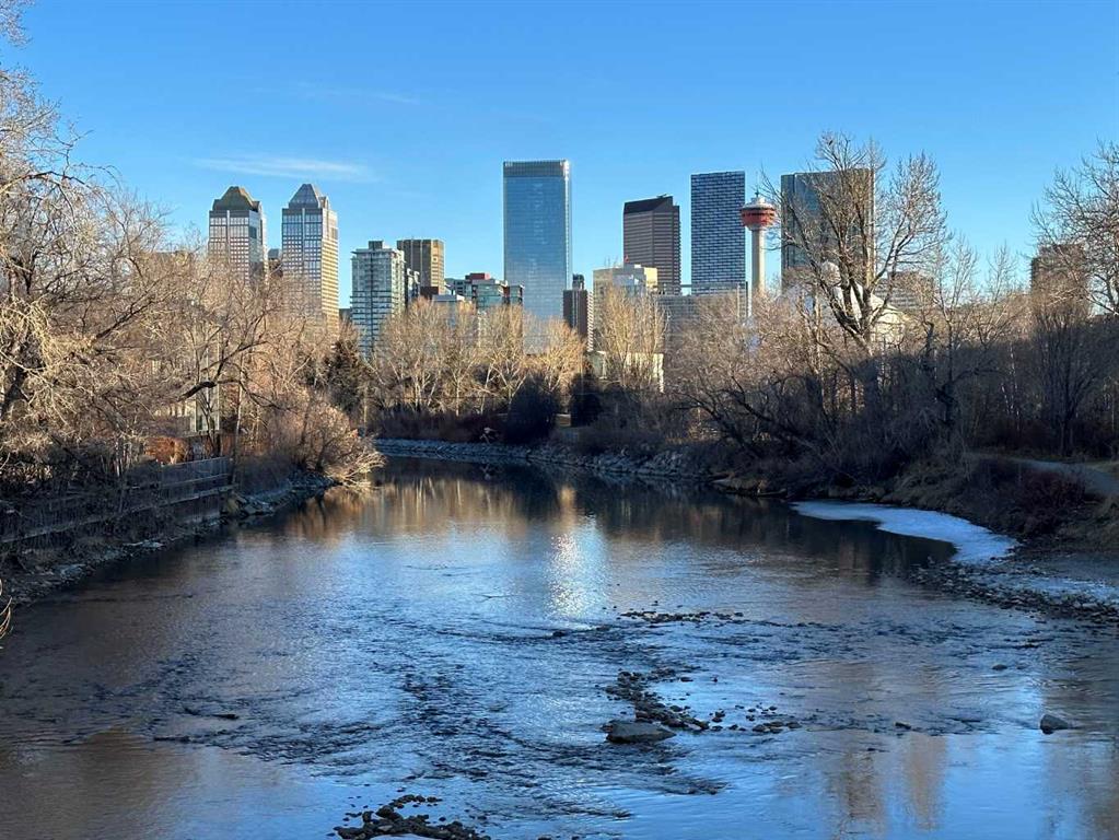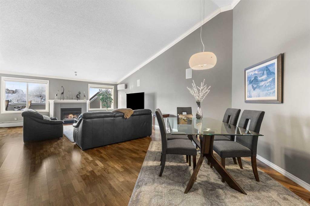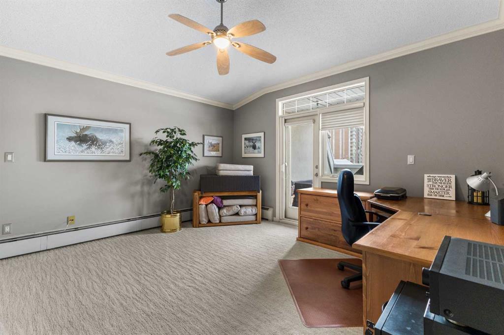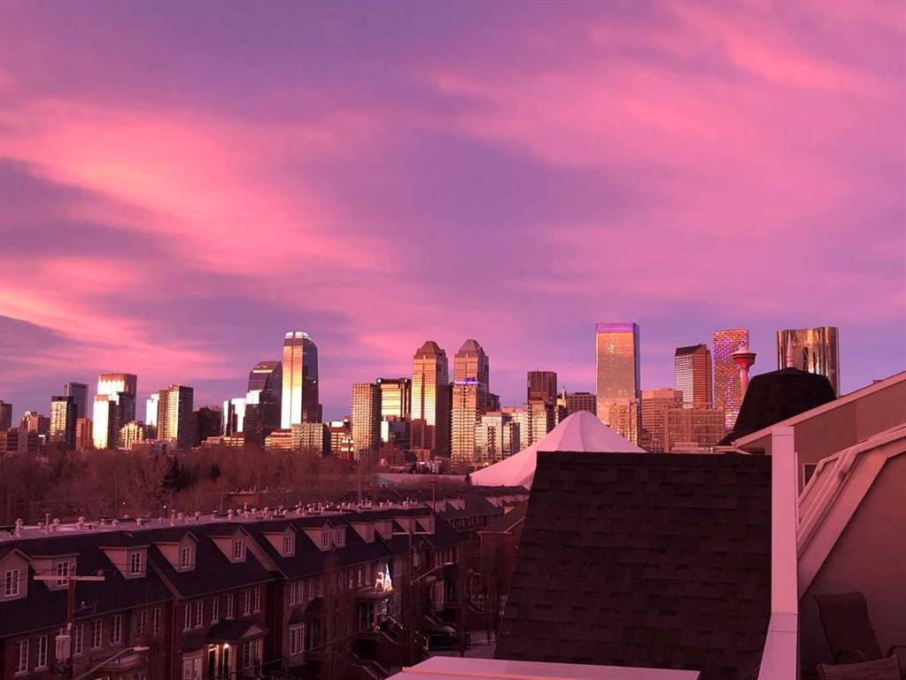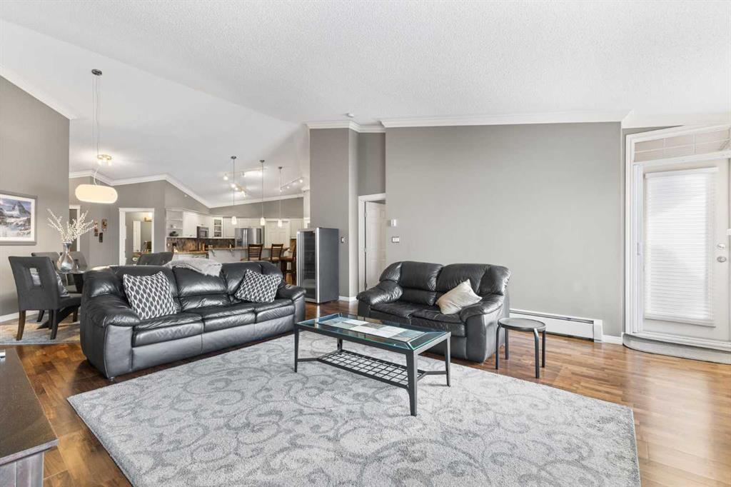Expansive Top Floor End Unit with City and Downtown Views! This beautifully maintained 2-bedroom, 2.5-bath top floor end unit offers stunning city and downtown vistas, reflecting pride of ownership in every detail. Its open concept design showcases elegant hardwood flooring, vaulted ceilings, and crown moulding, with abundant natural light illuminating the space. The kitchen is tastefully appointed with granite countertops, an island/eating bar, and generous storage solutions including a walk-in pantry. Recent upgrades feature newer appliances, highlighted by a high-end Miele dishwasher. The adjacent dining area provides ample room for entertaining family and friends. The welcoming living room, complete with a feature fireplace, serves as an ideal gathering space for relaxation and socializing. The expansive primary bedroom is enhanced by built-in cabinetry and a custom walk-in closet crafted by California Closets. The private five-piece ensuite features dual sinks, a luxurious soaker tub, and a rejuvenating steam shower. Perfect for use as a home office, the second bedroom includes balcony access, two Murphy beds (one queen, one twin), a walk-in closet by California Closets, and its own private four-piece ensuite. Other notable features include in-suite laundry with additional storage, updated flooring installed in 2016, a Daikin air conditioning unit added in fall 2020, front entrance closet designed by California Closets, spacious deck offering panoramic city and downtown views, and three parking stalls—one titled, two leased—plus a dedicated storage space. This residence is perfectly situated just steps away from the Erlton-Stampede C-train station, the picturesque Elbow River pathways and close to several amenities, including Stampede Park, MNP Community & Sport Centre, the serene Reader Rock Gardens, schools, shopping, and is within walking distance to downtown.