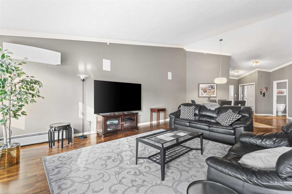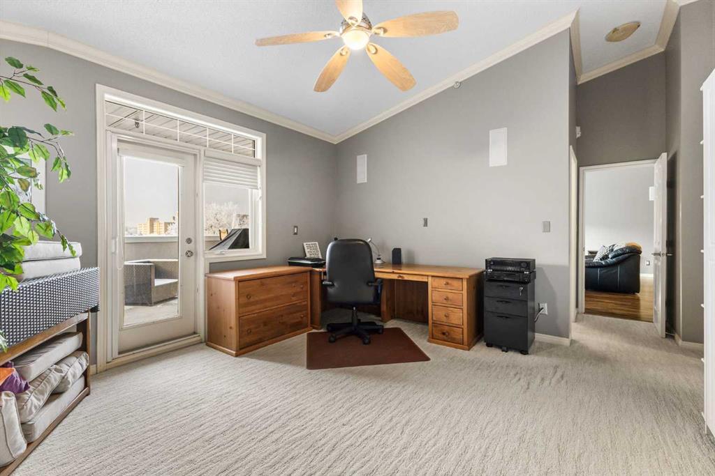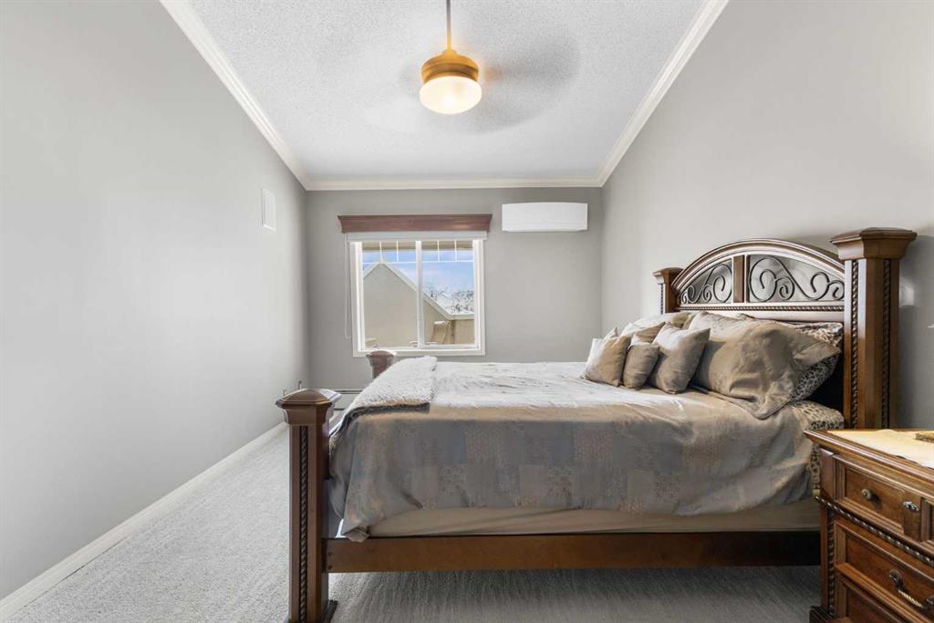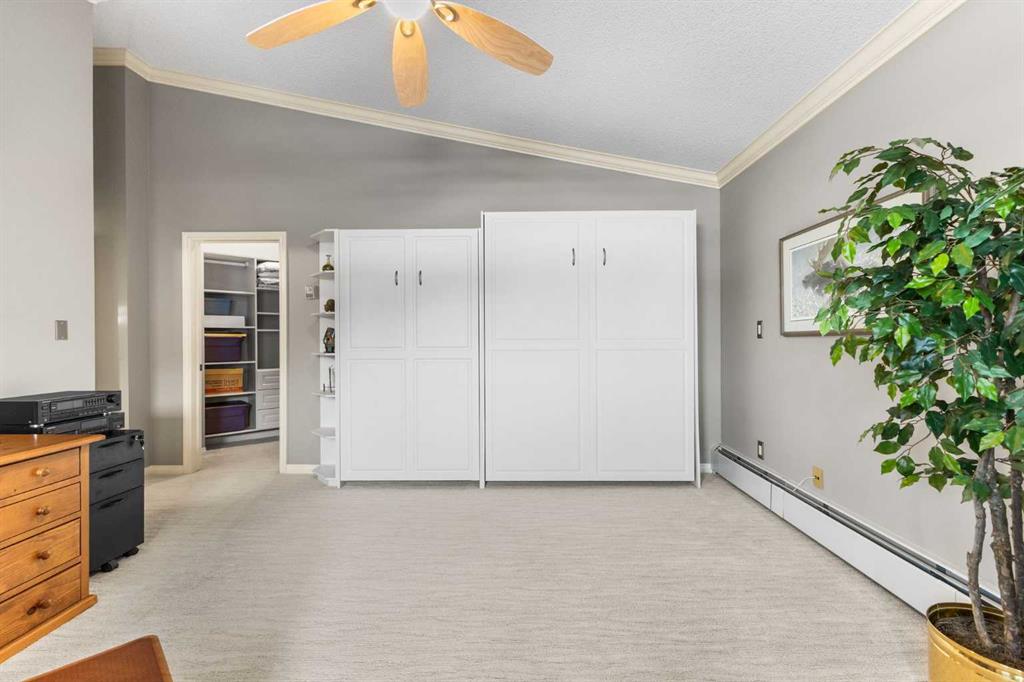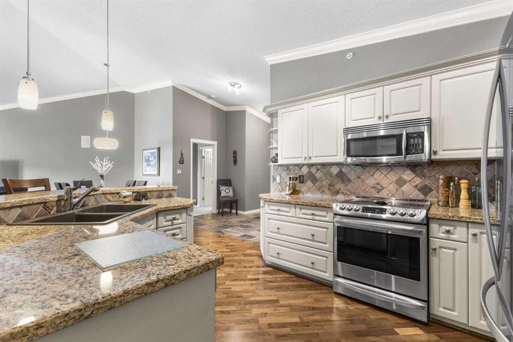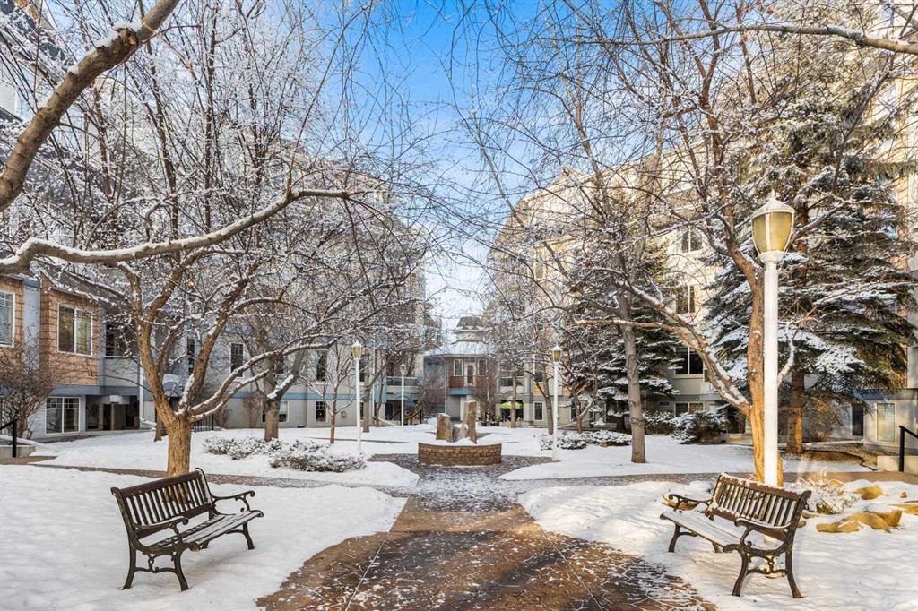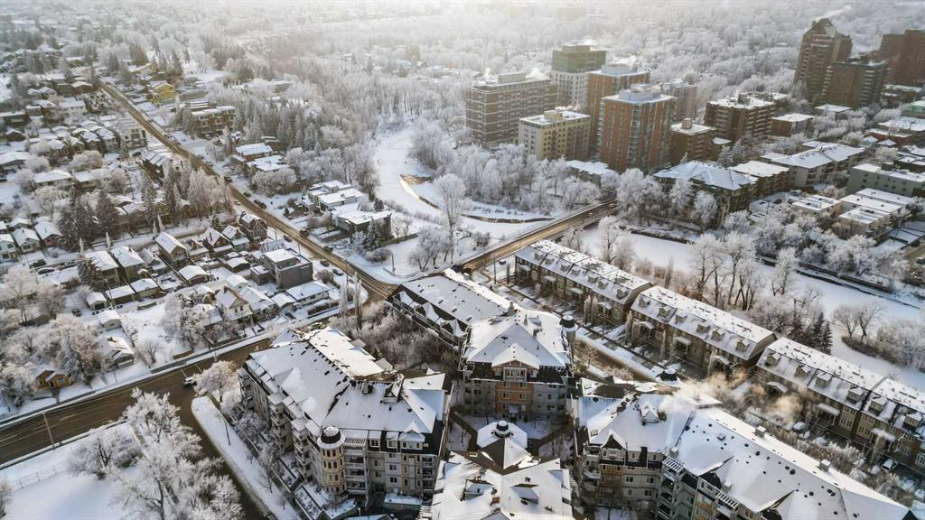 Expansive Top Floor End Unit with City and Downtown Views! This beautifully maintained 2-bedroom, 2.5-bath top floor end unit offers stunning city and downtown vistas, reflecting pride of ownership in every detail. Its open concept design showcases elegant hardwood flooring, vaulted ceilings, and crown moulding, with abundant natural light illuminating the space. The kitchen is tastefully appointed with granite countertops, an island/eating bar, and generous storage solutions including a walk-in pantry. Recent upgrades feature newer appliances, highlighted by a high-end Miele dishwasher. The adjacent dining area provides ample room for entertaining family and friends. The welcoming living room, complete with a feature fireplace, serves as an ideal gathering space for relaxation and socializing. The expansive primary bedroom is enhanced by built-in cabinetry and a custom walk-in closet crafted by California Closets. The private five-piece ensuite features dual sinks, a luxurious soaker tub, and a rejuvenating steam shower. Perfect for use as a home office, the second bedroom includes balcony access, two Murphy beds (one queen, one twin), a walk-in closet by California Closets, and its own private four-piece ensuite. Other notable features include in-suite laundry with additional storage, updated flooring installed in 2016, a Daikin air conditioning unit added in fall 2020, front entrance closet designed by California Closets, spacious deck offering panoramic city and downtown views, and three parking stalls—one titled, two leased—plus a dedicated storage space. This residence is perfectly situated just steps away from the Erlton-Stampede C-train station, the picturesque Elbow River pathways and close to several amenities, including Stampede Park, MNP Community & Sport Centre, the serene Reader Rock Gardens, schools, shopping, and is within walking distance to downtown.
