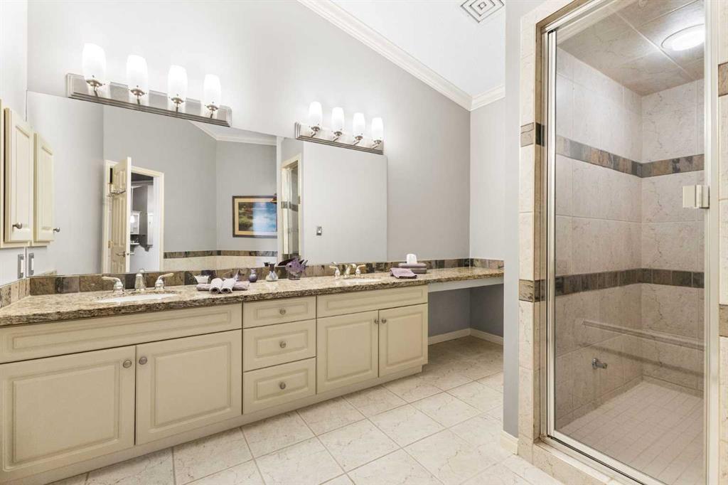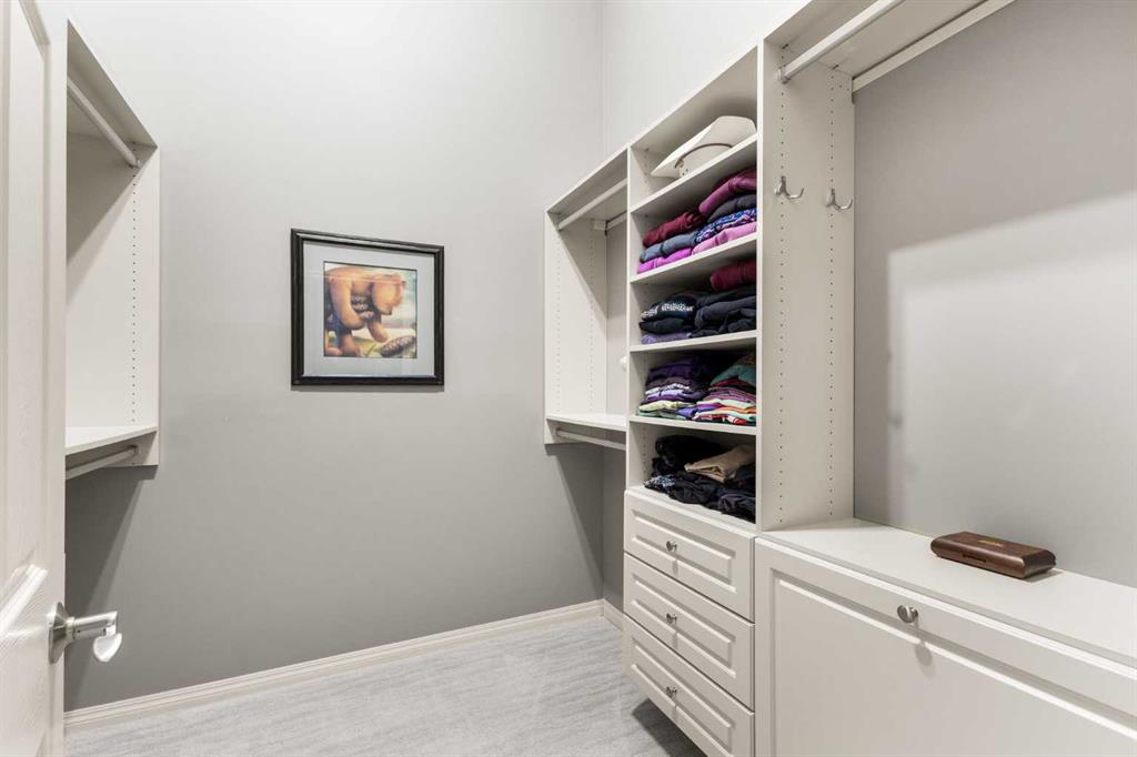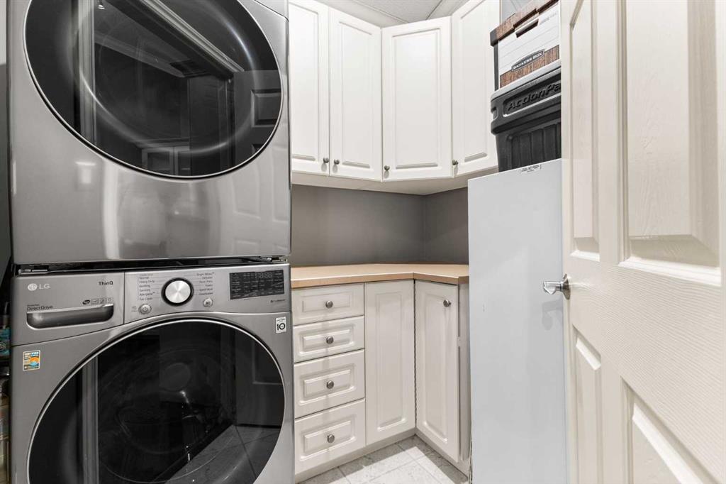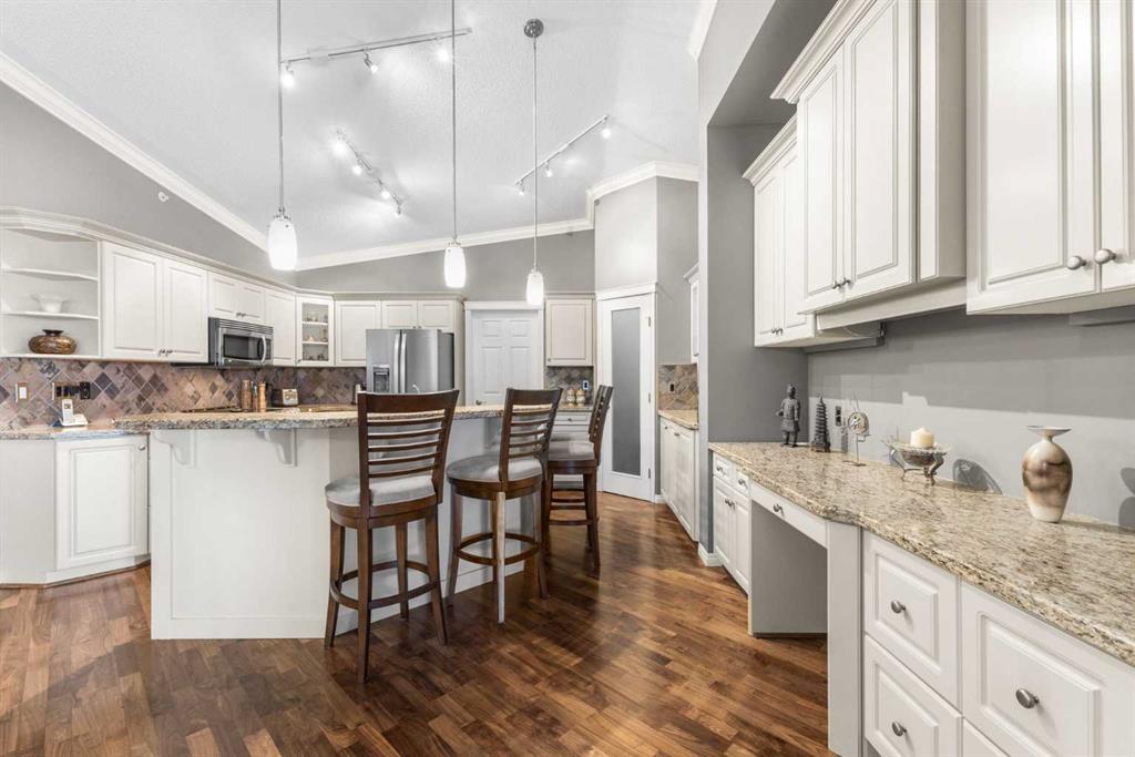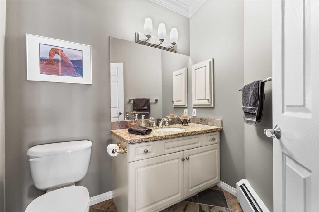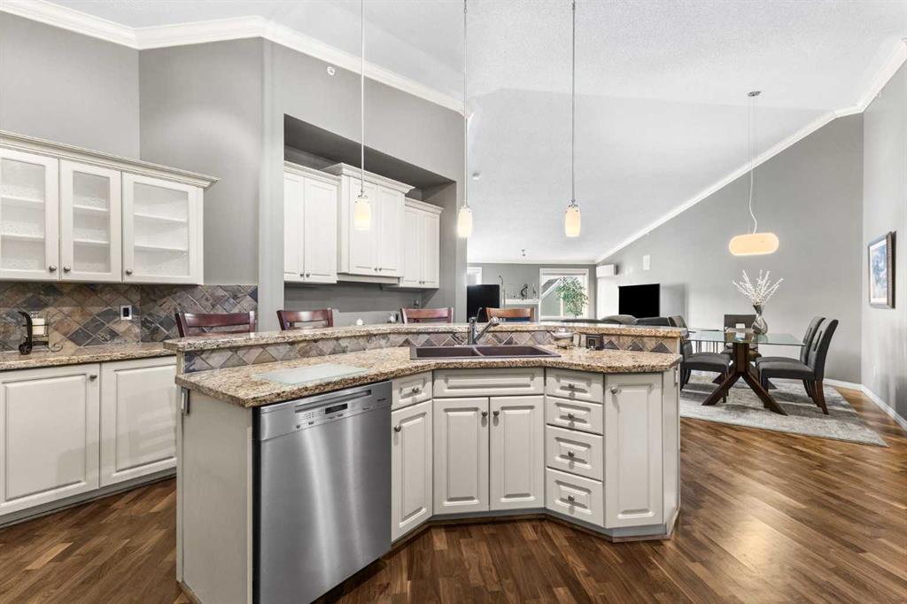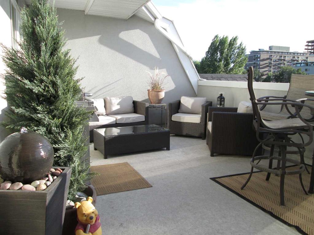 Expansive Top Floor End Unit with City and Downtown Views! This beautifully maintained 2-bedroom, 2.5-bath top floor end unit offers stunning city and downtown vistas, reflecting pride of ownership in every detail. Its open concept design showcases elegant hardwood flooring, vaulted ceilings, and crown moulding, with abundant natural light illuminating the space. The kitchen is tastefully appointed with granite countertops, an island/eating bar, and generous storage solutions including a walk-in pantry. Recent upgrades feature newer appliances, highlighted by a high-end Miele dishwasher. The adjacent dining area provides ample room for entertaining family and friends. The welcoming living room, complete with a feature fireplace, serves as an ideal gathering space for relaxation and socializing. The expansive primary bedroom is enhanced by built-in cabinetry and a custom walk-in closet crafted by California Closets. The private five-piece ensuite features dual sinks, a luxurious soaker tub, and a rejuvenating steam shower. Perfect for use as a home office, the second bedroom includes balcony access, two Murphy beds (one queen, one twin), a walk-in closet by California Closets, and its own private four-piece ensuite. Other notable features include in-suite laundry with additional storage, updated flooring installed in 2016, a Daikin air conditioning unit added in fall 2020, front entrance closet designed by California Closets, spacious deck offering panoramic city and downtown views, and three parking stalls—one titled, two leased—plus a dedicated storage space. This residence is perfectly situated just steps away from the Erlton-Stampede C-train station, the picturesque Elbow River pathways and close to several amenities, including Stampede Park, MNP Community & Sport Centre, the serene Reader Rock Gardens, schools, shopping, and is within walking distance to downtown.