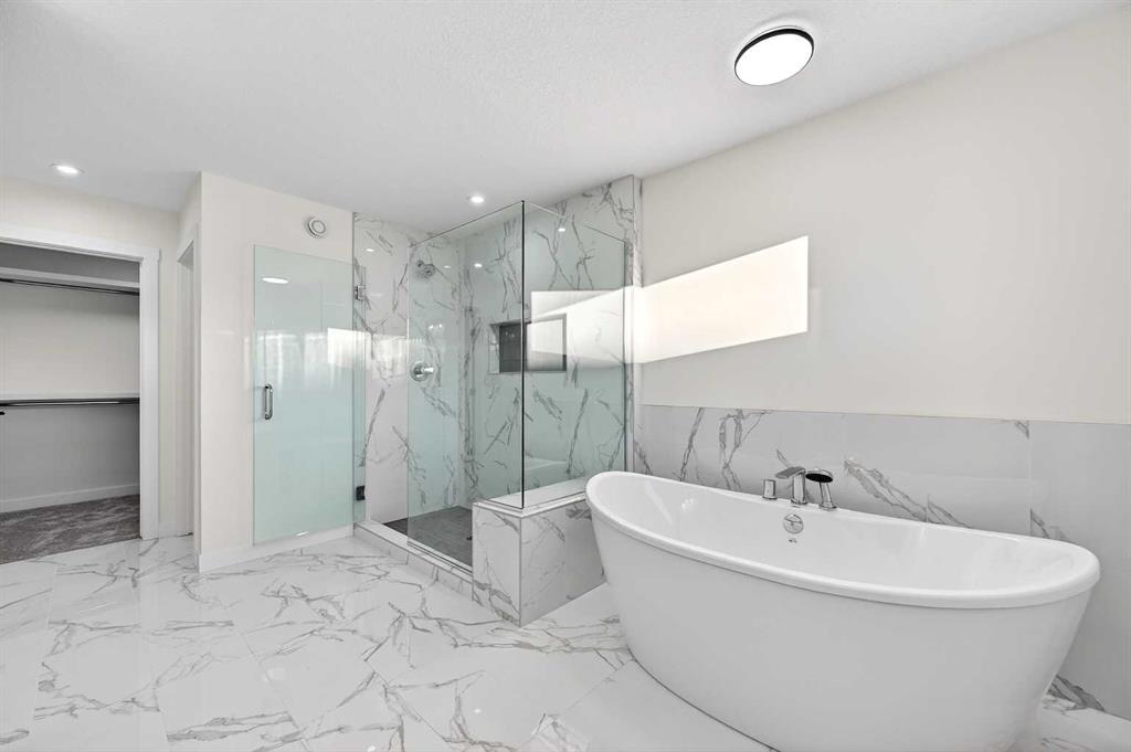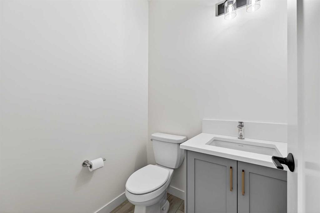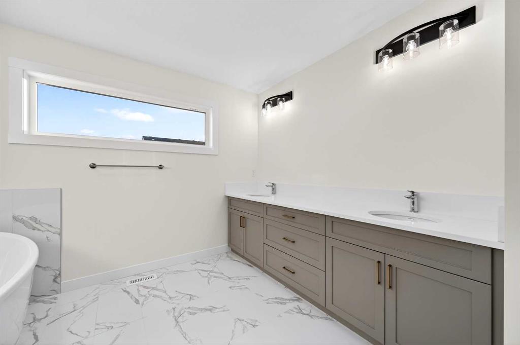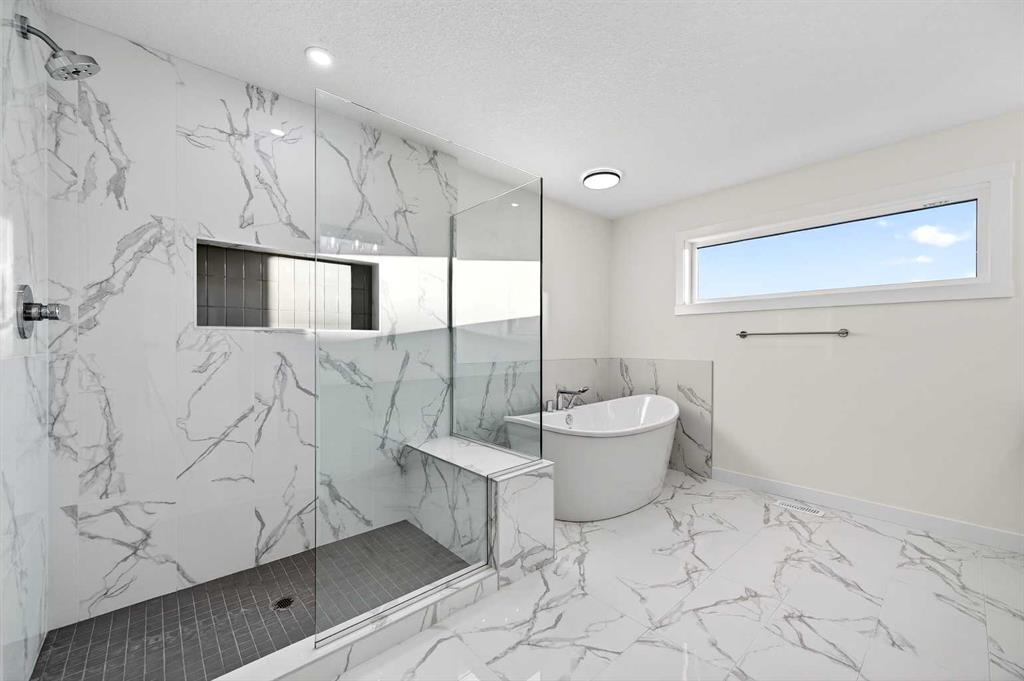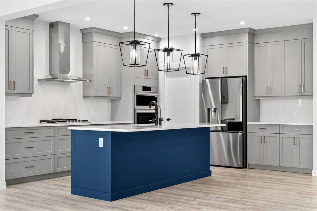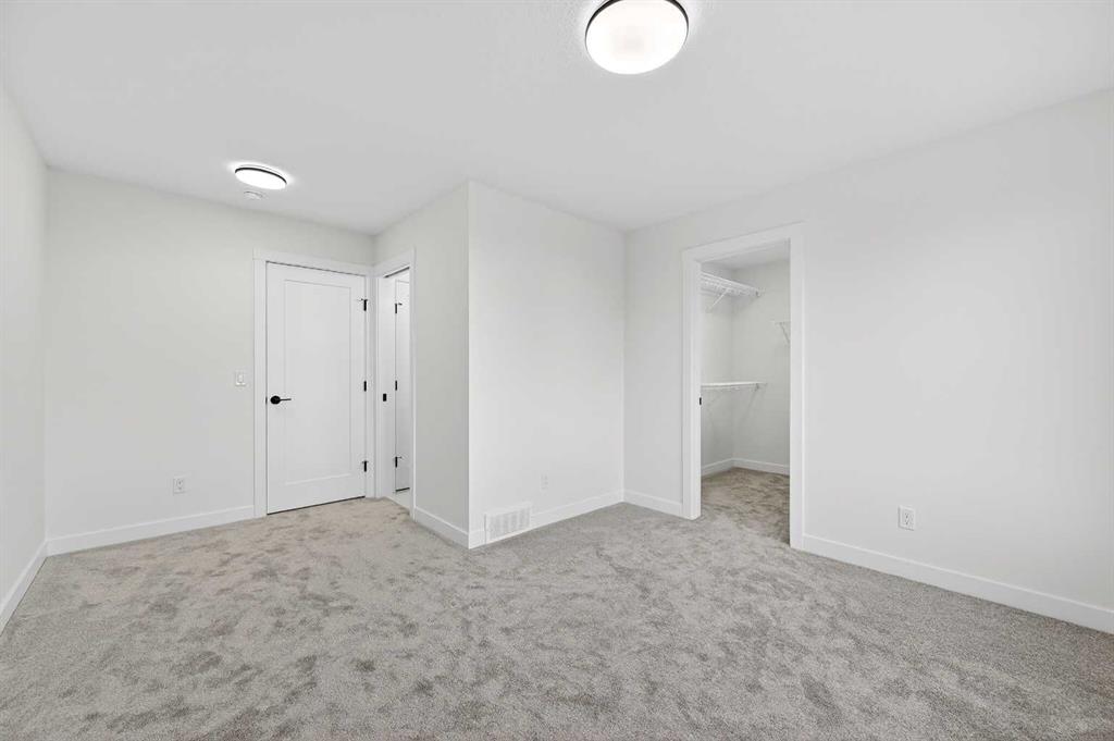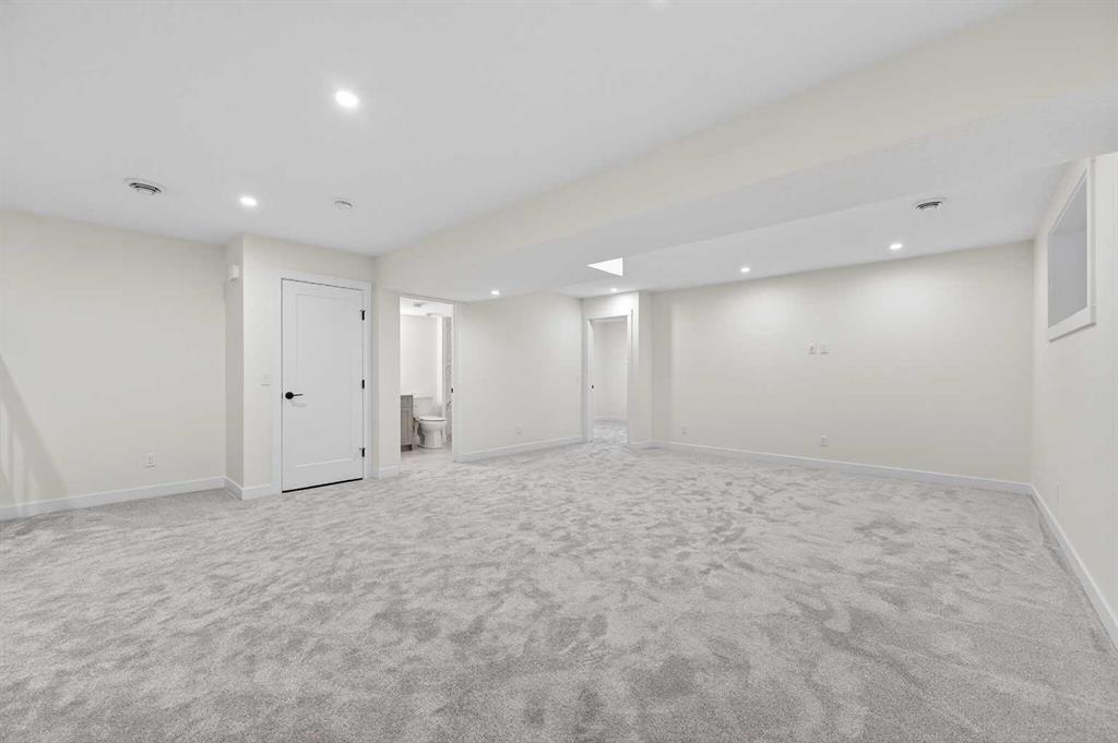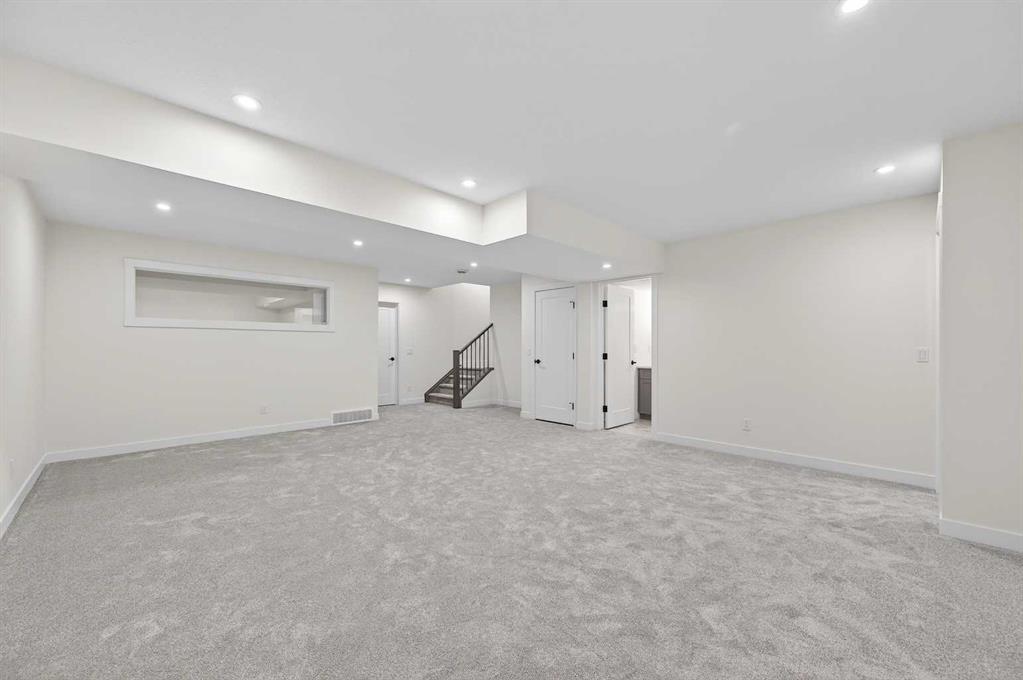 Welcome to 29 Rowmont Common NW, a stunning, sun-drenched residence that perfectly balances modern luxury with thoughtful family functionality. This south-facing home boasts a striking contemporary exterior with stone accents and a double attached garage. The bright, open-concept main floor features soaring ceilings, wide-plank flooring, and premium finishes throughout. The chef-inspired kitchen is a true showstopper, centered around a massive quartz island with a black undermount sink and designer pendant lighting. It comes fully equipped with a 5-burner LG gas cooktop, sleek chimney-style hood fan, integrated smart microwave and oven, and a full walk-through pantry. A dedicated breakfast nook with additional cabinetry and counter space is conveniently located directly beside the smart refrigerator. For the remote professional, a private main-floor office is situated near the entrance, flanked by a front-door closet and a functional half-bath. The living area is anchored by a sleek Gas Metal Fireplace, and the main level provides ample storage with direct mudroom-style access to the garage. Ascend the carpeted stairs with open railing to a versatile central bonus room, perfect for family movie nights. The Primary Suite serves as a sanctuary, featuring a private 4-piece ensuite with dual sinks and a spacious walk-in closet. Uniquely, the second bedroom also features its own 4-piece ensuite and walk-in closet, making it an ideal "junior suite," while a third generous bedroom sits nearby. The dedicated laundry room is a dream, complete with a washer/dryer, folding table, and built-in storage. The professionally finished basement extends your living space even further with two additional bedrooms, a large entertainment area, and a modern 3-piece bath. The utility room is meticulously maintained, featuring a Reverse Osmosis water system, high-efficiency furnace, and electrical panel. Outside, the south-facing backyard is a blank canvas, offering maximum sunlight throughout the day, perfect for a future custom deck. With titled-to-the-ceiling finishes and large windows throughout, this home is flooded with natural light and ready for you to move in