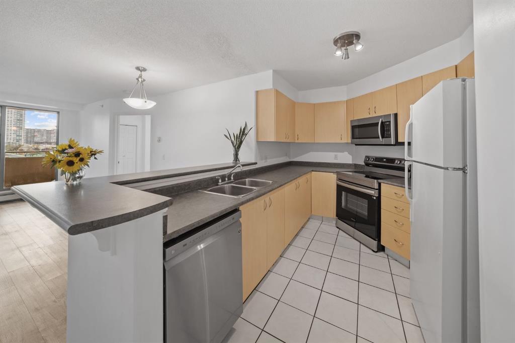 The open-concept layout is designed for real life. A spacious living room invites you to relax, with sliding doors opening onto a sunny southwest-facing balcony complete with a BBQ gas line—perfect for slow summer evenings, morning coffee, or hosting friends. The kitchen is functional and inviting, offering plenty of cabinetry, a breakfast bar for casual meals, and all appliances included.