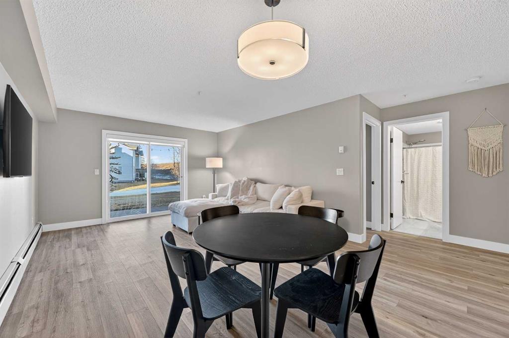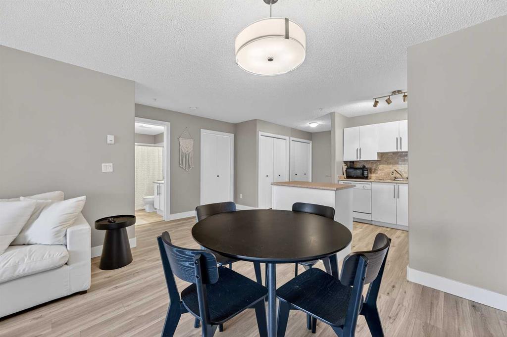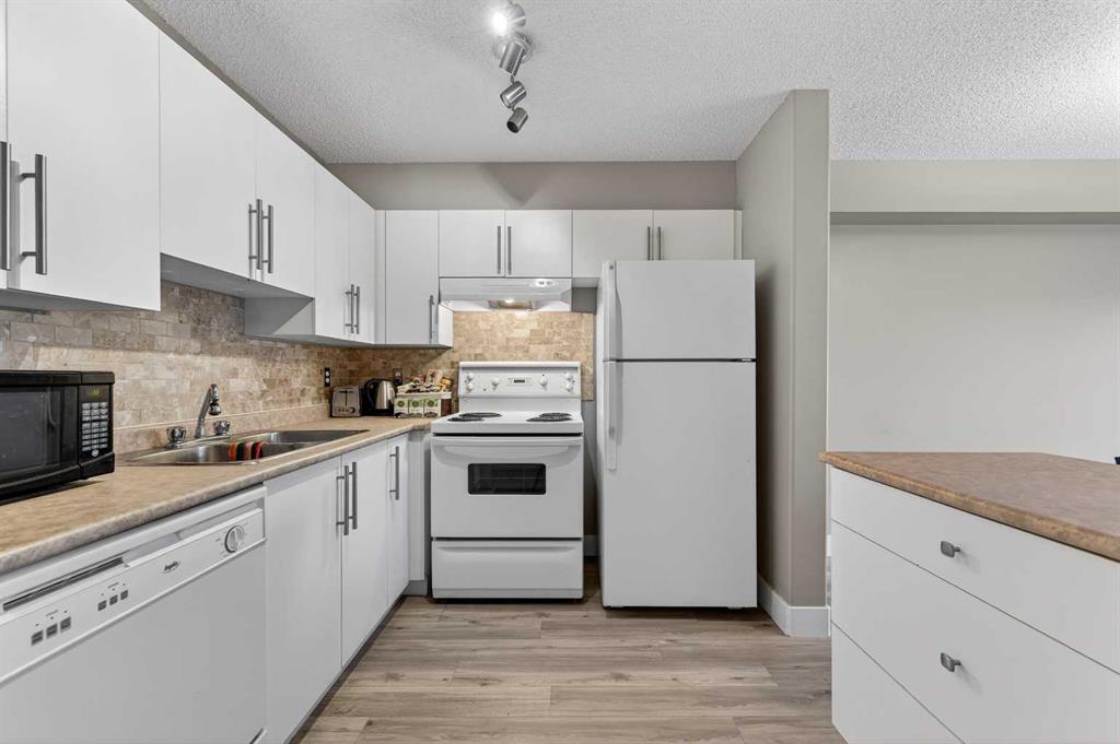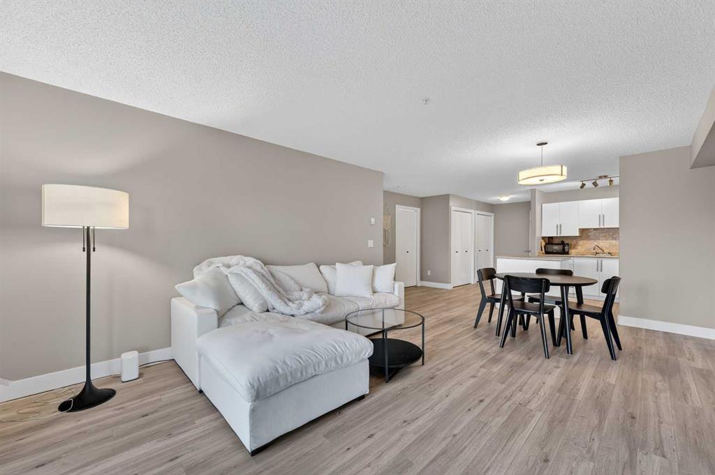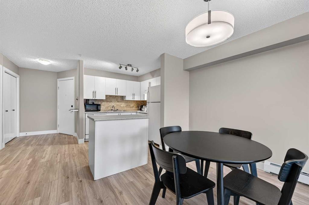 Welcome to this exceptional main-level residence at Unit 107, 3000 Citadel Meadow Point NW, offering modern style, functional design, and an unbeatable Northwest Calgary location. Directly across from the main entrance doors, this unit provides outstanding accessibility and convenience. As the largest one-bedroom floor plan in the building, it offers a spacious and open layout rarely found in condo living. The bright interior features durable wide-plank laminate flooring and a neutral contemporary palette that enhances natural light throughout. The gourmet kitchen is the heart of the home, showcasing crisp white cabinetry, a stylish stone-tile backsplash, sleek appliances, and a large center island ideal for meal prep and entertaining. The kitchen flows seamlessly into a generous dining area and sun-filled living room, creating an inviting Great Room feel. The oversized primary bedroom comfortably accommodates a king-size bed and full furniture set, while the modern four-piece bathroom offers clean finishes and timeless design. A thoughtfully sized laundry room doubles as ample in-suite storage, perfect for seasonal items, bikes, or pantry overflow. Step outside to your private patio backing onto green space, offering added privacy and a peaceful retreat. The building is tucked away from the main road, set within a quiet area and neighborhood, making it ideal for those seeking a calm living environment. This is a mature, quiet building, perfect for seniors, students, or downsizers alike.