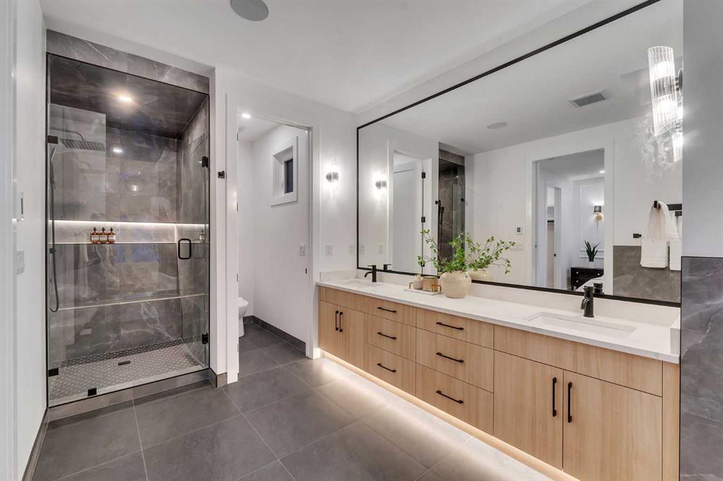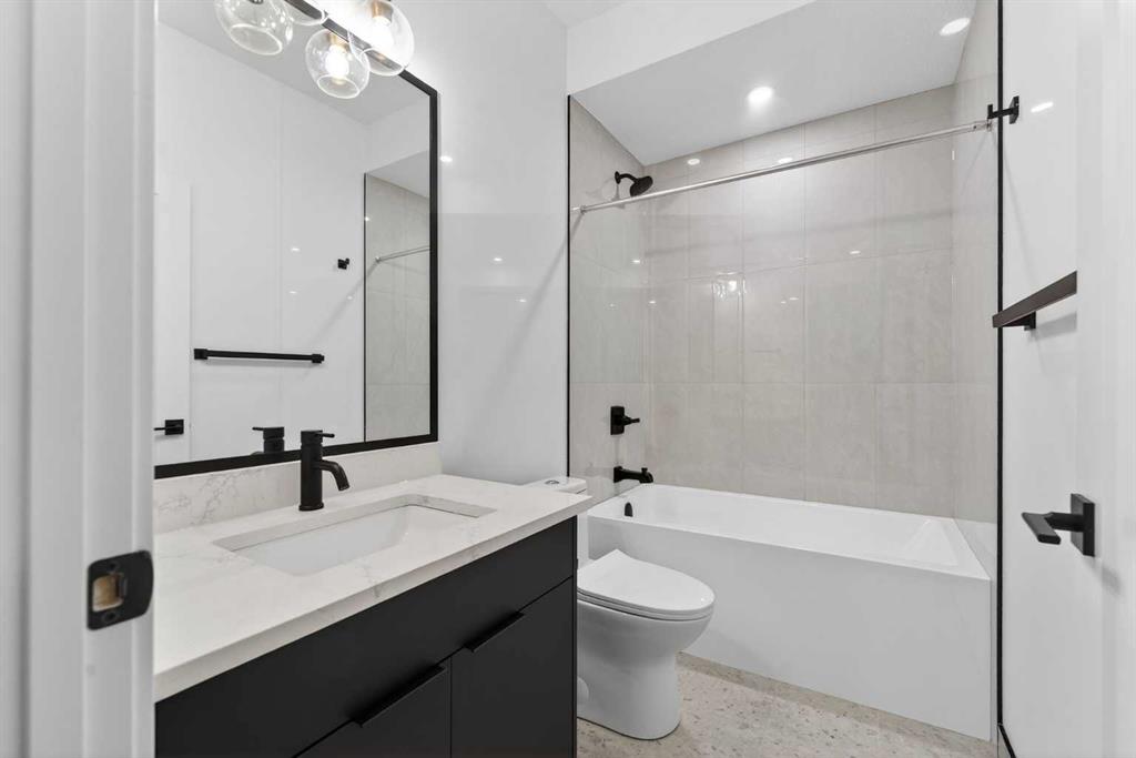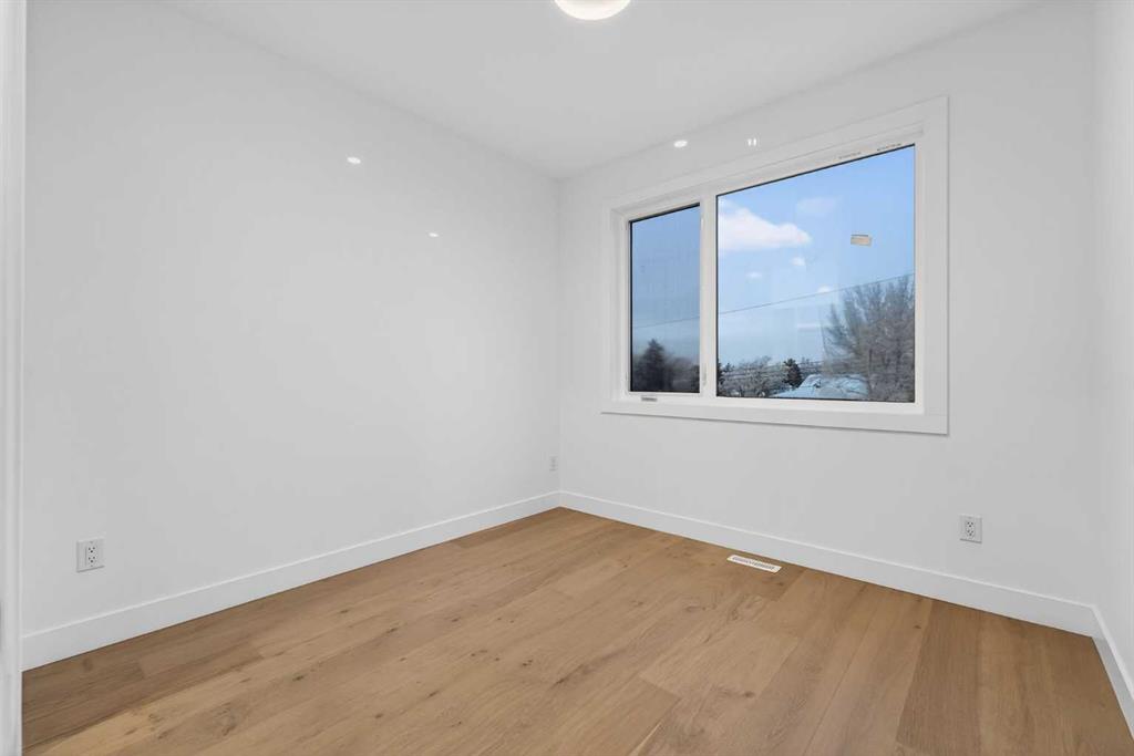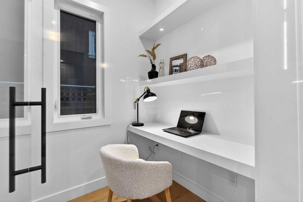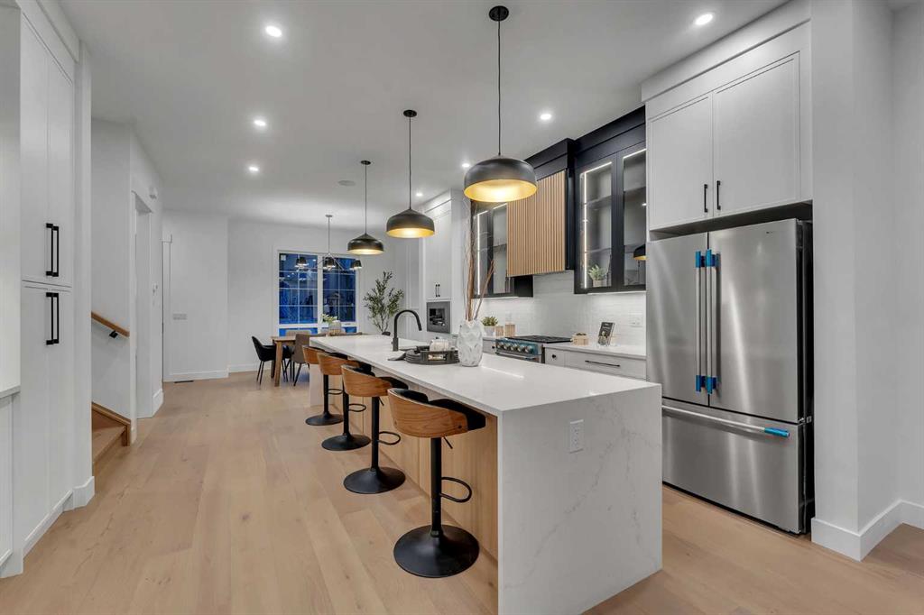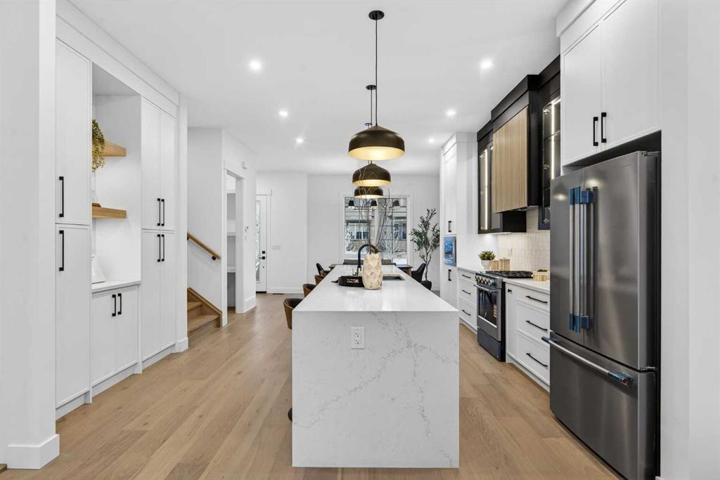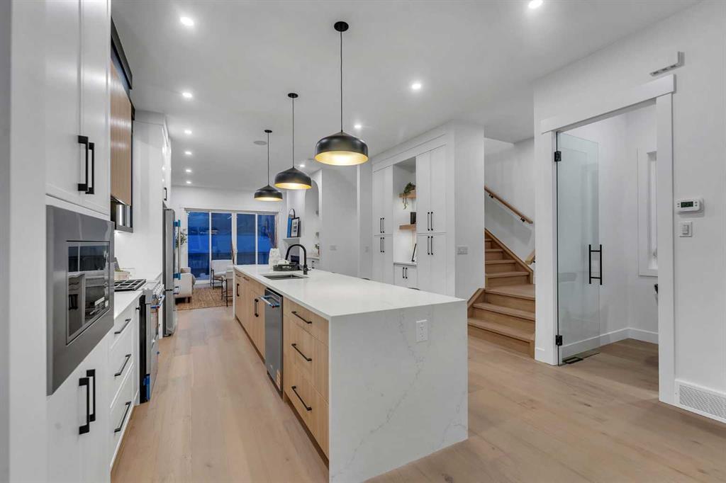 OPEN HOUSE JAN 10TH 1-4PM & JAN 11TH 1:30-4PM **FREE A/C INSTALLED IF THE SALE IS FIRM BEFORE JANUARY 31ST** BOTH SIDES AVAILABLE, EACH WITH DIFFERENT FINISHES | 4 BEDROOMS | 3.5 BATHROOMS | WALK-OUT BASEMENT WITH GYM, REC ROOM & WET BAR | SUNNY SOUTH FACING BACKYARD WITH DOWNTOWN VIEWS | Welcome to this brand-new, move-in ready infill that perfectly blends modern sophistication with smart, functional design and an open concept layout. This home has been thoughtfully curated with high-end finishes, tons of natural light, and a layout that combines luxury with practicality. Stepping inside, you're greeted with soaring 10-foot ceilings and expansive windows bringing in an array of natural light. The open-concept main floor flows seamlessly, starting with a welcoming foyer featuring custom built-in cabinetry and a bench - offering convenience, storage, and a stylish first impression. The dining area, bathed in sunlight, sets the tone for everything from casual family dinners to elegant hosting. Just steps away from the dining area - the gourmet kitchen is a true centrepiece and a chef's dream. The kitchen boasts floor-to-ceiling custom cabinetry, quartz countertops, LED under-cabinet and built-in lighting, and top-tier KitchenAid stainless steel appliances. A striking and expansive waterfall island anchors the space - perfect for prepping meals, morning coffees, evening cocktails, or just to get some work done. Extras like a built-in pantry with custom cabinetry, tiled coffee station, and floating shelves with integrated lighting elevate both form and function. Just off the kitchen, you have your own private home office offering a custom glass door and providing a quiet retreat for remote work or study. The spacious living room features a stunning tiled fireplace and oversized double sliding glass patio doors that extend your living space outdoors to the backyard patio offering downtown views - ideal for summer entertaining, morning coffees, or quiet evenings. A well-designed mudroom with built-in cabinets provides additional storage space and helps keep daily essentials organized. A chic powder room with a quartz vanity, designer fixtures, LED under lighting, and stunning wallpaper adds a refined touch to the main floor. Upstairs, the primary suite is a showstopper. Custom detailing, an expansive walk-in closet, and a spa-inspired ensuite with IN-FLOOR HEATING, a quartz double vanity, LED accent lighting, backlit mirror, free-standing tub, and oversized glass shower make this a true retreat. Two additional bedrooms, each with their own spacious walk-in closets, provide cozy, private spaces and share a beautifully appointed four-piece bathroom. A dedicated laundry room with custom cabinetry, quartz countertops, and a sink finish off this masterful upper level. The fully finished WALK-OUT basement is thoughtfully designed and features an additional bedroom, four-piece bathroom, gym/exercise area, a wet bar, and recreation area perfect for additional living space.