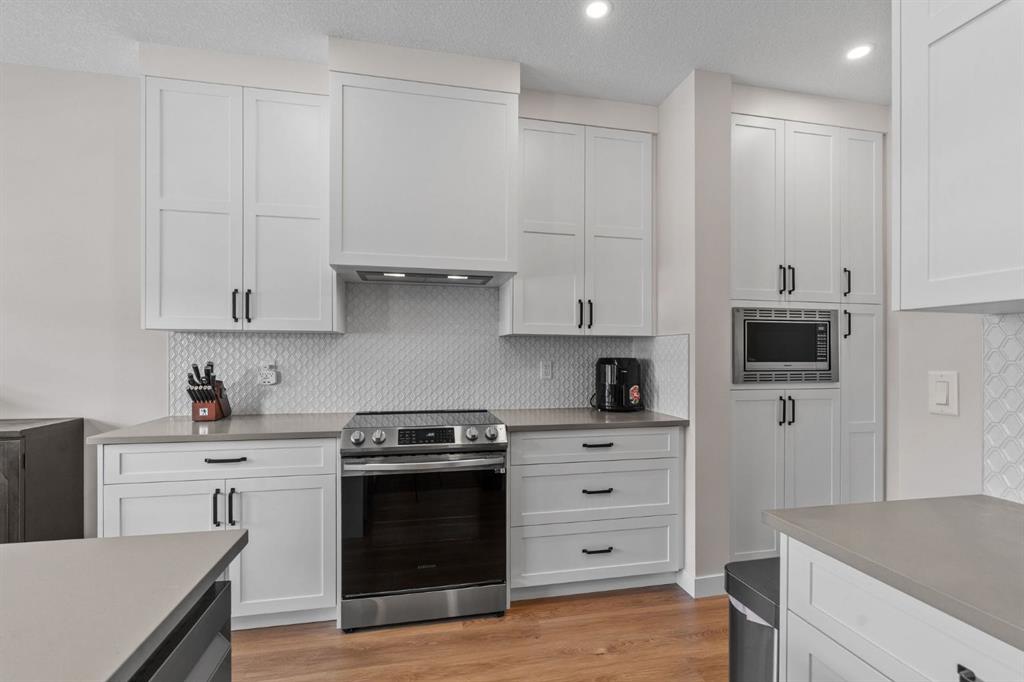 The kitchen is the heart of the home—functional, stylish, and built to gather. Highlights include a quartz island overlooking the living space, ceiling-height shaker cabinetry, stainless steel appliances, a built-in pantry with microwave, and upgraded lighting throughout.