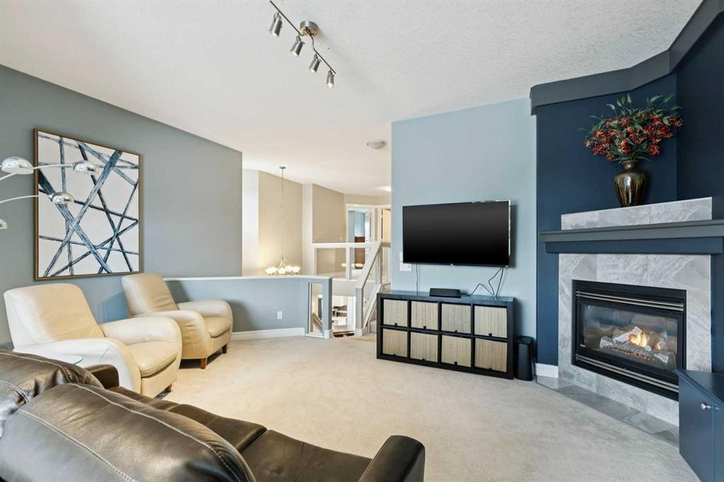 *Open House Saturday January 10th 1:00-3:30pm* This is the kind of home where families put down roots. It is tucked away on a quiet cul-de-sac in one of the most sought-after pockets of the community, with a south facing yard backing on to a treed green space. With a charming front porch, a welcoming red door, and a flowering tree providing curb appeal, the tone is set from the moment you arrive. Inside, refinished hardwood floors lead you through a comfortable living room anchored by a fireplace and flowing seamlessly into the open-concept kitchen and dining area designed for everyday life. The kitchen has been thoughtfully updated in a fresh black and white palette, featuring quartz countertops, stainless steel appliances, a gas cooktop, a central island with seating, and a spacious pantry that keeps everything organized and within reach. A dedicated main-floor den offers an ideal work-from-home space, complete with built-in bookcases and a peaceful outlook to the front porch. Upstairs, the home truly shines for family living. A generous bonus room with vaulted ceilings and a fireplace creates the perfect gathering place for movie nights, games, or simply unwinding together. The primary bedroom is a serene retreat, with space for a sitting area overlooking the backyard, a walk-in closet, and a private ensuite. Two additional bedrooms - one with a built-in desk, along with a full bathroom complete the upper level.