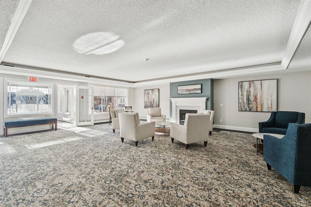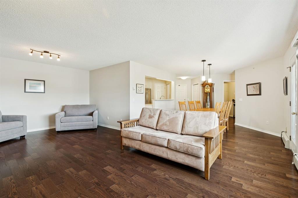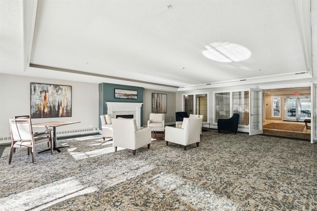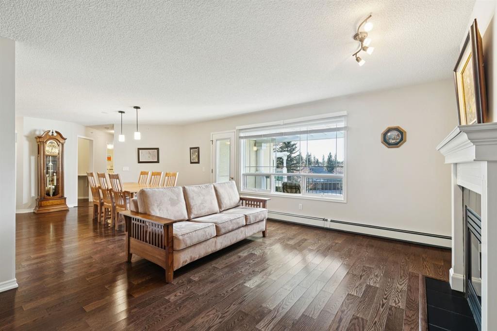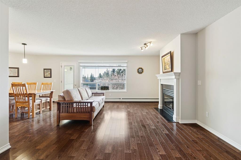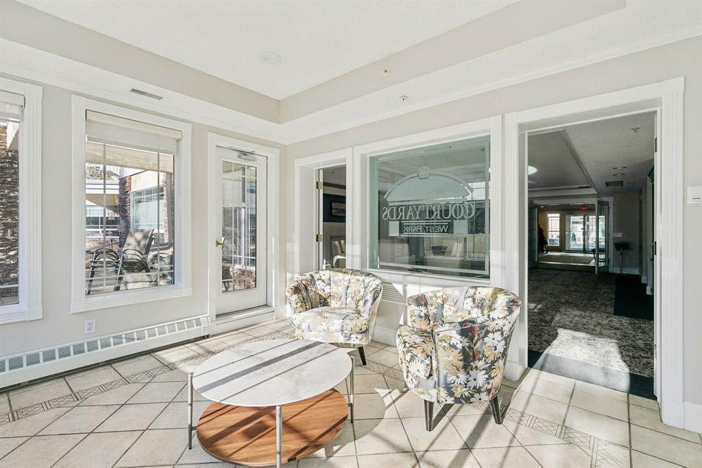 Enjoy peaceful, maintenance free adult living in the sought after community of Palliser at Courtyards West Park. This well managed condominium building offers a top floor, southwest facing home with a bright, open layout designed for comfort and ease, featuring two bedrooms, updated hardwood floors, and a spacious balcony with gas hookup overlooking the tranquil courtyard, perfect for morning coffee or relaxing evenings. A welcoming foyer leads to the formal dining area and a bright, thoughtfully designed kitchen with crisp white shaker style cabinetry, quartz countertops, raised breakfast bar for casual meals, pantry, and newer appliances. The generous living room easily accommodates both a comfortable seating area and a reading nook or home office, and features a cozy gas fireplace for year round enjoyment. Convenient in-suite laundry includes built-in storage, a folding counter, and ample space for a freezer, making daily routines effortless. Down the hall, you’ll find a full bathroom and two spacious bedrooms, including the primary. The primary retreat is a true sanctuary, offering a large sleeping area, walk-in closet, additional linen storage, and a private 4pc ensuite with a deep soaker tub and separate walk-in shower. This unit includes a titled underground parking stall and an assigned, secure caged storage unit, ideal for seasonal items. Residents of Courtyards West Park enjoy outstanding amenities, including a welcoming main floor gathering room with kitchen, library, and sunroom that opens to the beautifully landscaped courtyard, providing wonderful opportunities to socialize, host family, or meet neighbours. Ideally located near parks and walking paths, recreation facilities, Rockyview General Hospital, and the shops and cafés of Glenmore Landing, this well managed adult community offers a relaxed lifestyle with everyday conveniences close at hand.