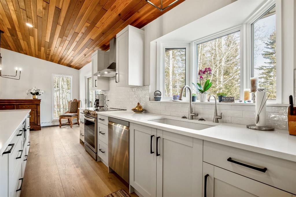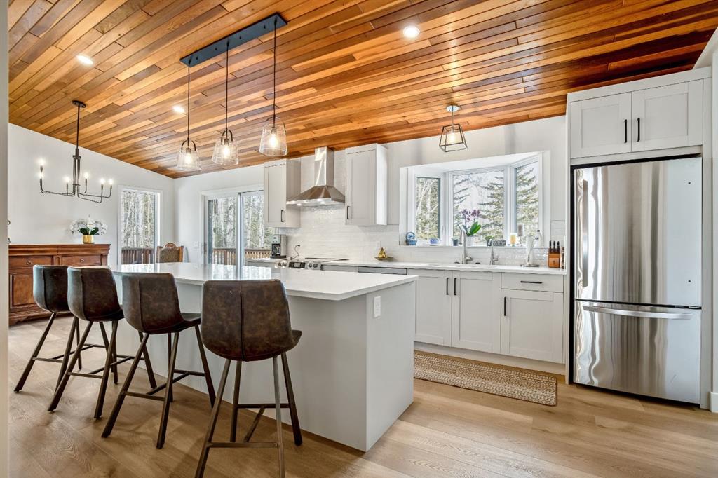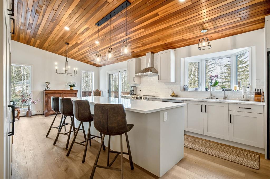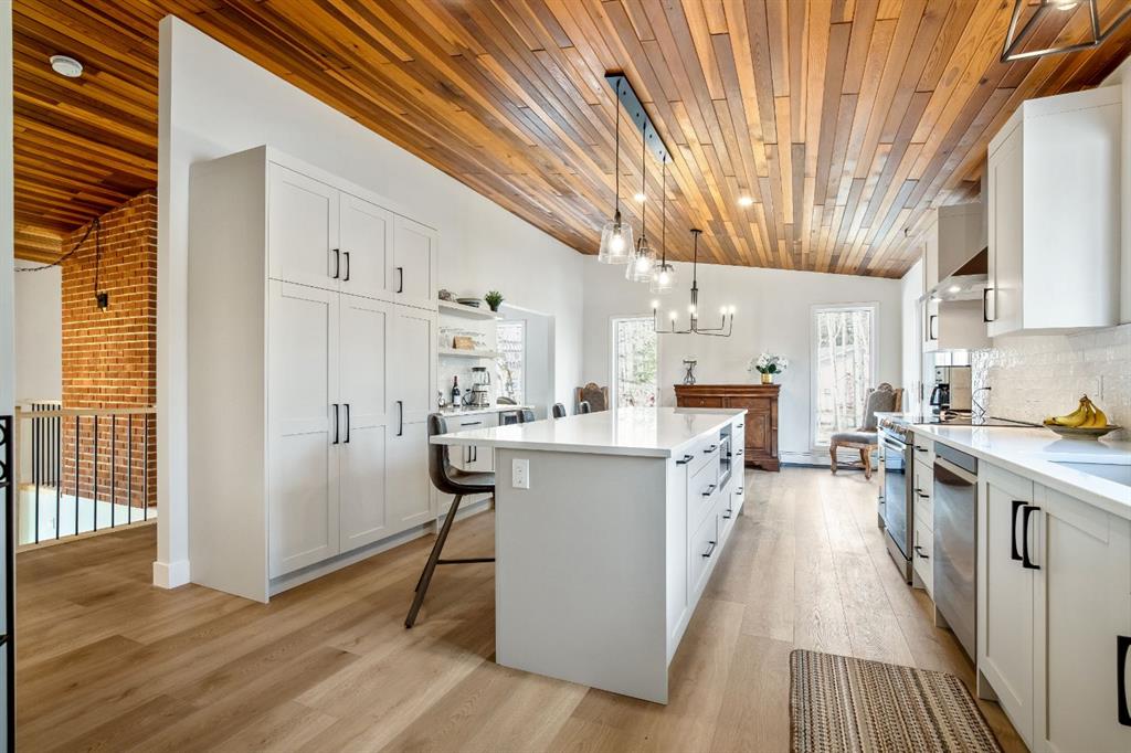 beamed ceilings, kitchen island, natural woodwork, quartz counters, vaulted ceiling(s)