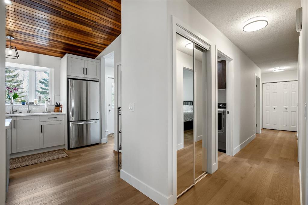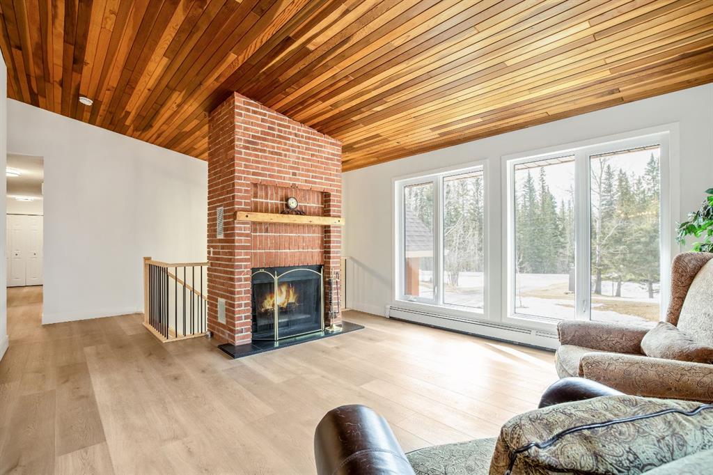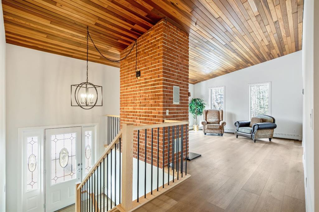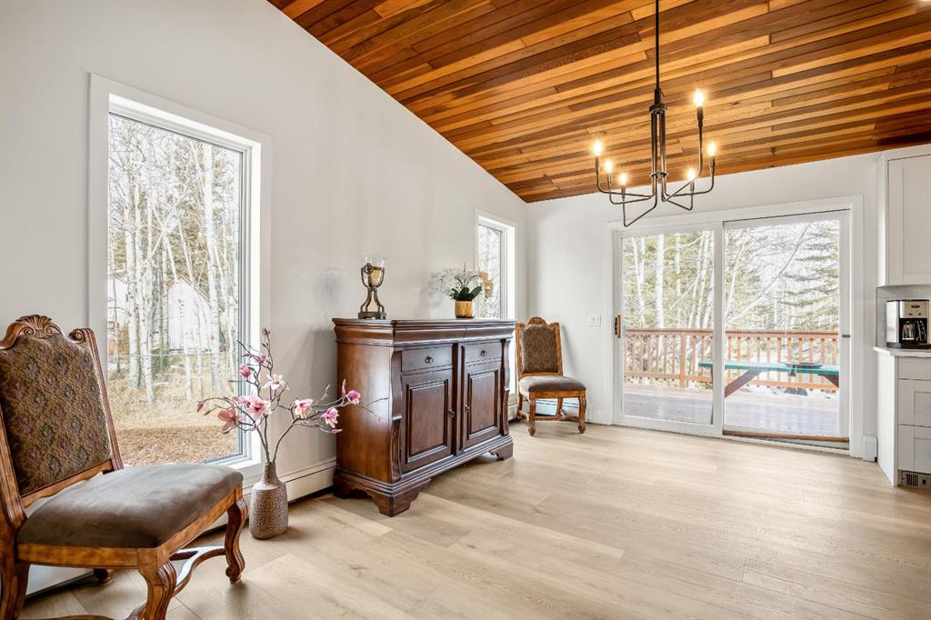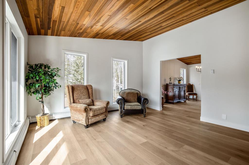 beamed ceilings, kitchen island, natural woodwork, quartz counters, vaulted ceiling(s)