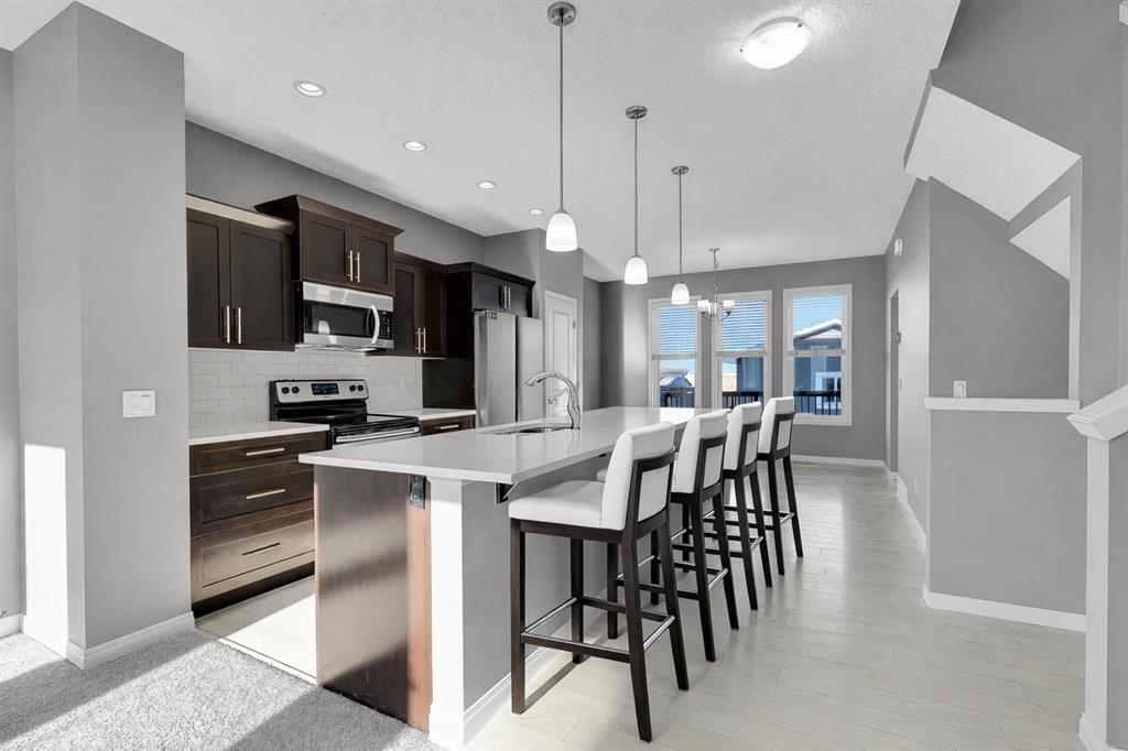 Modern upgrades and bright, functional living come together in this fully finished and MOVE-IN READY 2-storey detached home in the award-winning lake community of Mahogany. Offers 3+1 bedrooms, 3.5 bathrooms, a double detached garage, a fully developed basement and fresh paint throughout. Central A/C for those hot summer days. Quick possession available! The open-concept main floor is warm and welcoming, featuring a sun filled-living room with brand new carpet. a well-appointed central kitchen with a large quartz island, ample cabinetry, generous counter space, and SS appliances including a brand new fridge. Spacious dining area opens directly onto a huge 12x20 deck—perfect for summer BBQs, outdoor dining, or relaxing evenings in the private and fenced backyard (no neighbours behind). A convenient 2-pc bathroom completes the main level. Upstairs, the primary bedroom offers a private retreat with a walk-in closet and 4-piece ensuite, and a sunny balcony is great for morning coffee or reading a book. Complemented by 2 additional bedrooms and another full bath on this level. The fully developed basement adds excellent versatility with a large family/rec room, a 4th bedroom, and a 4pc bath—ideal for guests or a home office. Lots of storage space in the mechanical room and under the stairs. Outside, the backyard leads to the double detached garage, providing both parking and extra storage. Ideally located with easy access to Mahogany’s lake and beaches, residents enjoy year-round recreation plus access to nearby schools, parks, playgrounds, scenic pathways, and quick access to Mahogany Village Market, shopping, restaurants, transit, and major roadways. An outstanding opportunity to enjoy lake living at its best!