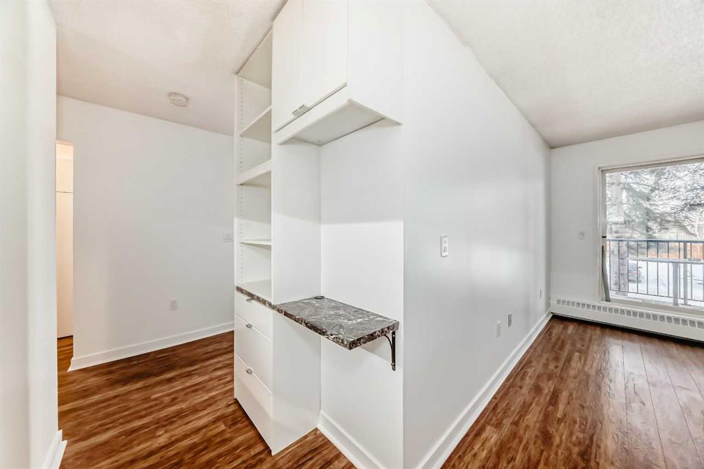 Welcome to this freshly updated, move-in-ready one-bedroom, one-bathroom apartment offering an excellent opportunity for first-time buyers or investors. This well-maintained, single-level unit has been thoughtfully updated to provide comfort, functionality, and affordability. The home has been freshly painted and features durable laminate flooring throughout. The kitchen is nicely upgraded with newer soft-close cabinets in modern gloss white fronts, under-cabinet lighting, and generous counter space with marble-style arborite countertops. A double pantry off the kitchen provides excellent additional storage, while a newer matte black pull-down faucet, newer dishwasher with a stainless-steel interior tub, and a new over-the-range microwave complete the space. The dining area features a stylish accent wall and a ceiling fan with dimmable lighting, creating a comfortable space for everyday meals. The living room opens onto a private balcony that offers a quiet outdoor retreat. The barbecue, table, and chairs are included, making the space ready to enjoy right away. The bedroom includes a double wall closet, along with an additional movable closet unit for extra storage. The bathroom also offers double medicine cabinets for added storage and convenience. In-suite laundry is provided with an LG front-load stacked washer and dryer. Heat and water are included in the condo fees, keeping monthly costs low. The poly-B plumbing has been removed for added peace of mind. The building offers quick elevator access to the second floor, an assigned exterior parking stall, and easy visitor parking located directly out front. Quick possession is available, making this an ideal option for buyers looking to move in without delay. The location is well suited for daily living and commuting, with nearby elementary and junior high schools, shopping, grocery stores, restaurants, and services close by along International Avenue and throughout the area. Downtown Calgary is approximately a 10 to 15 minute drive depending on traffic, with nearby transit routes and easy access to Deerfoot Trail, Memorial Drive, and 17 Avenue SE. This well-located, low-maintenance home is a smart and affordable way to enter the Calgary real estate market, offering practical upgrades, privacy, and excellent accessibility. Don't delay, call today!