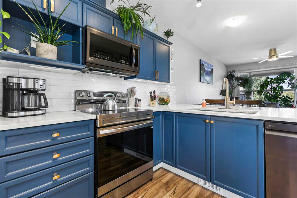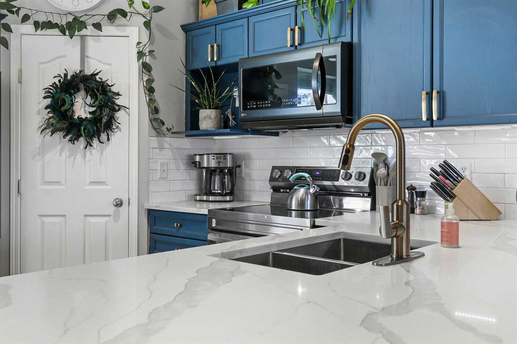 The refreshed kitchen is a true showstopper with striking navy blue cabinets accented by gold hardware, a sleek white tile backsplash, under-cabinet lighting, and designer granite countertops. A corner pantry, stainless steel appliances, USB-integrated outlets, and a flush eat-up island with added storage make this a modern kitchen ready for everyday function or entertaining.