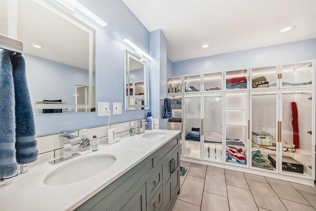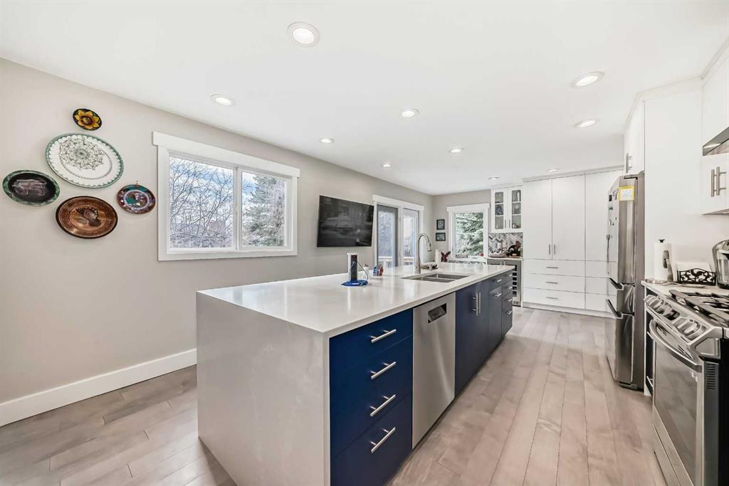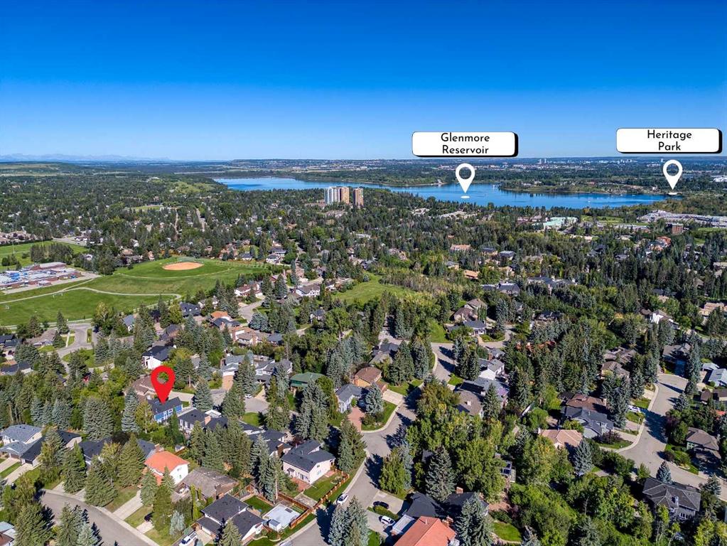 Rarely available in this prestigious location! Come home to your unique 2 storey split home located on a huge pie lot, nearly a quarter acre with a south-southwest backyard, nestled in a quiet cul-de-sac! Enjoy the tranquility, peaceful and park-like yard with mature trees and space to play or relax near the patio stone fire pit. Multi year renovation, with all permits in place, includes upgraded windows, smart home system, smooth ceilings throughout 3,400+ square feet of finished space, a truly stunning transformation. Enter into the main level showcasing engineered hardwood, adjacent living room with back lit crown mouldings and a raw edge, custom milled fireplace mantel complimenting the remote controlled gas fire. The expansive kitchen boasts an impressive 11' quartz island with waterfall edge, sink with touch sensor faucet, and hidden USB, electrical outlets and wireless phone charger. High-end stainless steel appliance package includes a gas range with pot filling faucet, dramatic hood fan, separate refrigerator and wine fridge, complimented with detailed backsplash. Featuring soft close cabinet hinges and plenty of pantry storage, the kitchen is naturally sunlit with French doors and beautiful windows. Entertain guests with the open concept dining overlooking the family room. Step down to the walkout level into the family room designed with luxury vinyl plank flooring and multiple focal points being the breath taking stonework, gas fireplace and patio door. Conveniently the guest bathroom and laundry are near the garage entrance. Head upstairs to the primary wing redesigned with a vast sitting area, private balcony and luxurious en-suite! Rejuvenate with heated tile flooring, huge walk-in shower equipped with rain shower head and multiple jets or soak in the stand alone bathtub. LED mirrors rimmed with lighting soothe the mood over the twin sinks. The primary wing expands into the loft with a dormer and skylight allowing in rays of sunlight. Smart home lighting is controlled from the bedside switch all the way to the en-suite! The upper level has two more large bedrooms, a bonus room and full bathroom also with heated tile flooring. The fully finished basement has daylight pouring into the recreation room, another full luxury bathroom next to the fourth bedroom, den, workshop and utility room. Enjoy indoor / outdoor living with the low maintenance deck overlooking the yard and patio with spaces to host large gatherings. Double garage with twin doors, plenty of parking for your family and friends! Close proximity to trails, Southland Leisure Centre, Rockyview Hospital, Heritage Park, Glenmore Park, shopping and sought after schools! Book your showing today!