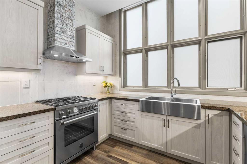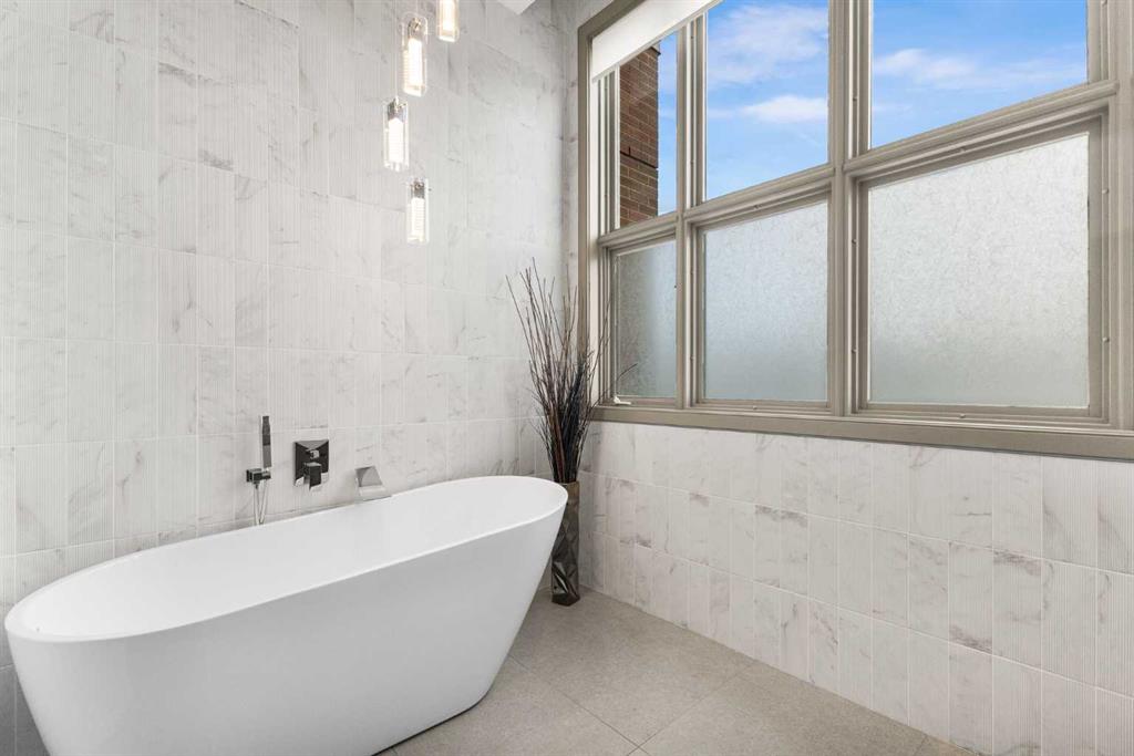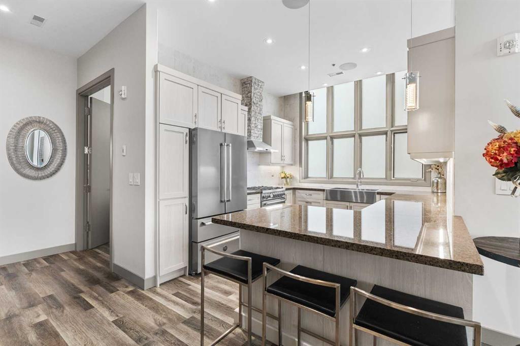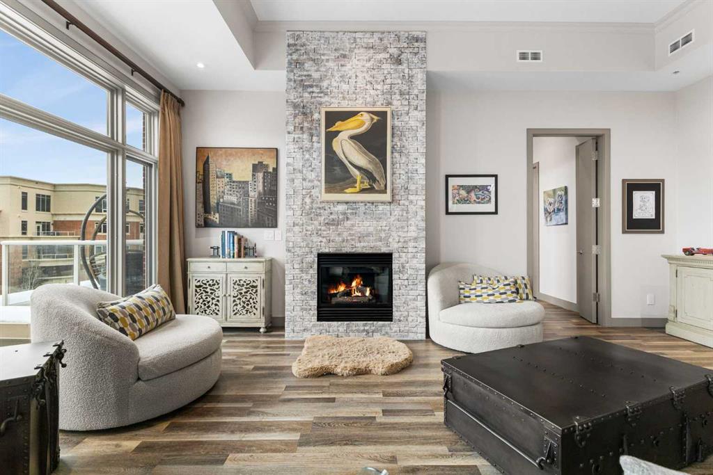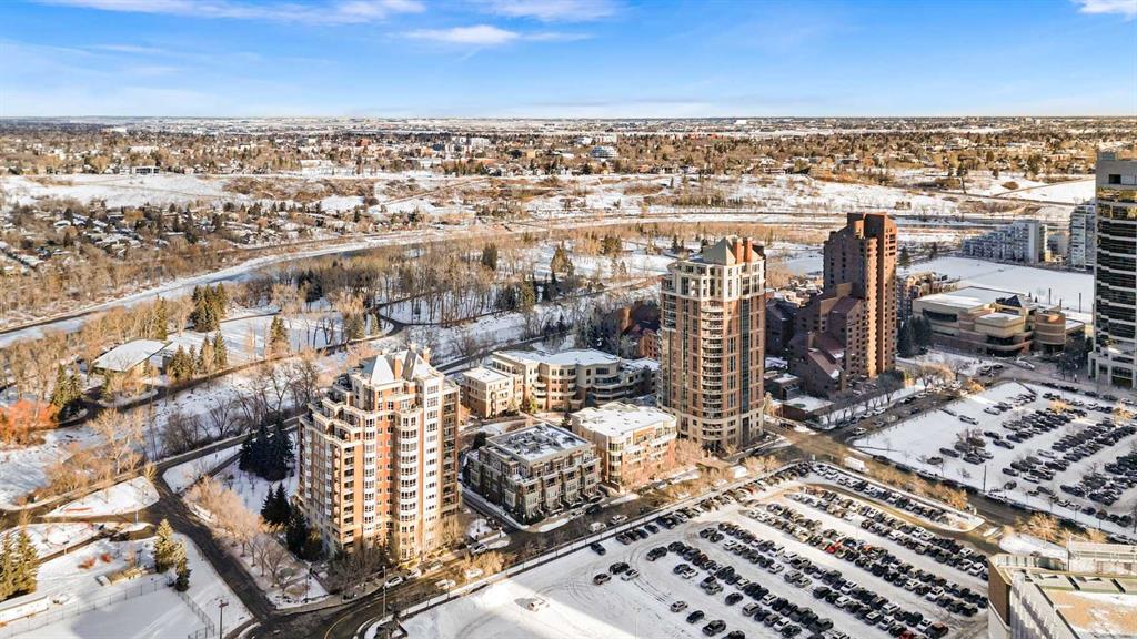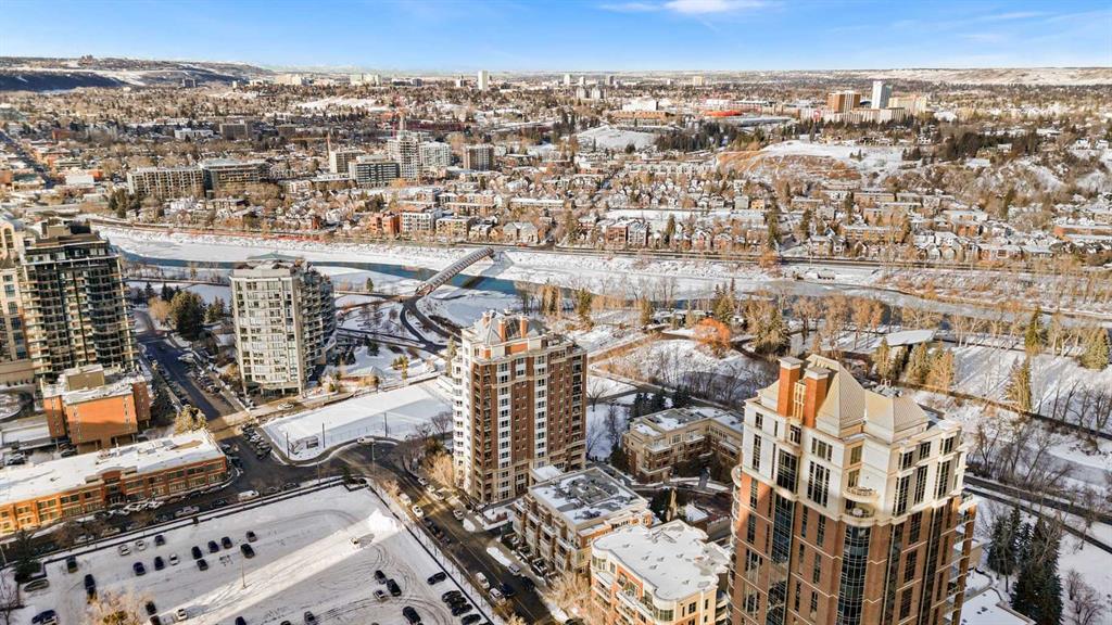 Exceptional completely renovated 2 bedroom, 2 bath penthouse residence offering over 1500 sq ft of luxurious living space in coveted Eau Claire, just steps to picturesque Prince’s Island Park & scenic Bow River pathways. This well-appointed condo presents hardwood floors, soaring ceilings & is drenched in natural light, showcasing a spacious living room with terrace access & anchored by a stunning floor to ceiling fireplace. A formal dining room adorned with an elegant chandelier affords ample space to entertain family & friends. The kitchen is beautifully finished with granite counter tops, eating bar, plenty of storage space & all new high-end stainless steel appliances. Just off the living room, the primary bedroom with balcony access features abundant closet space & private 5 piece ensuite with dual sinks, relaxing freestanding soaker tub & separate shower. The second bedroom & 3 piece bath are ideal for guests. Other notable features include in-suite laundry, 3 large terraces with north & west views, halogen recessed lighting, in-floor heat, central air conditioning, humidification through forced air & power blinds on high windows. Also enjoy the convenience of 2 titled underground parking stalls near the elevator, one titled storage space & recently renovated common areas. The central location can’t be beat – Bow River pathways & Prince’s Island Park & the Peace Bridge are just steps away plus downtown restaurants & amenities are close by. This elegant residence offers the ultimate in exclusivity & privacy with only 4 units on the floor & no noise from above.
