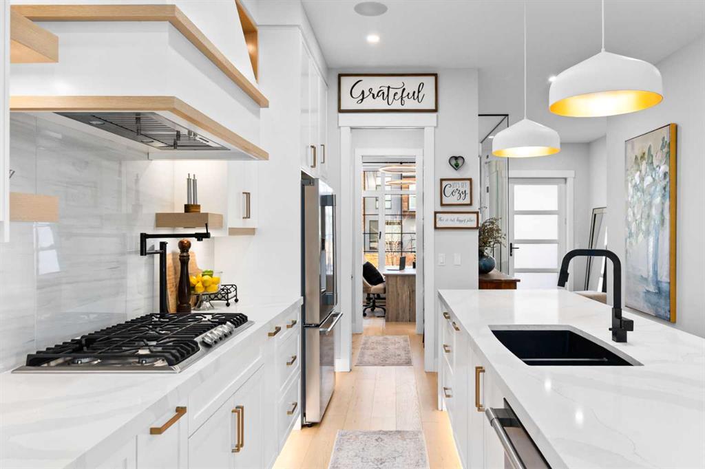 2,119 SQ.FT ABOVE GRADE | 4-BED | 3.5 BATH | HEATED GARAGE | A/C | PREMIUM FINISHES | Custom-built and offering 3,044 sq ft of refined inner-city living, this is a rare opportunity to own a luxury home in the sought-after community of Rosscarrock, steps from schools, parks, and Westbrook LRT with quick access downtown. The main floor features 10’ CEILINGS and a glass-walled front flex room perfect for a HOME OFFICE or private workspace, while the gourmet kitchen is designed for both everyday use and entertaining with full-height two-tone cabinetry, built-in appliances, a gas cooktop with pot filler, waterfall island, and a BUTLER'S PANTRY, flowing into a bright living space with a gas fireplace and CUSTOM MILLWORK. Large European tilt-and-turn windows and doors connect the interior to a COVERED BACKYARD DECK finished with composite boards, creating a low-maintenance outdoor living area. Upstairs, the primary bedroom includes a walk-in closet and a five-piece ensuite with dual vanities, a tiled shower, and HEATED FLOORS, along with two additional bedrooms, a full bathroom, a bonus room, and upper-level laundry. The fully developed basement adds a spacious recreation room with WET BAR, IN-FLOOR HEATt, a fourth bedroom, and a full bathroom. Additional highlights include wide-plank engineered hardwood on the main and upper levels, custom millwork throughout, built-in speakers, air conditioning, a HEATED DOUBLE GARAGE with epoxy floor, and over $50,000 in professional landscaping, delivering a level of finish and comfort that stands out in this established inner-city neighbourhood. Schedule a showing today before it's gone.