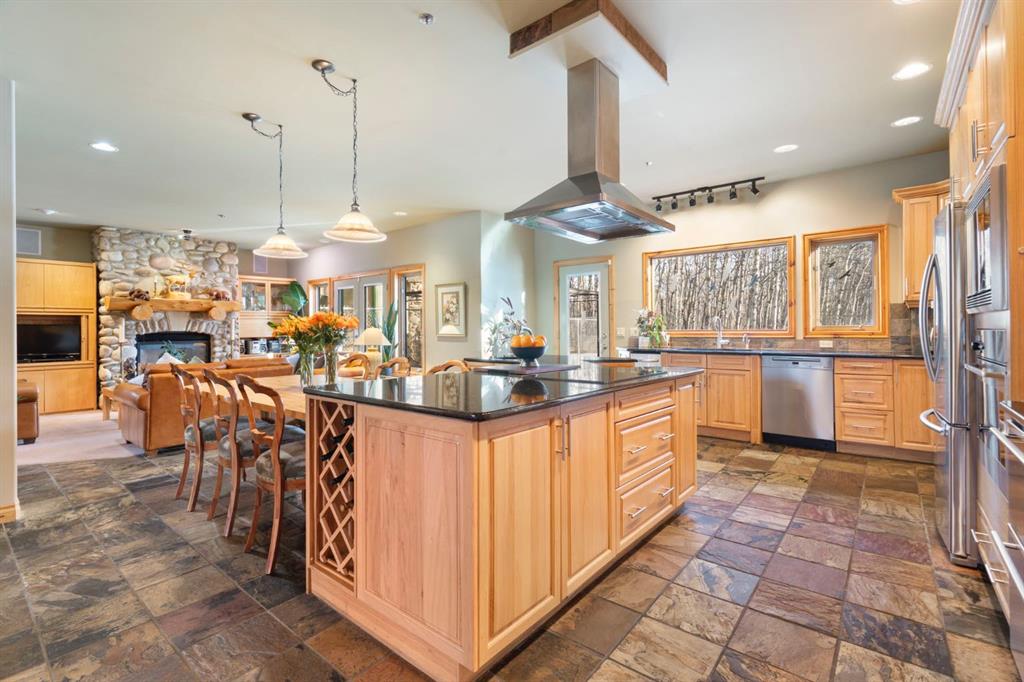 The foyer adorned with hand-selected knotty pine sets the tone for the alpine detailing that flows seamlessly throughout the entire home. The living room, covered in natural light, features heated floors and a striking grand stone fireplace—a perfect gathering place for family and friends. The custom kitchen is a masterpiece of design, with a central island, hickory cabinetry, stainless steel appliances, and sweeping views of the backyard. Adjacent, for seamless entertaining and high functionality for family meals is the formal dining room, framed by exposed pine beams. This floor also has 1 oversized bedroom with 4-piece ensuite bathroom with a private entrance for ultimate flexibility.