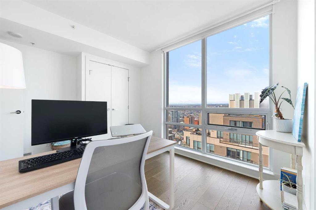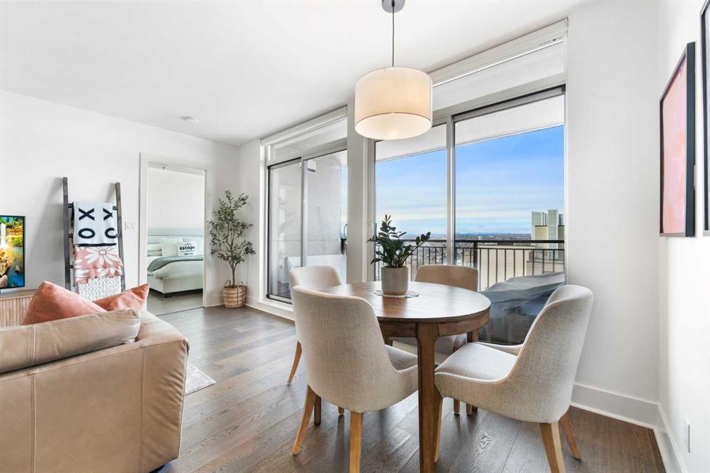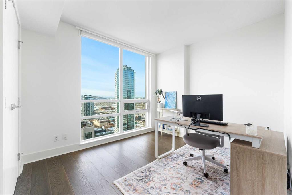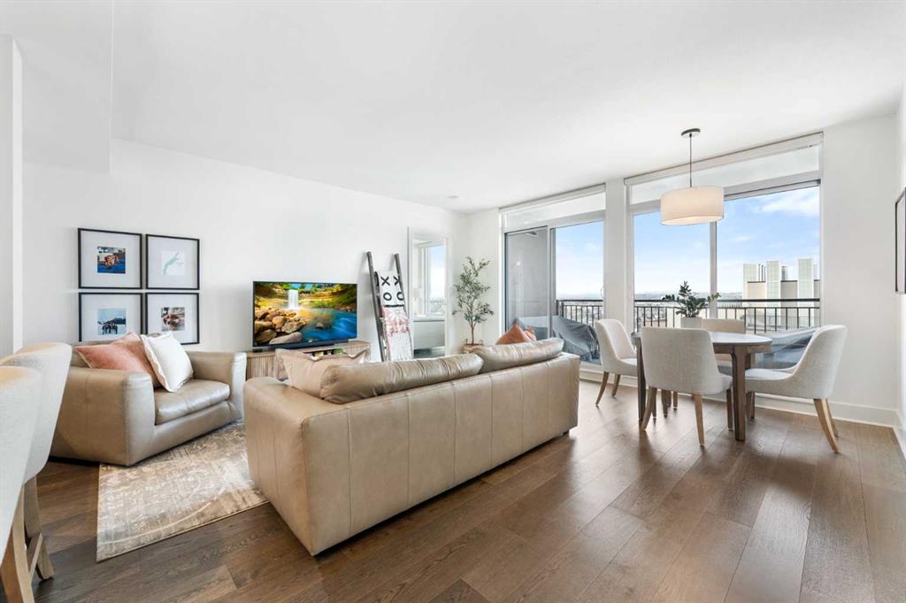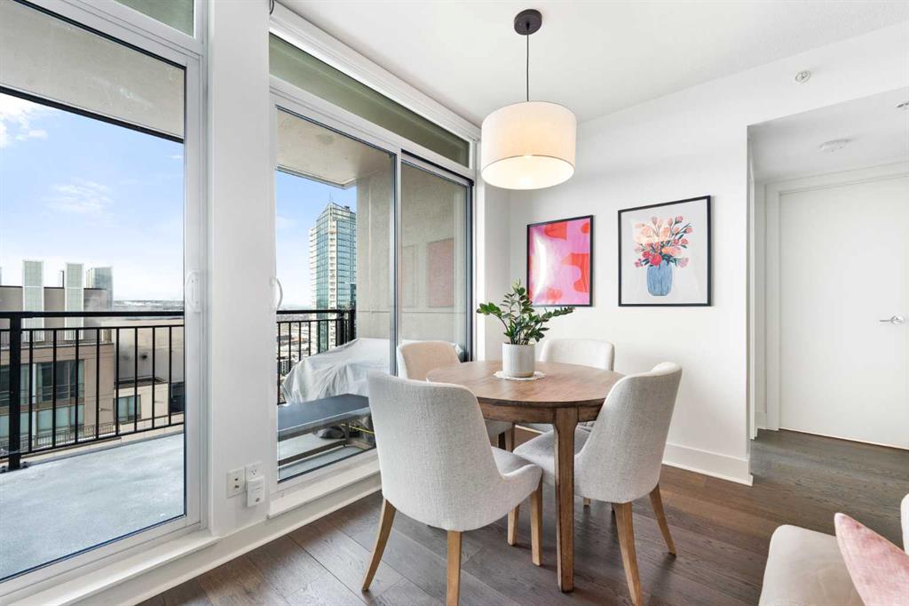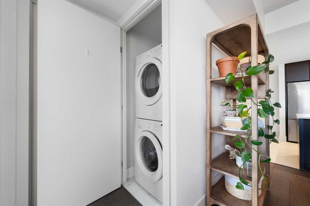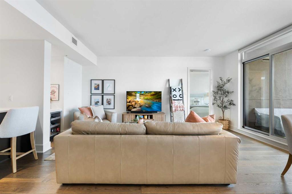 Floor-to-ceiling windows and hardwood flooring throughout enhance the natural light and elevate the space, while in-suite laundry and air conditioning add everyday comfort. Step outside through double sliding doors to your private patio — the ideal place to unwind and enjoy Calgary’s most dramatic sunsets.