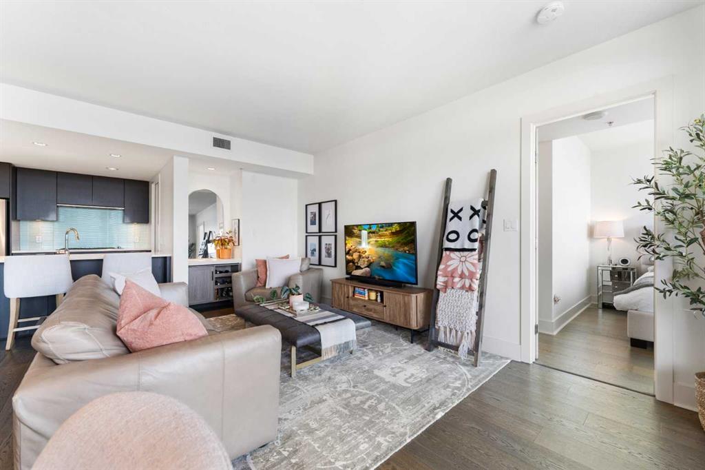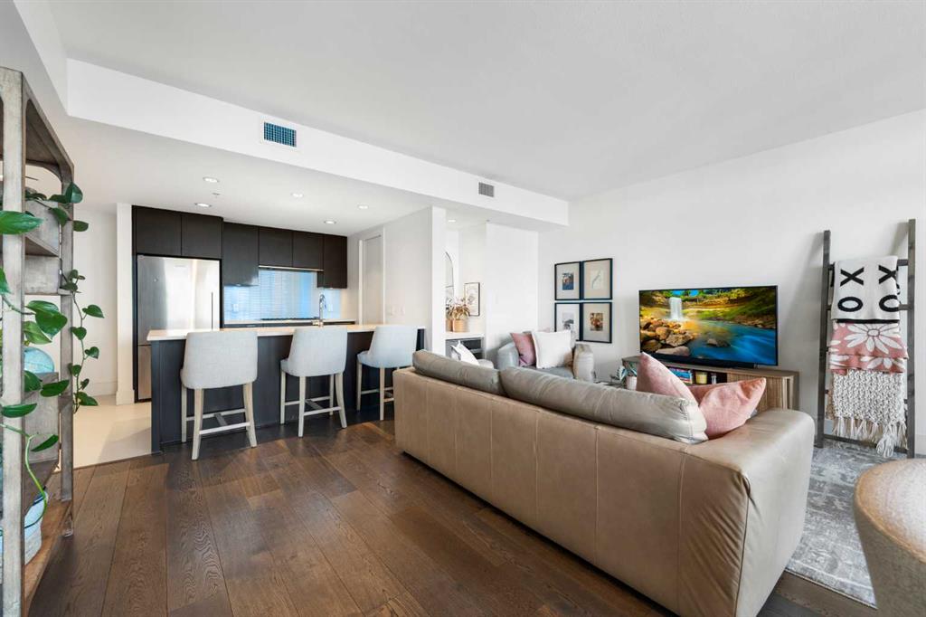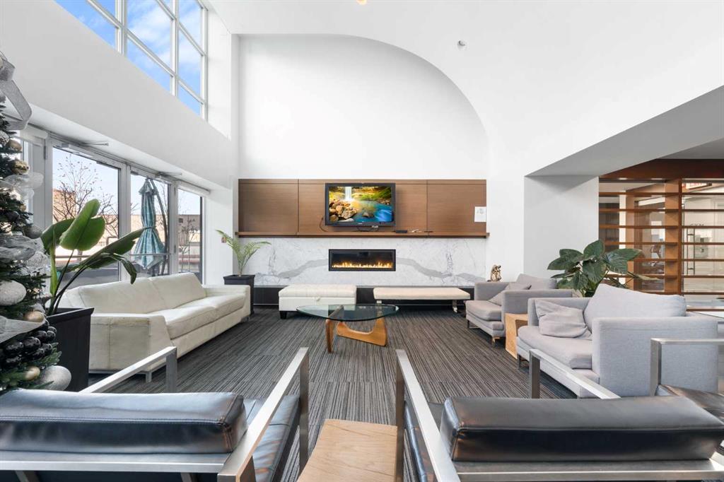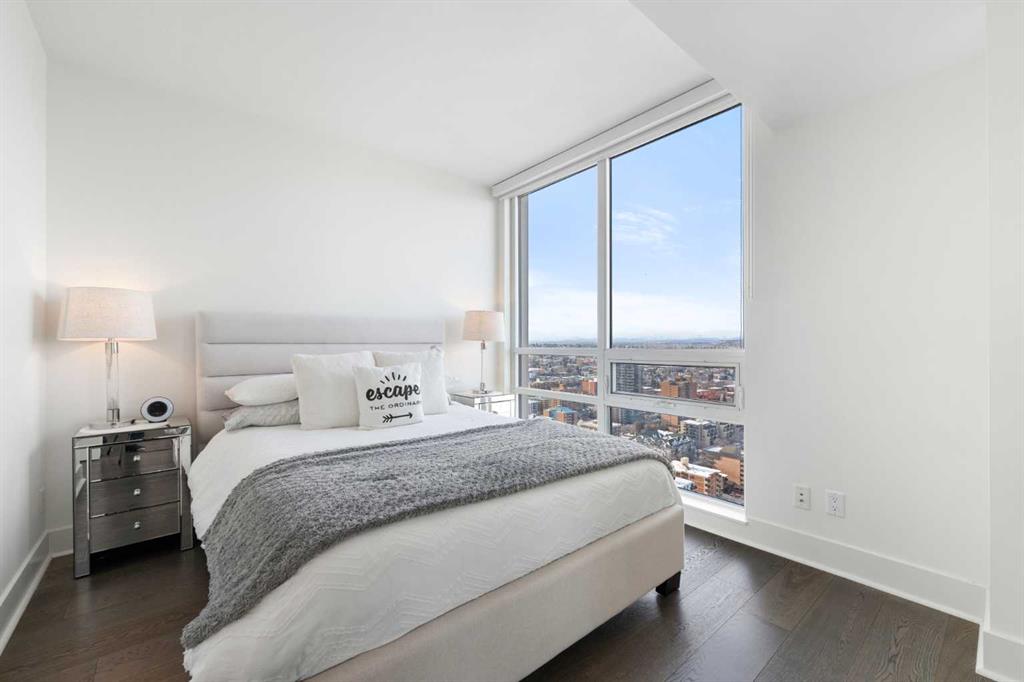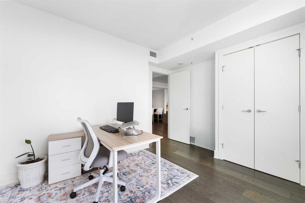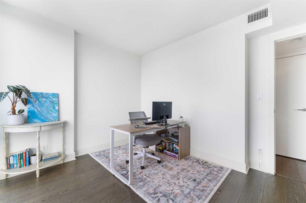 Floor-to-ceiling windows and hardwood flooring throughout enhance the natural light and elevate the space, while in-suite laundry and air conditioning add everyday comfort. Step outside through double sliding doors to your private patio — the ideal place to unwind and enjoy Calgary’s most dramatic sunsets.