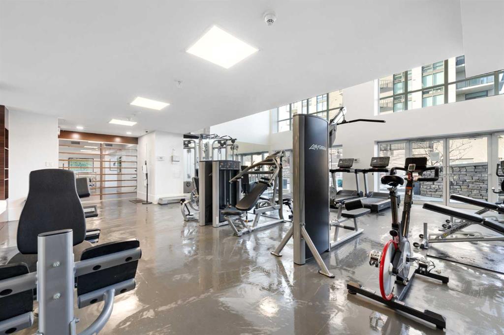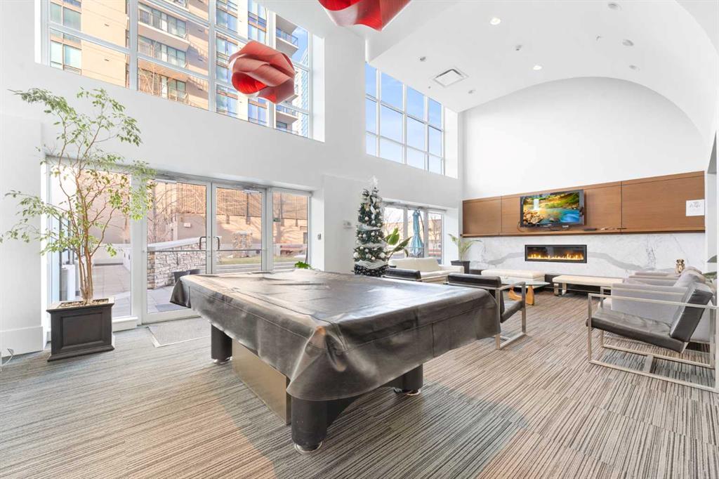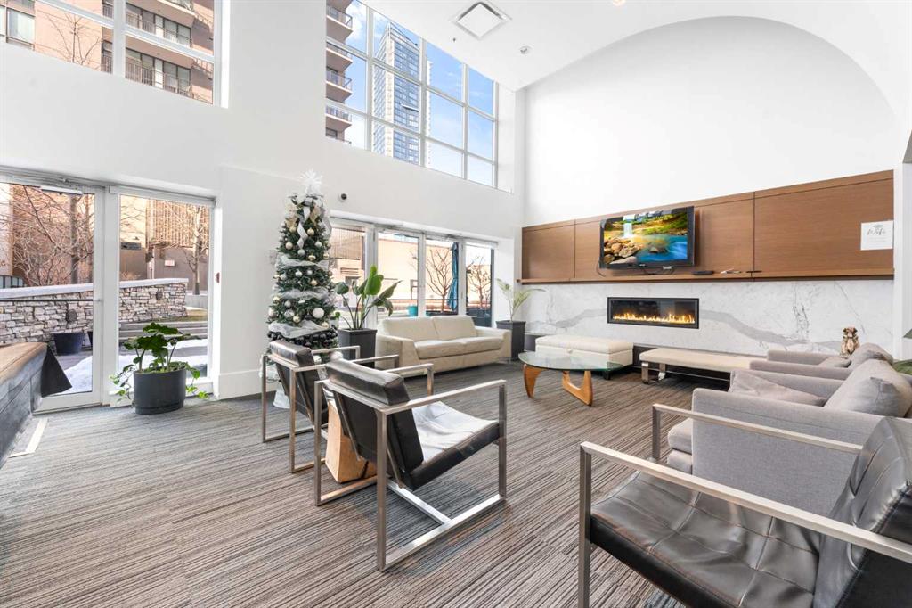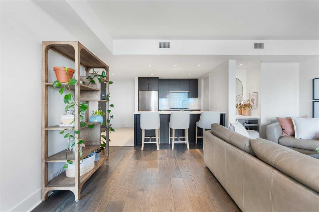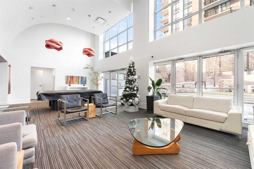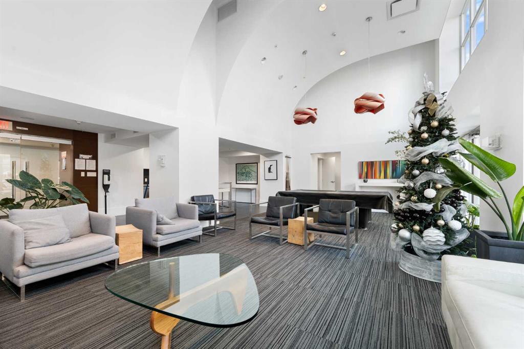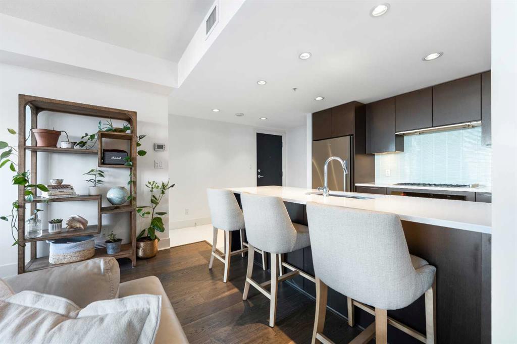 Floor-to-ceiling windows and hardwood flooring throughout enhance the natural light and elevate the space, while in-suite laundry and air conditioning add everyday comfort. Step outside through double sliding doors to your private patio — the ideal place to unwind and enjoy Calgary’s most dramatic sunsets.