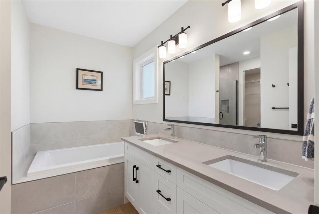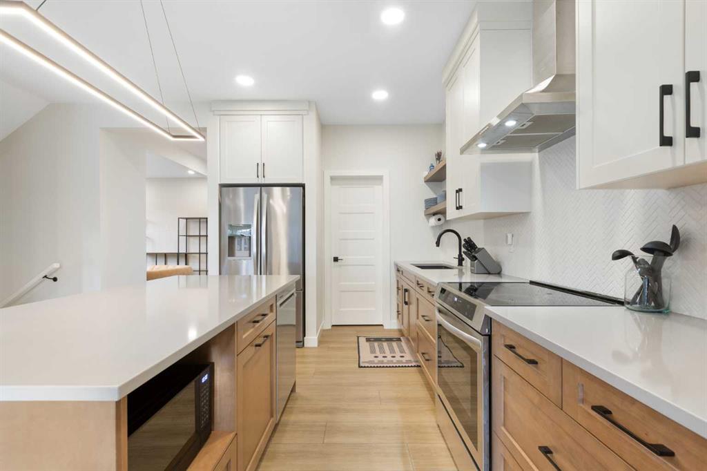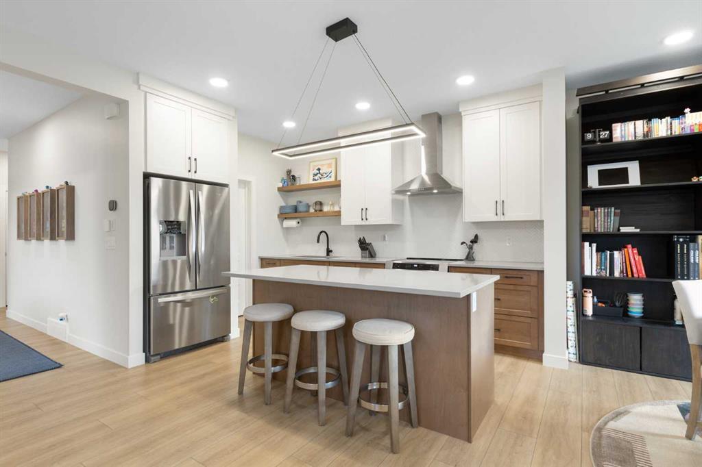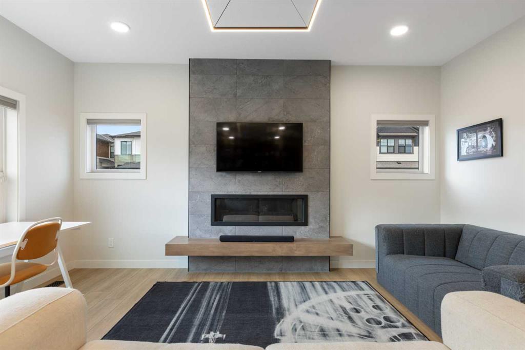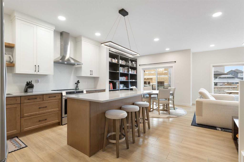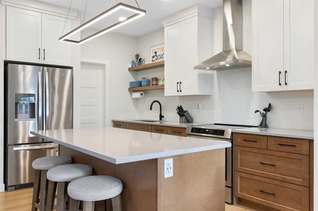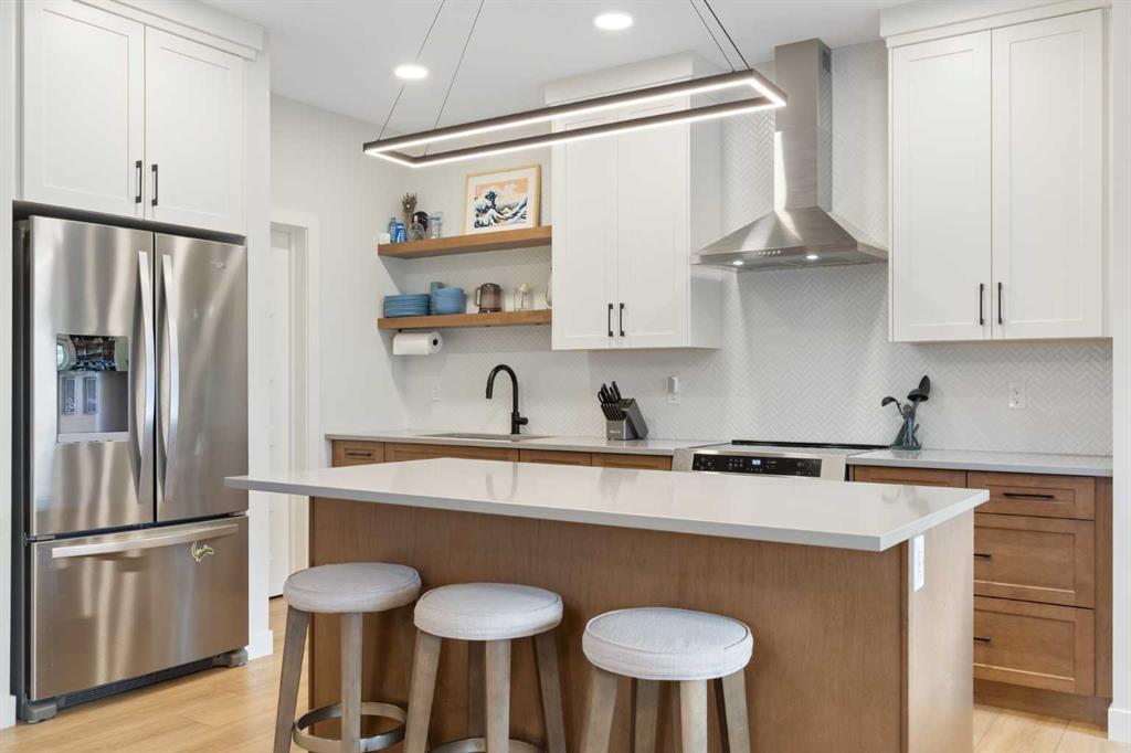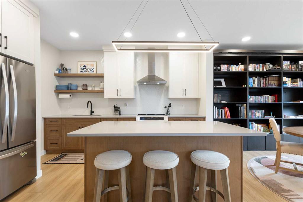 The heart of the home is a custom kitchen designed for the purist. The centrepiece is a sprawling quartz island completely unbroken by sinks or cooktops—a rare expanse of stone ready for holiday buffets, homework projects, or an elaborate charcuterie spread. The aesthetic choices here are intentional and high-contrast, playing off the sunlight that floods the space. Upstairs, the bonus room mirrors this brightness with its own south-facing glazing, offering a sun-soaked retreat perfect for a media lounge or a dedicated play area that evolves as your family grows.