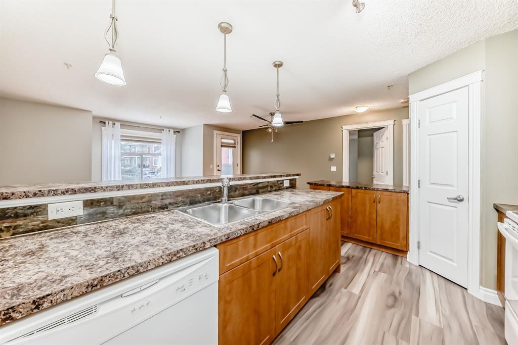 Welcome to this well-maintained southwest facing, spacious condo, offering over 1100 sq. ft. of comfortable living space. This home is great for small families, first-time buyers, or those looking to downsize. Step inside this main floor condo to find an airy, open-concept layout with a central kitchen island. This home boasts two generously sized bedrooms, including a primary suite with a large walk-in closet and a private ensuite bathroom. A second bedroom as well as a second full bathroom that adds extra convenience for guests or family. This home has in-floor heat, in-suite washer and dryer, also includes a titled heated underground parking stall and currently leasing a second out door parking stall (year by year basis). Ideally located close to parks, schools, shopping, and quick access to major routes.