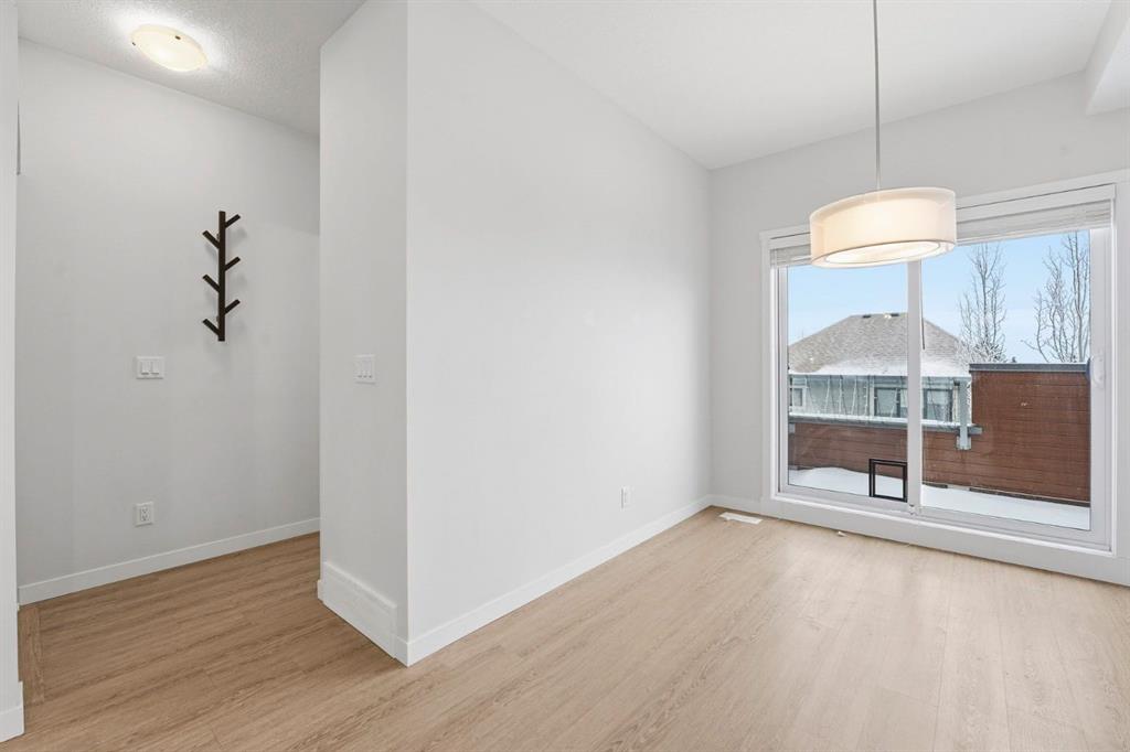 The open-concept living space is highlighted by designer finishes and upgrades throughout, including quartz countertops, upgraded cabinetry, a gas range, stainless steel appliances, durable vinyl plank flooring, and a sleek eat-up island ideal for entertaining. Eye-catching feature walls add character to both bedrooms and the dining area, while raised ensuite vanities and upper-level laundry enhance daily comfort.