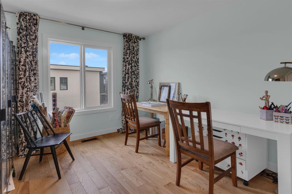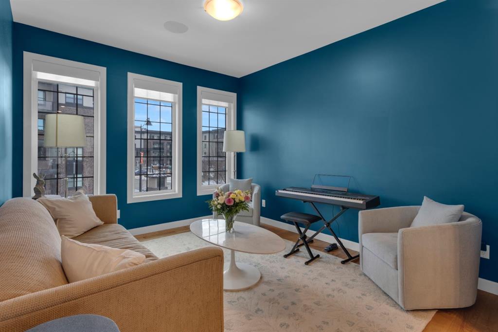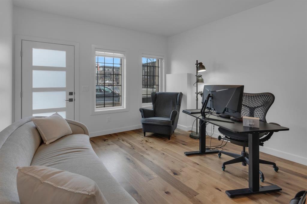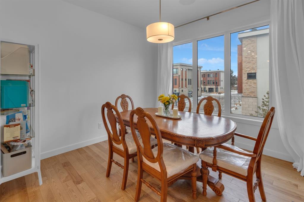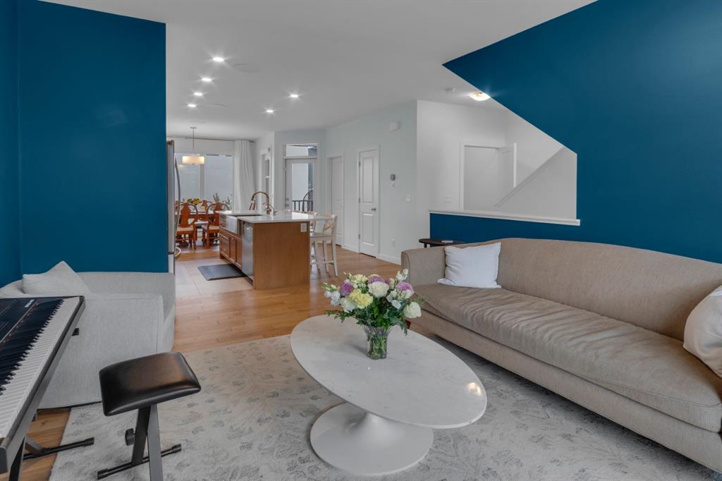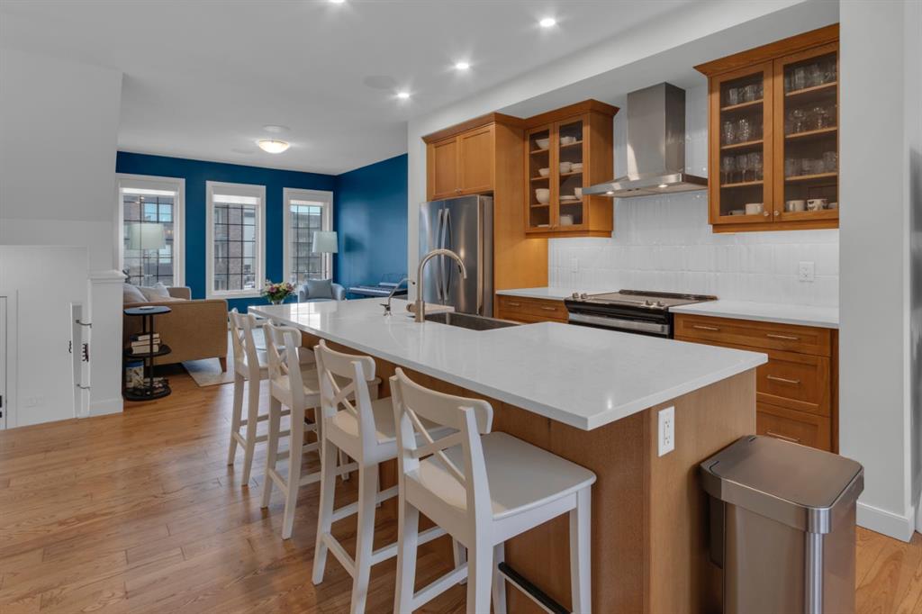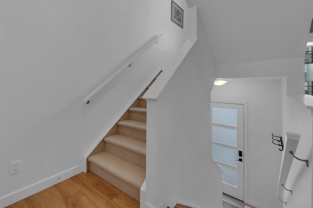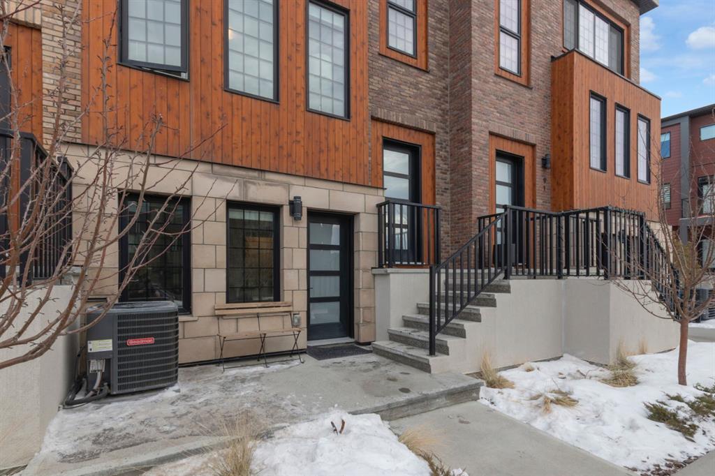 Timeless design and modern comfort come together in this beautifully finished 1,719 sq.ft. three-storey townhouse, showcasing a striking New York–inspired exterior and a thoughtfully designed interior. The lower level boasts the highly sought after double-wide attached garage option and a bright, versatile space ideal for a family room, home office, or flex area. Large windows fill the space with natural light, and engineered hardwood flooring extends throughout all three levels, creating a cohesive and refined feel. The main living area showcases a stunning kitchen that combines modern design with warmth and functionality. Wood cabinetry, quartz countertops, a farmhouse sink, white tile backsplash, and a practical mix of tile and engineered hardwood create a space ideal for both daily living and entertaining. The kitchen flows into a spacious dining area and a sun-filled living room that opens onto a large balcony, extending the living space to the outdoors. The upper level offers convenient laundry, three generously sized bedrooms, including a primary bedroom with a walk-in closet and a beautifully finished four-piece ensuite with porcelain tile flooring. With approx. $60,000 in upgrades, beyond an already high-end build, this home showcases smooth ceilings, quality craftsmanship, built-in ceiling speakers on the main level with included Sonos control system, excellent soundproofing between units, and a separate lower-level entrance. Additional features include central A/C, a 60-gallon hot water tank, a home that has never been smoked in or housed pets, and an outdoor gas line perfect for grilling. The location truly elevates this home, being close to WinSport, Calgary Farmer's Market, and Bowness Park, residents enjoy nearby trails, quick access to Kananaskis, easy downtown commuting, and a variety of shopping, restaurant, and grocery options. This neighbourhood offers the perfect balance of outdoor adventure with everyday convenience, and this home combines modern sophistication, thoughtful upgrades, and an unbeatable location to deliver a living experience that is both comfortable and inspiring.