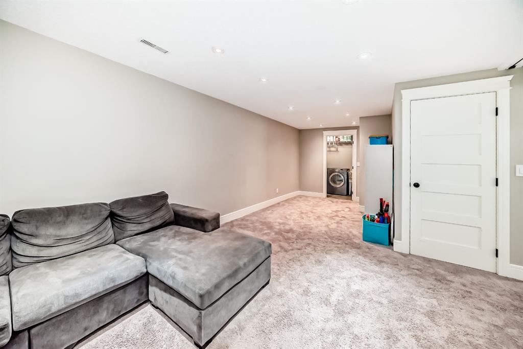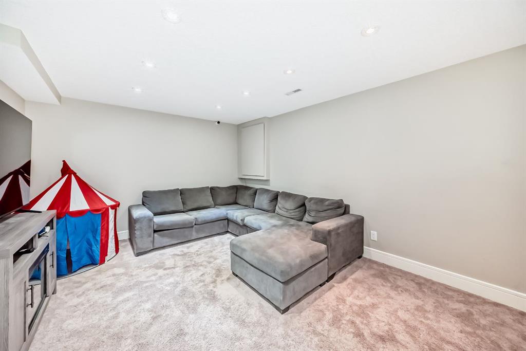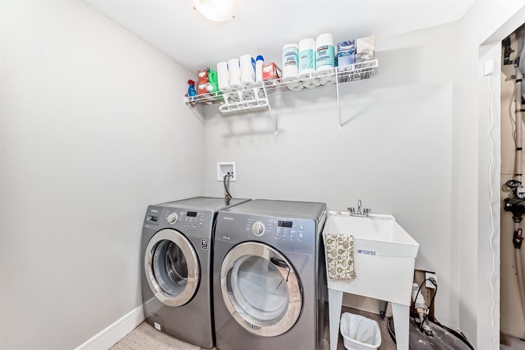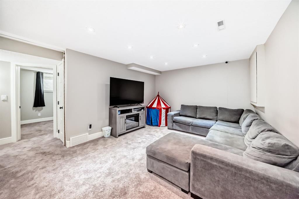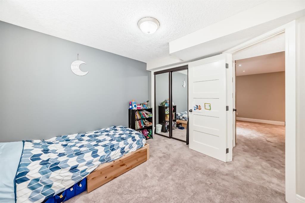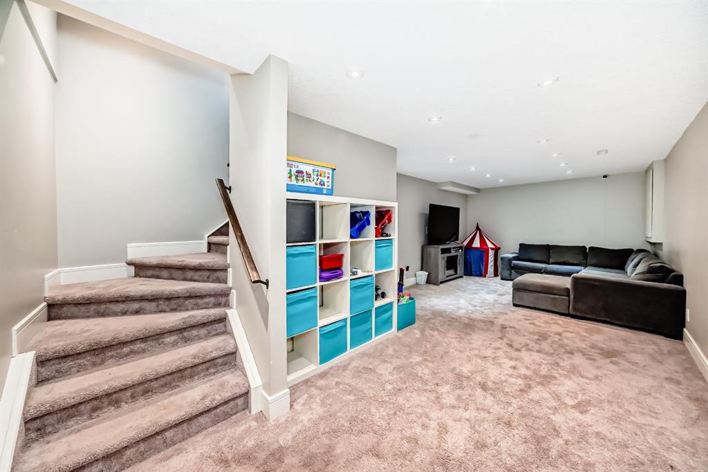 The fully finished basement provides a cozy retreat, ideal for movie nights or family gatherings. It features a welcoming family room, two large bedrooms (each with built-in storage and big south- and west-facing windows for ample natural light), a 4-piece bathroom with heated floors, and a practical laundry room with a sink—making it perfect for growing families or first-time buyers.