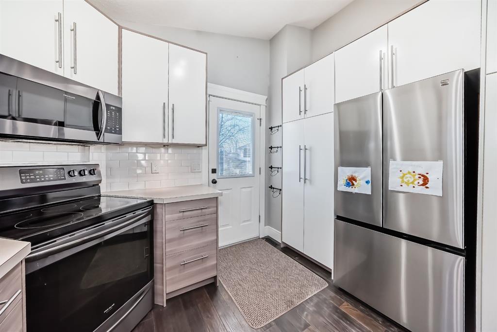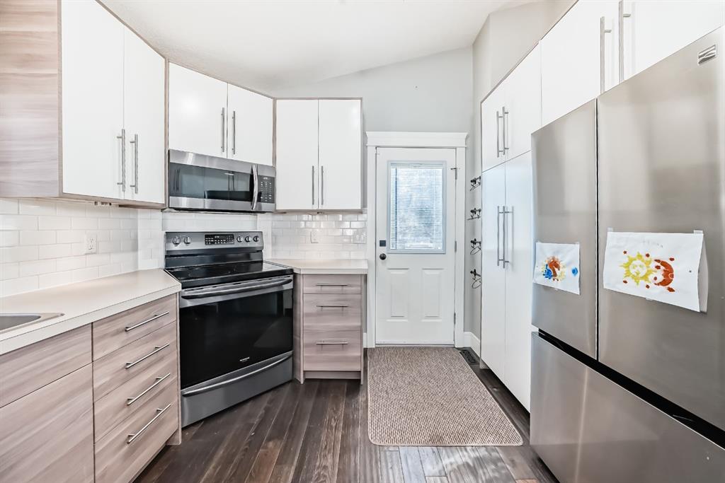 Step inside to a bright, open-concept main floor bathed in natural light from abundant windows. Vaulted ceilings, neutral tones, trendy cabinetry, and extensive built-in storage enhance the modern appeal. The spacious living room flows seamlessly into the dining area and kitchen, complete with modern appliances (including a brand-new fridge) and direct access to the south-facing back deck—perfect for effortless indoor-outdoor living.