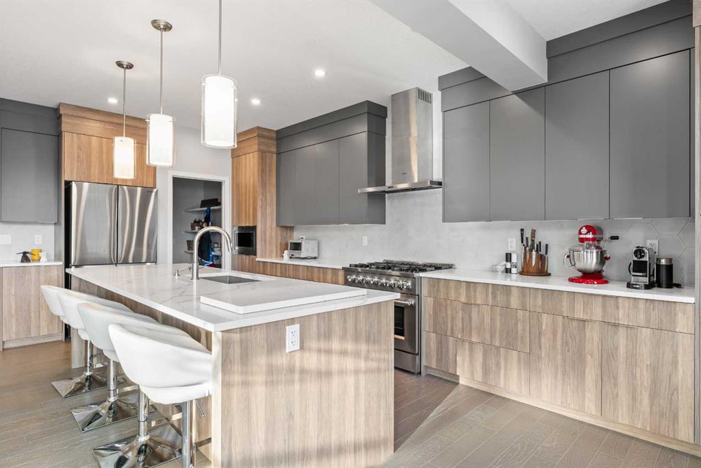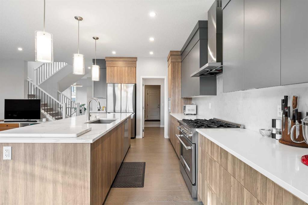 The chef-inspired kitchen offers a main-level WALKTHROUGH PANTRY, GAS STOVE with industrial hood fan, extended cabinetry, and a large centre island perfect for hosting and meal prep.
