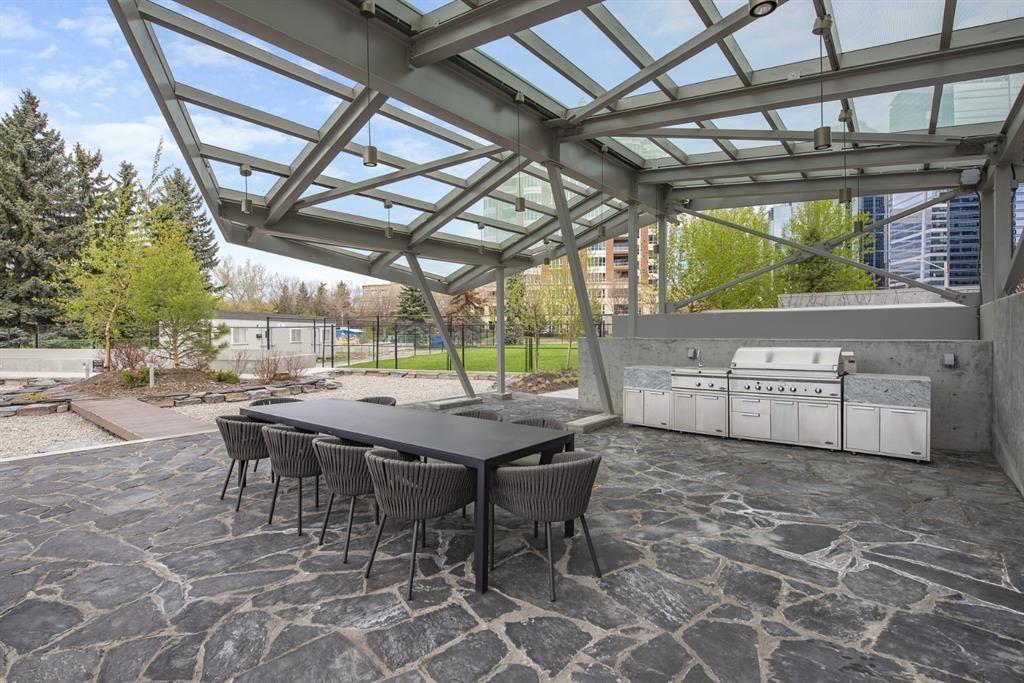 Exterior:built-in barbecue, courtyard, fire pit, garden, lighting, misting system, outdoor grill, outdoor kitchen