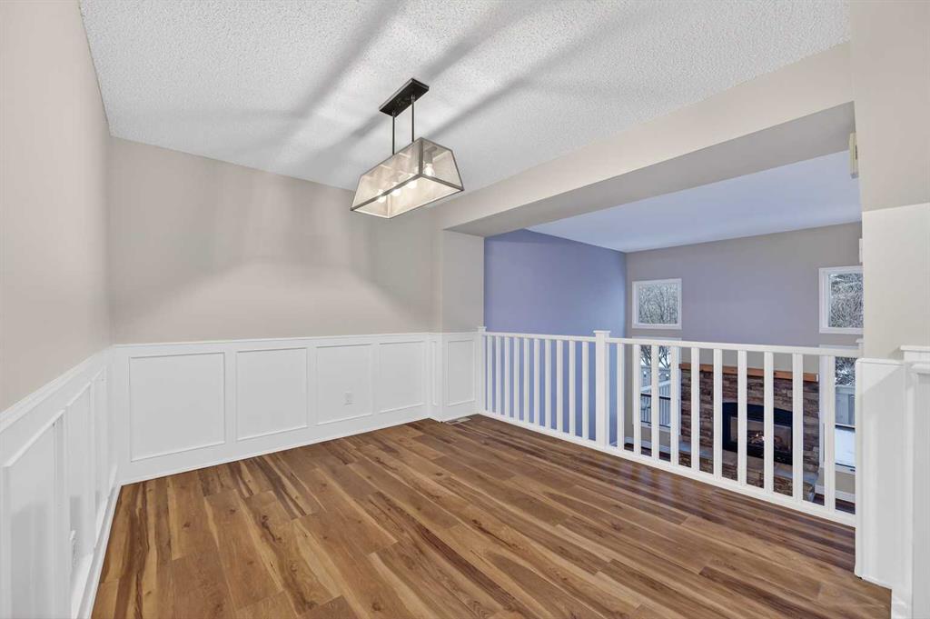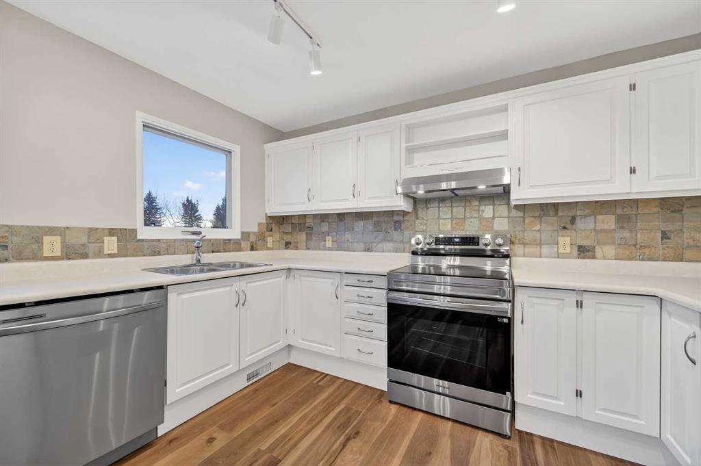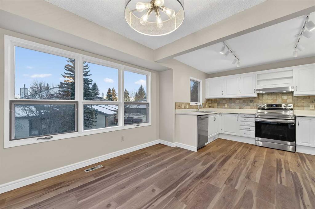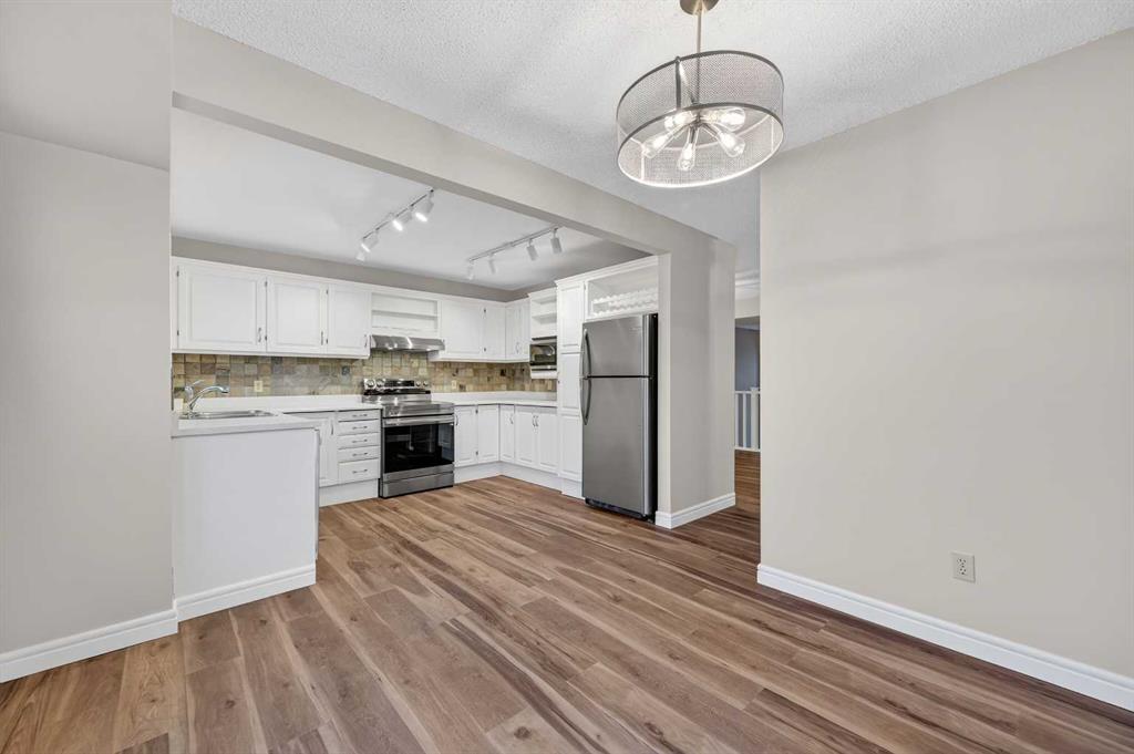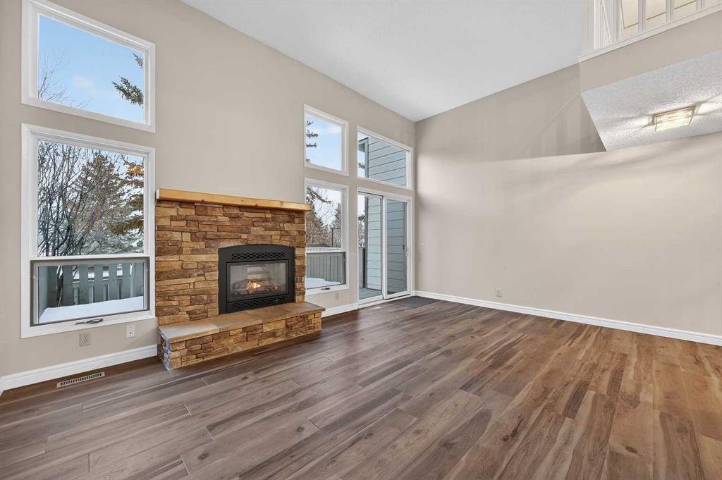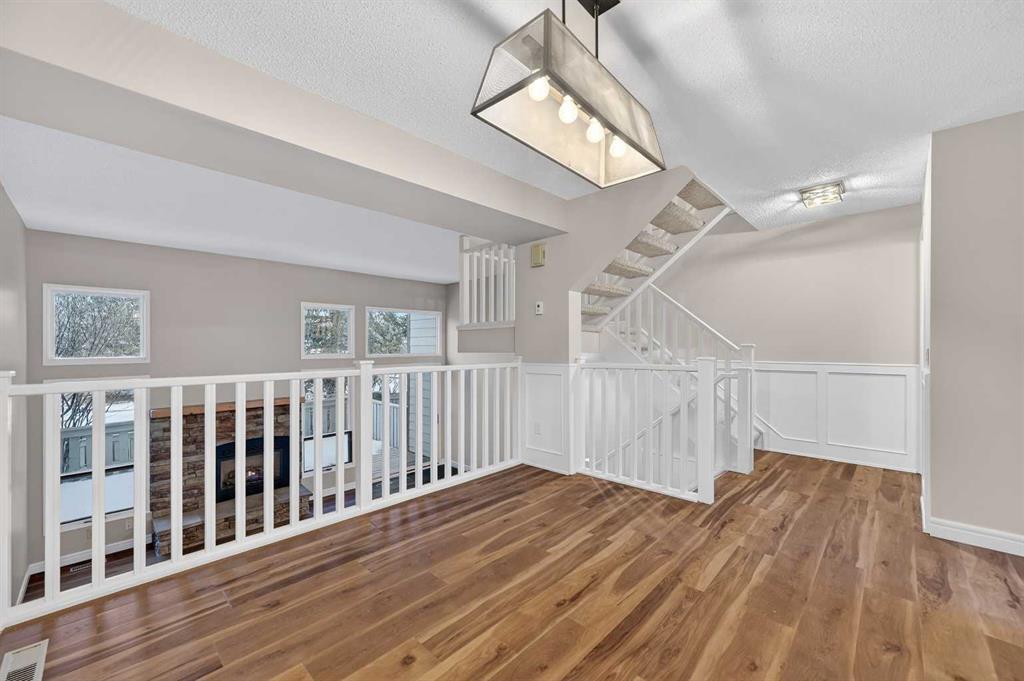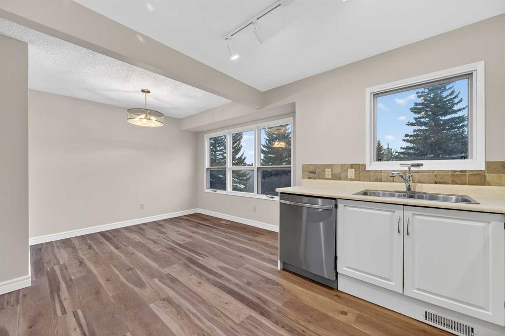 Welcome to this charming split-level townhome in the sought-after Woodlands on The Park condo community. Backing right onto the serene Fish Creek Park, this community offers the perfect blend of urban convenience and nature's tranquility – imagine morning walks along the trails or picnics just steps from your door. Step inside to over 1,600 square feet of thoughtfully designed living space that's been freshly updated and feels bright and inviting. The main level greets you with a spacious living area boasting soaring high ceilings, oversized windows that flood the room with natural light, and a cozy stone-surround gas fireplace – ideal for those chilly Alberta evenings. The new vinyl plank flooring ties everything together beautifully, while fresh paint, new baseboards, and updated lighting fixtures throughout add a modern touch. The kitchen is a real standout: roomy and airy with plenty of windows, a newly flat-painted ceiling, stainless steel appliances including a brand-new stove, dishwasher, and hood fan, plus a stylish tile backsplash. The cabinetry has been refinished in crisp white, offering tons of storage for all your cooking essentials. Right off the kitchen is a convenient breakfast nook, perfect for family meals or entertaining friends. Around the corner, you'll find a versatile loft space overlooking the living area – great for a formal dining area, home office, reading nook, or play area – and an updated two-piece bath for added convenience. Head up the open-riser staircase to the upper level, where the primary bedroom awaits. It's generously sized with his-and-hers closets and a four-piece ensuite featuring a granite countertop and tiled surround bath/shower combo. Two more good-sized bedrooms provide ample space for kids, guests, or hobbies, sharing a four-piece bathroom that's been updated with a new granite vanity, flooring, toilet, and lighting. Don't miss the large linen closet for all your storage needs. Downstairs, the unfinished basement with crawl space offers plenty of room for storage or future development – think gym, hobby room, or whatever suits your lifestyle. Outside, enjoy your private back deck for summer barbecues, and park with ease in the attached heated single garage. Plus, the complex got a big exterior makeover over the past few years! The roadways are freshly paved, new roof shingles, composite siding, eaves, soffits & downspouts. Location-wise, you're in a prime spot: steps to Fish Creek Park, walking distance to Woodbine Athletic Park for sports and recreation, Woodbine Square Shopping Mall for all your shopping and dining needs, and both Woodlands School and Woodbine School for families. Plus, it's just a short drive to Anderson Road and Stoney Trail, making commutes a breeze.