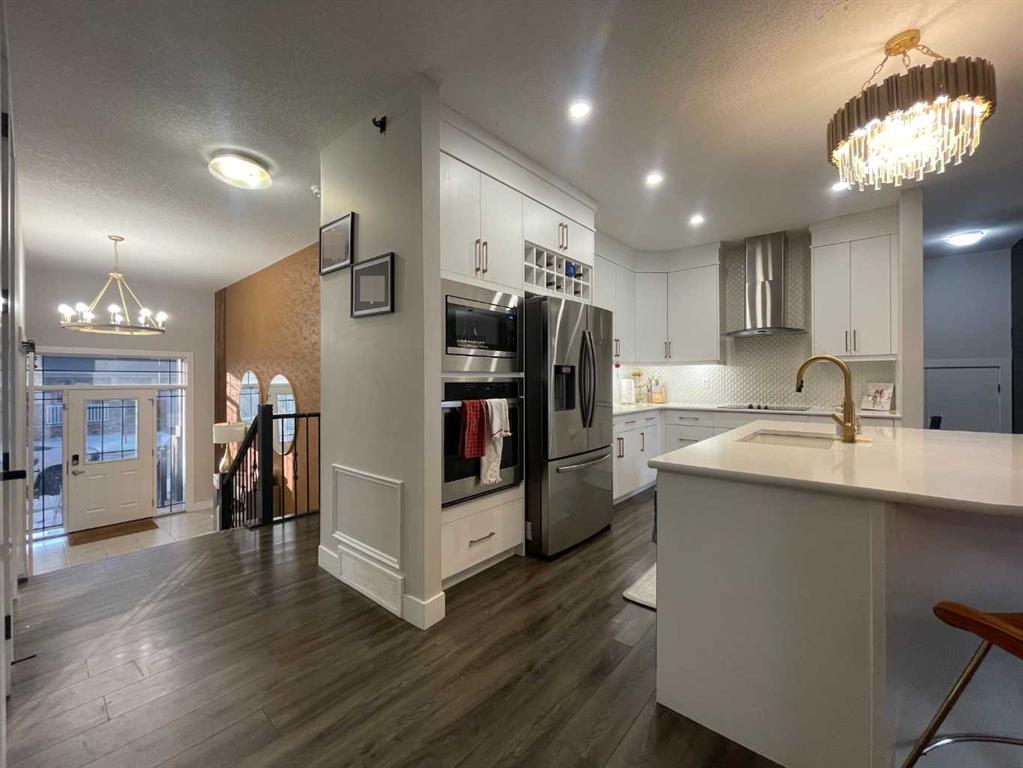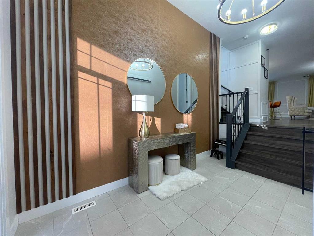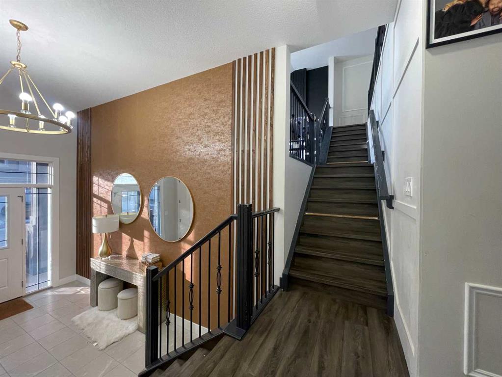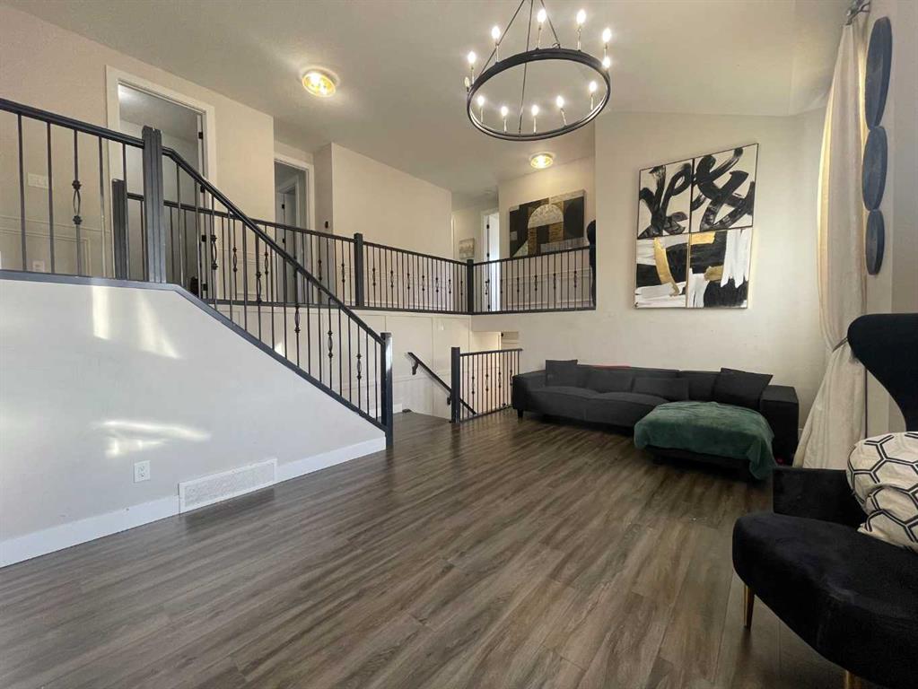 Ready for some finishing touches this architecturally distinctive home offers nearly 3,000 sq ft of developed living space in a prime NW Calgary location. Complete with a private side entrance to the unfinished basement. The main floor features soaring ceilings, wrought iron railings, wood panel accents, and a mix of laminate and tile flooring. The open-concept layout connects the kitchen, dining, and family room, creating a functional space ideal for everyday living and entertaining. Large windows bring in natural light, complemented by a feature wall and floor-to-ceiling tiled fireplace.