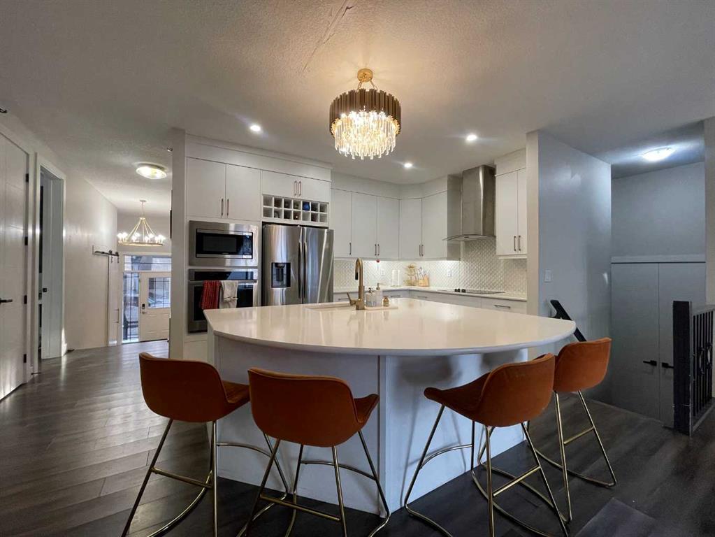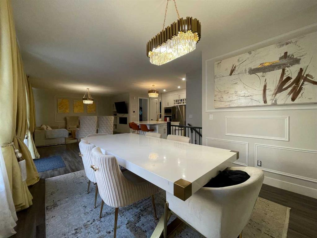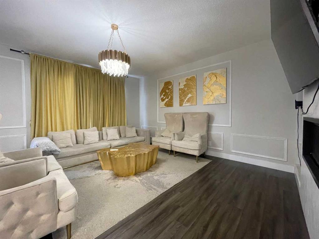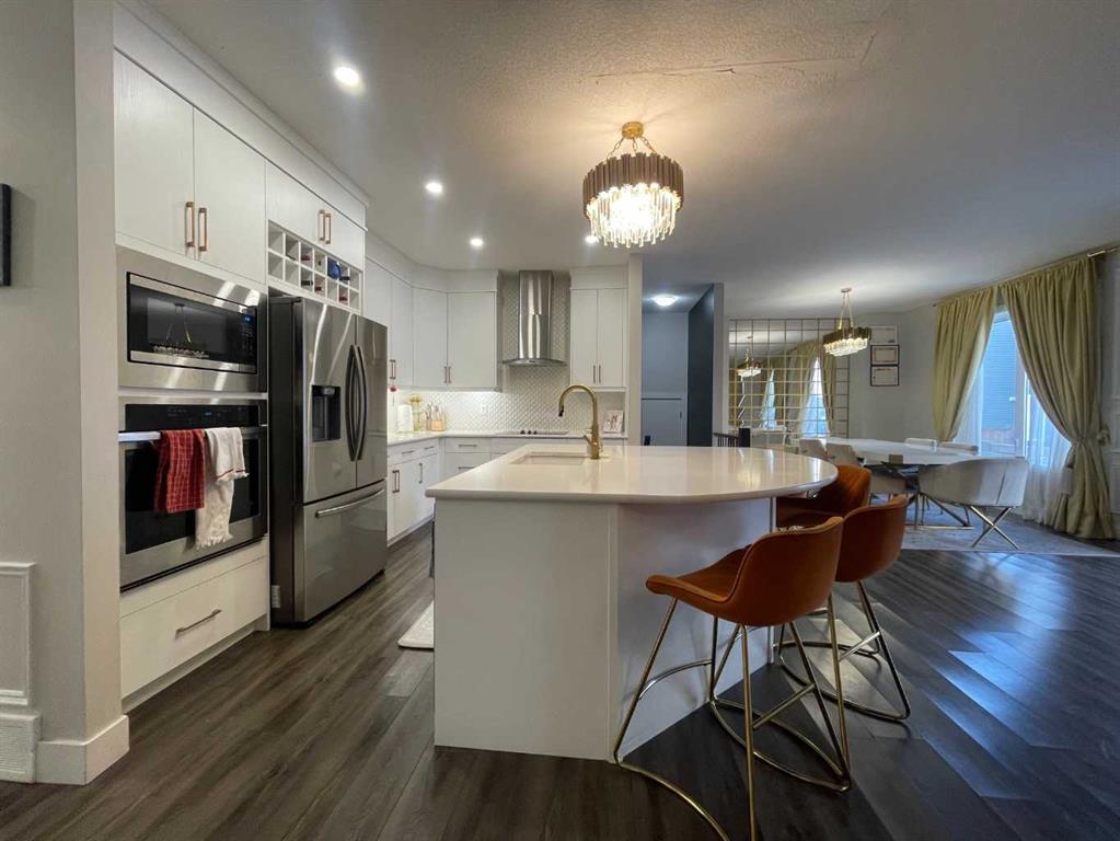 Ready for some finishing touches this architecturally distinctive home offers nearly 3,000 sq ft of developed living space in a prime NW Calgary location. Complete with a private side entrance to the unfinished basement. The main floor features soaring ceilings, wrought iron railings, wood panel accents, and a mix of laminate and tile flooring. The open-concept layout connects the kitchen, dining, and family room, creating a functional space ideal for everyday living and entertaining. Large windows bring in natural light, complemented by a feature wall and floor-to-ceiling tiled fireplace.