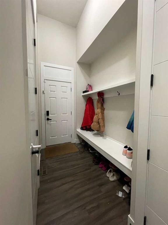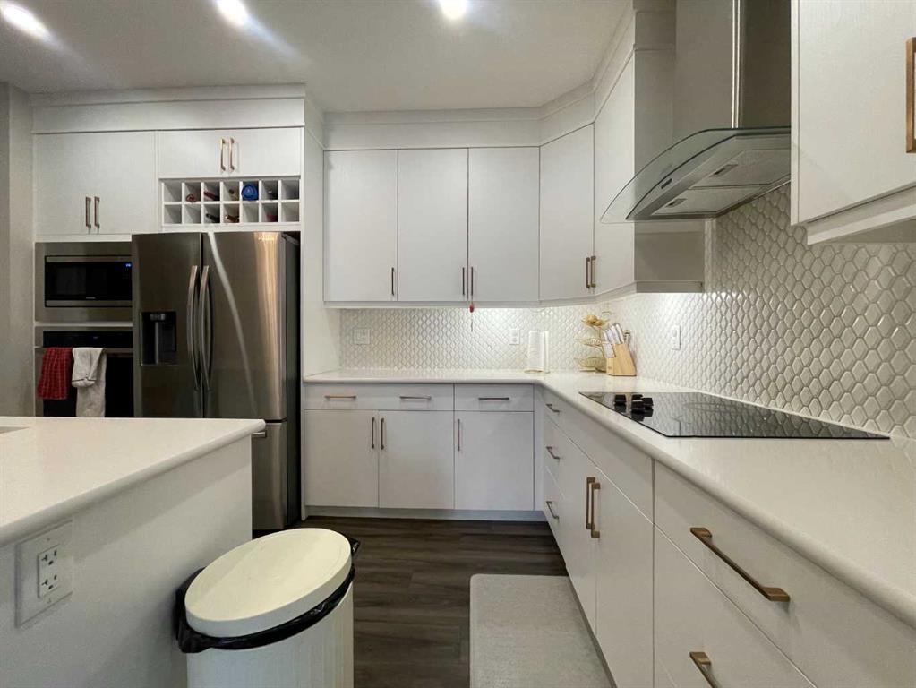 The kitchen is well-appointed with a large quartz island, under-cabinet lighting, tile backsplash, ceiling-height cabinetry, brass hardware, bespoke lighting, and a full stainless steel appliance package including double-door fridge, glass cook top, hood fan, built-in microwave & oven, and dishwasher. Thoughtfully designed built-ins and open shelving and walk in pantry, provide practical storage with clean presentation. The main floor is completed by a half bath and a mudroom with added storage connecting you to the double attached garage.