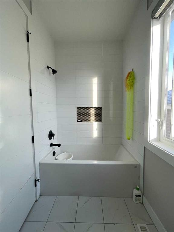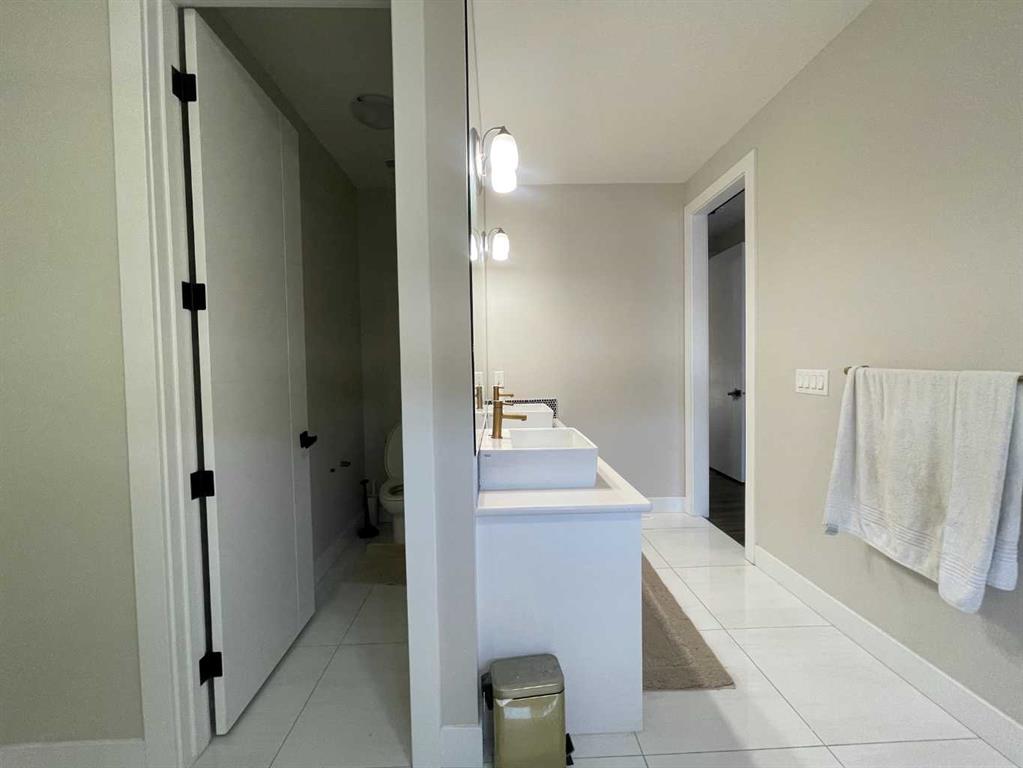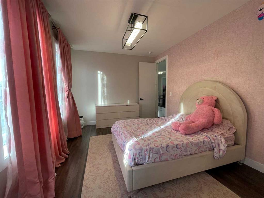 Upstairs, the bonus room stands out with vaulted ceilings, large windows, and continued wood accent detailing. The upper level includes four bedrooms, laundry, and two full bathrooms. The primary bedroom offers a walk-in closet and a spa-inspired ensuite with double quartz vanity, tiled walk-in shower, freestanding tub, and private toilet room. The secondary full bath also features a double vanity.