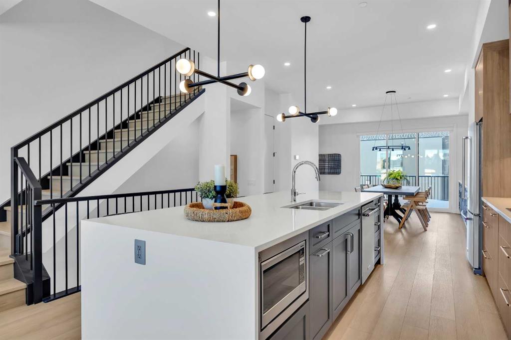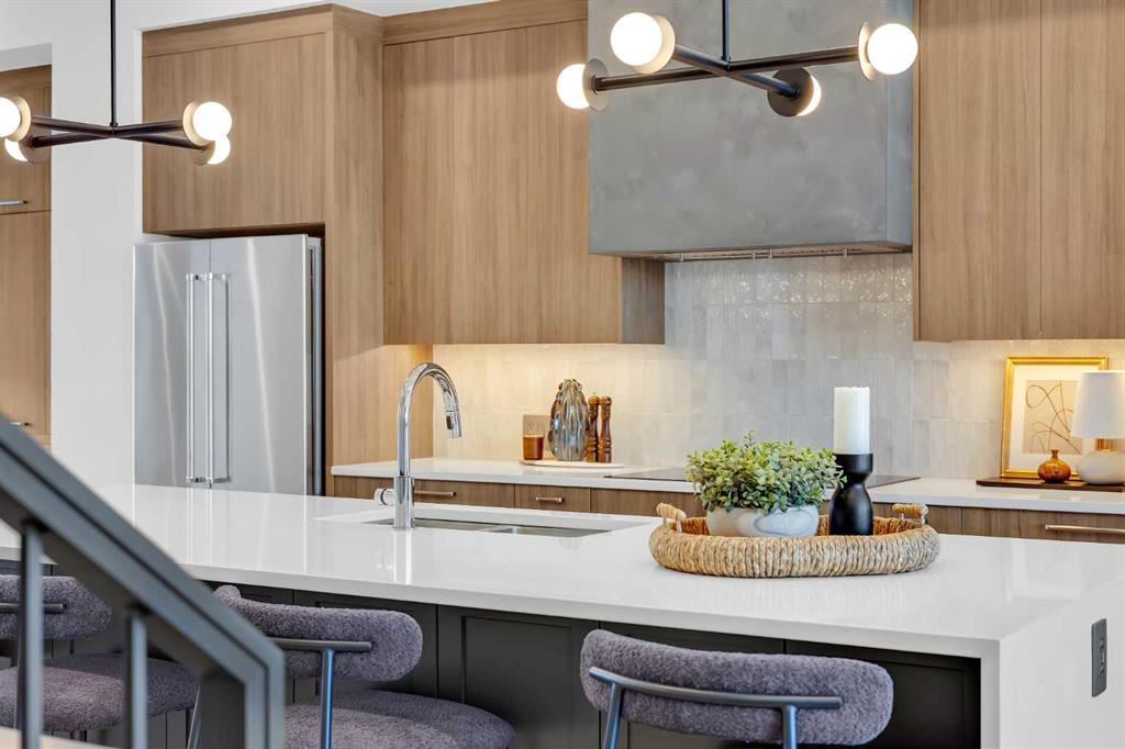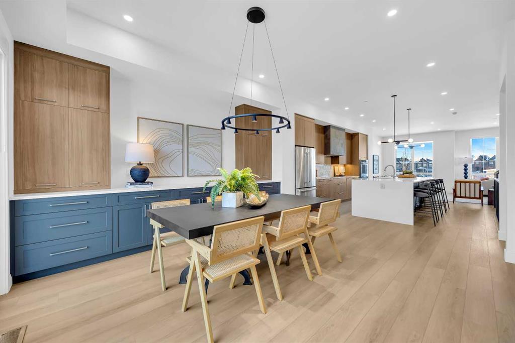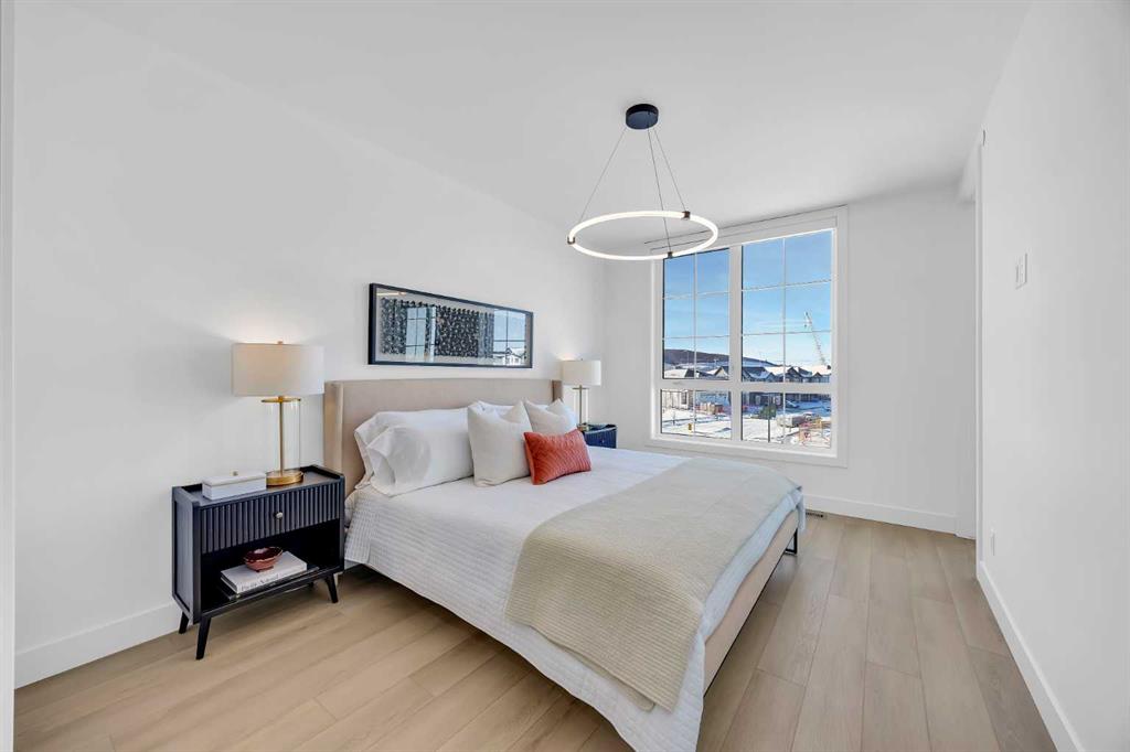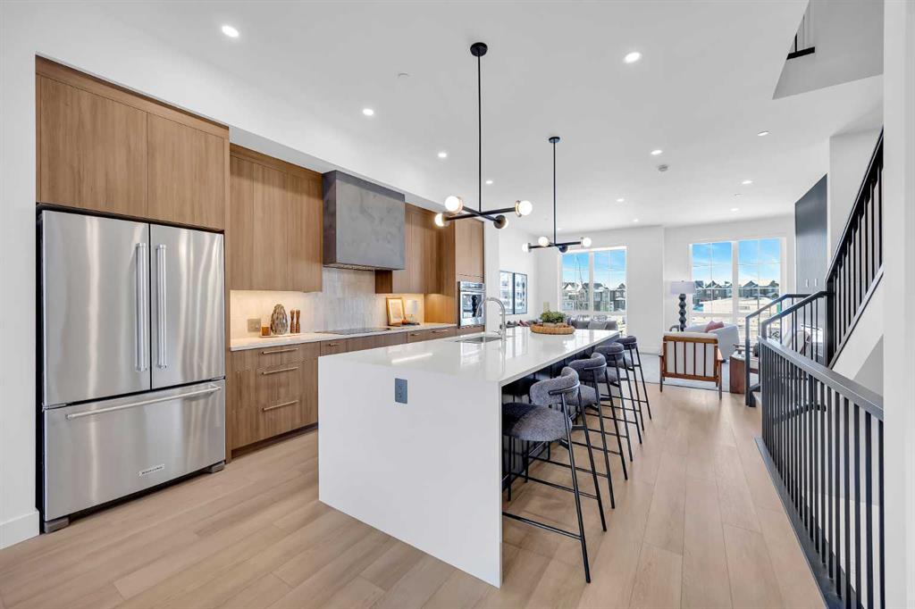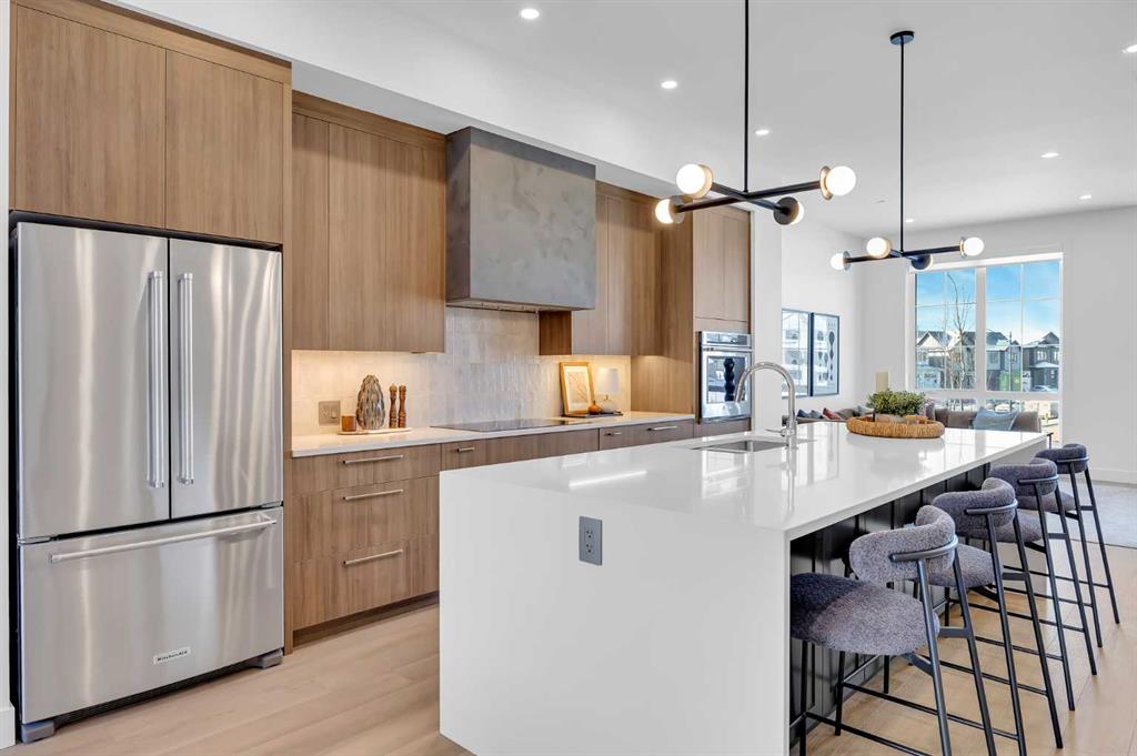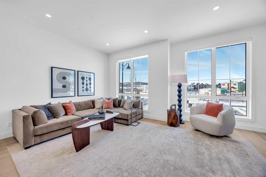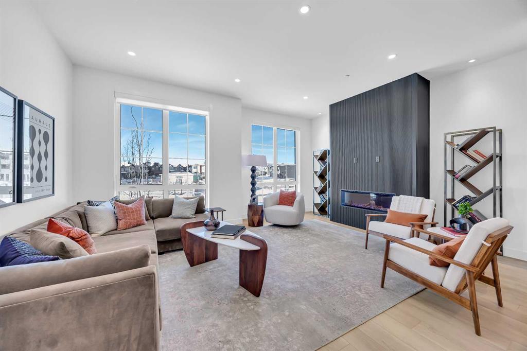 Welcome to 12 Greenwich Heath NW, the Carrara model by Partners, a distinctive four-storey Modern Brownstone directly fronting the canal in the northwest community of Upper Greenwich. Offering a rare combination of architectural presence, refined interiors, and an exceptional waterfront setting, this no-condo-fee residence stands apart within Calgary’s luxury townhome market. The exterior reflects classic brownstone architecture, while the interior has been professionally curated with elevated finish selections throughout. The home features a private four-storey elevator, rooftop patio, and an oversized heated rear-attached double garage, providing comfort, convenience, and long-term versatility for a range of discerning buyers. The entry level begins with an expansive foyer and includes a flexible office or bedroom, a full bathroom, and a mudroom with custom built-ins. Direct access to the heated garage adds everyday practicality. The main living level offers 10’ ceilings and oversized windows that frame canal views and fill the home with natural light. The kitchen is thoughtfully designed with a custom plaster hood fan and an oversized waterfall-edge quartz island. Built-in dining cabinetry adds both function and visual cohesion, while the living room is anchored by a statement fireplace. A rear deck with enclosed storage extends the living space outdoors. A powder room with floating vanity and under-cabinet lighting completes this level. The third floor is dedicated to the private sleeping quarters. The primary suite features a well-appointed ensuite with fully tiled glass shower, freestanding soaker tub, and dual vanities. Two additional bedrooms share a full bathroom finished to the same standard. A laundry room with built-in cabinetry, sink, and quartz countertops adds everyday convenience. The top floor is designed as an elevated entertaining space, complete with a wet bar and beverage fridge. From here, step onto the private rooftop patio with hot tub rough-in and open views toward the canal and surrounding community. Additional features include air conditioning, a full blinds package, and modern mechanical systems designed for comfort and efficiency. Upper Greenwich has been thoughtfully planned to offer a strong sense of character, walkability, and connection to green space. Residents enjoy immediate access to the canal and pathways, proximity to the Bow River pathway system, Calgary Farmers’ Market West, nearby shops and restaurants, sports courts, playgrounds, and WinSport. With convenient access to downtown Calgary and the Rocky Mountains, the location offers a rare balance of urban convenience and natural surroundings. This is a rare opportunity to own a canal-front brownstone offering architectural distinction, refined interiors, and an exceptional setting in one of Calgary’s most distinctive communities.
