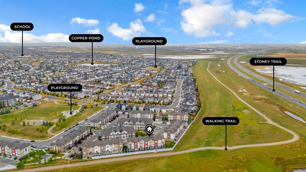 Welcome to this beautifully maintained townhome offering exceptional space and comfort in the desirable community of Copperfield situated on a walkout lot backing onto green space and walking trails! Featuring 3 bedrooms and 2.5 bathrooms, this home is perfect for families or anyone looking for a stylish and functional layout. The bright, open main level includes a welcoming foyer with access to the garage and a versatile walkout flex room. The second floor boasts an open-concept design with a spacious living room, dining area, pantry, 2 piece washroom and a beautifully upgraded kitchen complete with modern cabinetry, stainless steel appliances, and a large centre island perfect for entertaining. Off the dining room, step onto your private balcony that backs directly onto a walking trail and green space, offering peace and privacy. The upper floor features a generous primary bedroom with a 3 piece ensuite, along with two additional bedrooms and a full bathroom. Enjoy the convenience of a single attached garage plus driveway, giving you ample parking and storage. With its ideal location backing onto serene pathways and green space, this home offers both tranquility and accessibility. Located in a family-friendly community with nearby schools, parks, shopping, and easy access to Stoney Trail and Deerfoot, this move-in ready home is the perfect blend of comfort and convenience!