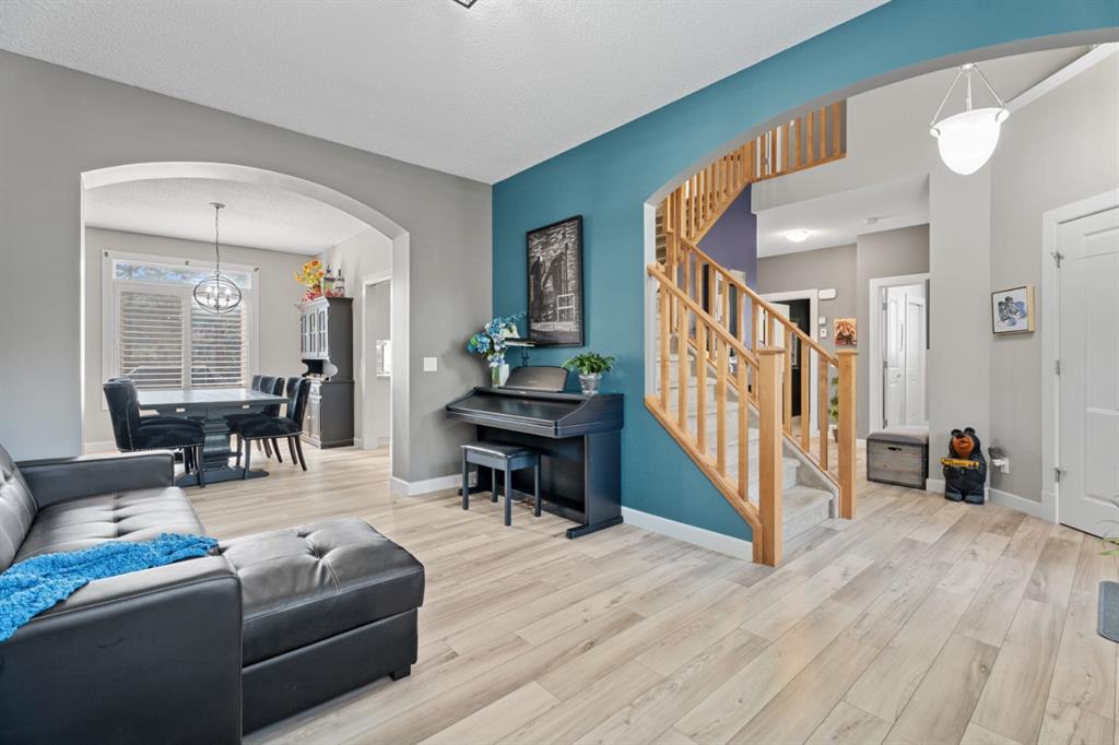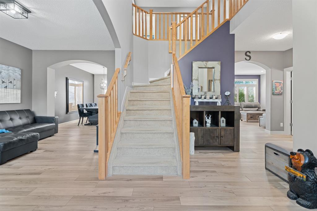 It’s rare to find a home that offers five true bedrooms upstairs, including a tucked away room currently used as a private office that can easily function as a bedroom-a layout that’s perfect for growing families, guests, or multi-generational living. Welcome to this warm and inviting family home in Drake Landing, thoughtfully designed for both everyday living and entertaining. Step into the bright foyer with open to below ceilings that create an airy, welcoming first impression. The renovated kitchen is a true showstopper, featuring white cabinetry, quartz countertops, a stylish tile backsplash, and a corner pantry for added storage. The sunny breakfast nook is ideal for casual meals, while the adjoining living room with a cozy gas fireplace sets the stage for family gatherings. A large formal dining room and a second main floor living space provide flexibility for entertaining, working from home, or relaxing. California shutters throughout the main floor add a touch of elegance, while the mudroom with access to the double attached garage keeps busy family life organized. Upstairs the four bedroom layout truly shines. The spacious primary suite offers a walk in closet and ensuite with soaker tub and shower. Three additional generous bedrooms, plus convenient upper level laundry, make this level as practical as it is comfortable.