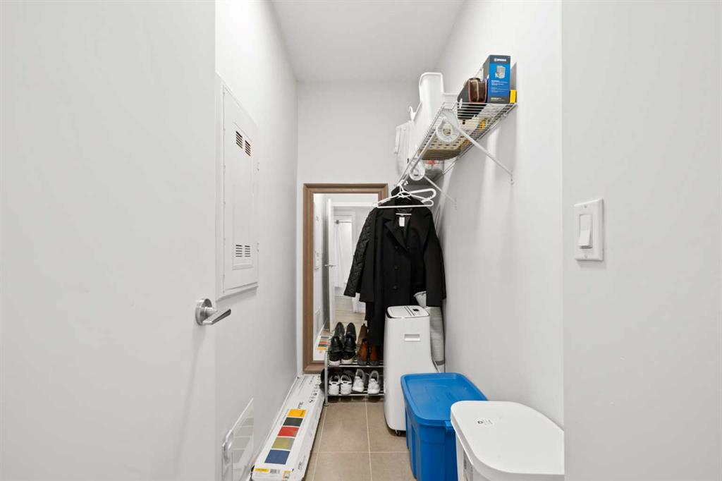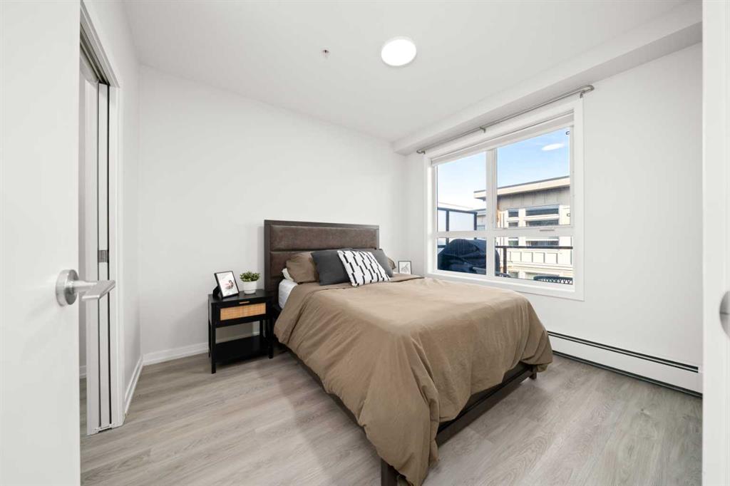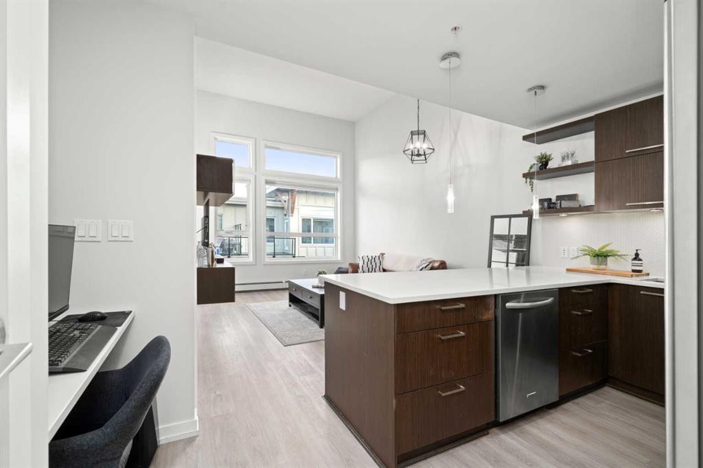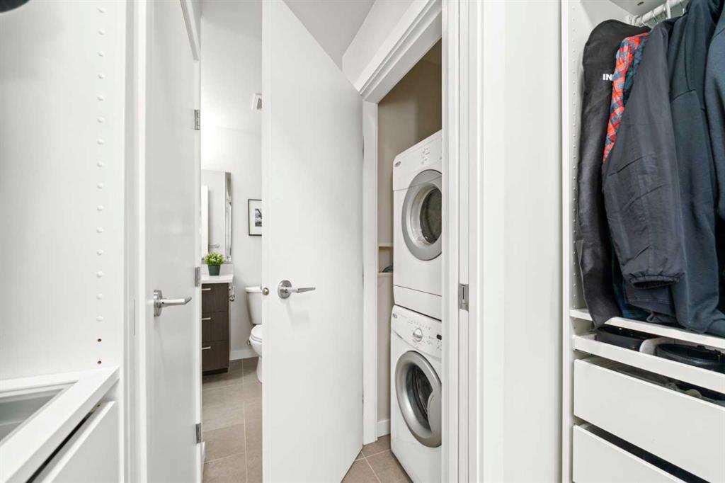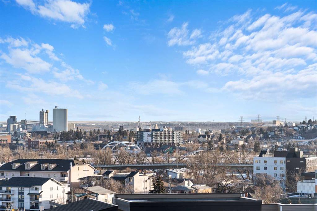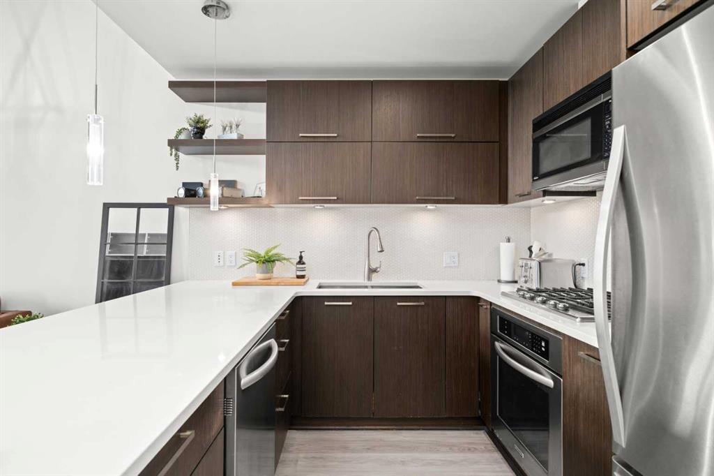 Located on the top floor of the NEXT building, this bright and stylish 1-bedroom home is defined by soaring 13-foot ceilings and an abundance of natural light that immediately sets it apart. Recently painted and refreshed, the unit is move-in ready and thoughtfully designed for both comfort and functionality, featuring an open-concept layout anchored by a sleek kitchen with stainless steel appliances including a built-in oven and gas cooktop, quartz countertops, a functional eating bar, and generous cabinetry for smart storage. Luxury vinyl plank flooring throughout offers a clean, modern look while being exceptionally durable and low maintenance. The living and dining areas feel open and inviting, enhanced by the dramatic ceiling height and custom entertainment built-ins—ideal for entertaining or unwinding at the end of the day—while the private, sun-filled balcony with BBQ gas hookup is perfect for summer evenings. The spacious bedroom connects seamlessly to a walk-in closet and 4-piece cheater ensuite, complemented by in-suite laundry with a front-load washer and dryer. Storage is well covered with an in-suite storage room, assigned storage locker, and a titled underground parking stall. Residents enjoy excellent building amenities including a fully equipped fitness centre, secure bike storage, car wash, and pet wash station. Just minutes from downtown and steps from transit, this location offers easy access to the restaurants, cafés, and shops along Edmonton Trail and Centre Street, with the charm and energy of Bridgeland nearby, plus river pathways, parks, and everyday amenities all within easy reach—making this an excellent opportunity for downtown professionals.